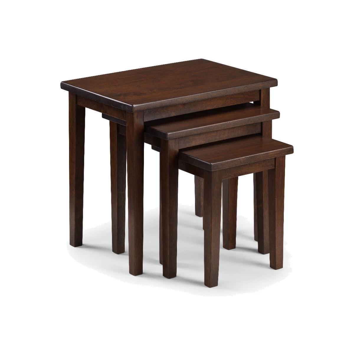 The Cleo Nest of Tables with deep mahogany finish is a stylish way of adding functional surface space to your home. Simply elegant, this versatile set of three tables provides a space-saving and practical addition to any modern home. Ideal for homes where there’s a need for space-saving solutions, these tables slot away under each other with ease. Made from strong and durable rubberwood Finished in an intense mahogany stain Three tables slot easily together when not in use Simple, clean lines ideal for many styles of interior