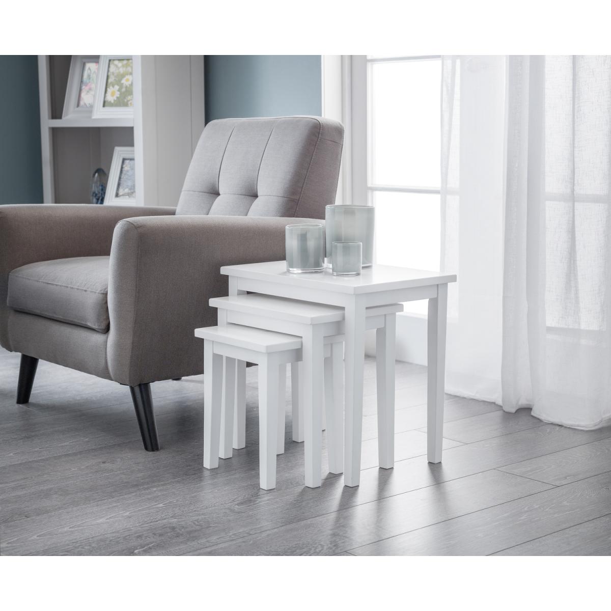 I love this set of nest tables for their clean, versatile look that can suit a range of interiors, from modern minimalism to classic schemes. The pure white finish makes them perfect for brightening up smaller spaces or acting as a neutral backdrop in more layered settings. Practical tips include using these as side tables in the living room, stacking them to save space, or even as a small workspace or display surface. They work particularly well in cosy corners or alongside neutral furnishings, but can also be styled with colourful accessories, plants, or decorative lamps to add personality. Their straightforward design and neutral colour make them highly adaptable, providing both function and a touch of understated style.