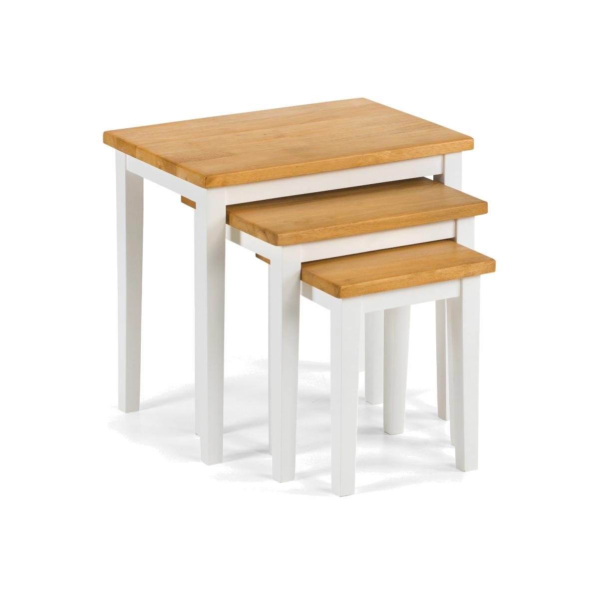 The Cleo Nest of Tables finished in a two-tone white and natural oak finish is elegant, versatile and a wonderful addition to home. A practical choice wherever they’re positioned, the three tables easily nestle together when not in use and provide functional additional table space when required. The contrast of bright white and natural oak works wonderfully in many modern homes. Three versatile nesting tables Constructed from durable rubberwood White frame teamed with light oak stained tabletop Versatile and timeless home for many modern homes