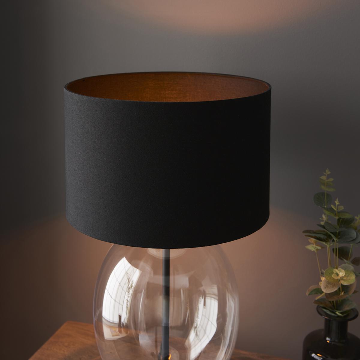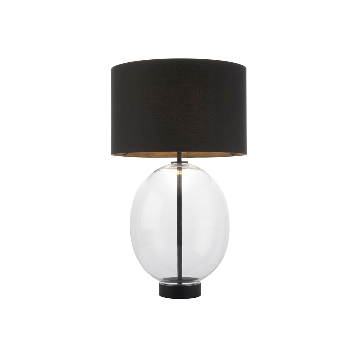This boutique hotel style lamp is designed to infuse your home with the sophistication and allure of a five-star retreat, featuring a unique oval glass lamp base and a simplistic black fabric shade that offers a soft glow.