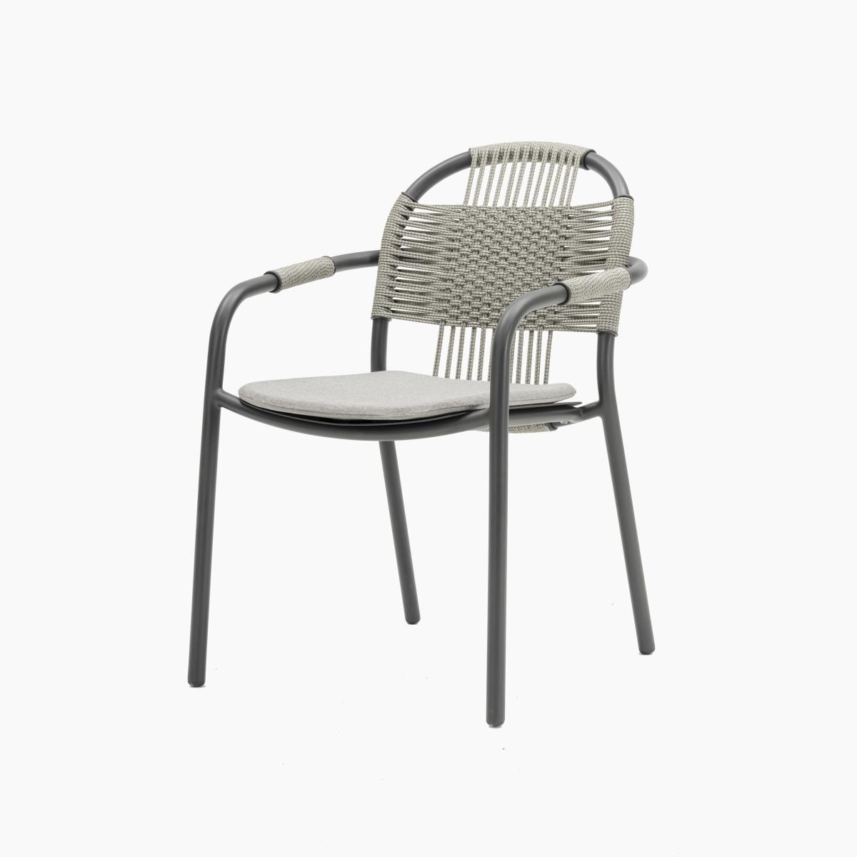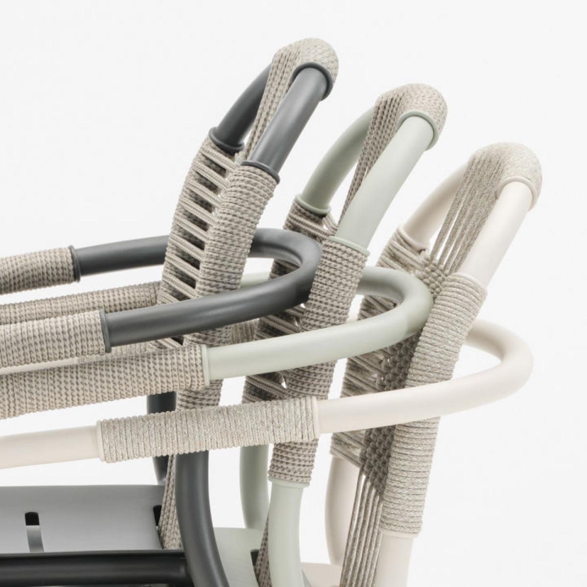 Cleo is an outdoor dining chair with a lightweight and stackable design, available in three combinations of gorgeous colours. The slender profile of Cleo is composed of two sections made with heat-lacquered aluminium. One of these sections forms the arch of the backrest, while the other section stretches around the backrest to become the armrest. A woven polypropylene rope creates the chair's characteristic backrest, while it is also used around the armrests for additional comfort. Airy and graphic, the openwork backrest adds a wonderful lightness to the visual finish. Cleo offers an unexpected alliance between the design minimalism of its metal structure and the artisan warmth of its hand-braided rope. This rope is weather- and UV-resistant. The ropework forms a flexible, comfortable, ergonomic seat that adapts to the shape of the body. Lightweight and stackable, the Cleo dining chair combines design with functionality. Synonymous with exceptional seating comfort, high quality and durable materials, Vincent Sheppard furniture places craftsmanship at the heart of its DNA. Each Vincent Sheppard piece of furniture is handcrafted in Indonesia by the most highly qualified craftsmen. The knowledge and skills of local artisans elevate these creations to the rank of works of art. The Vincent Sheppard brand guarantees good working conditions and fair pay for all of its employees. Care : To clean stains from the rope, we suggest using soapy water in a spray bottle, then wipe with a soft cloth. Sponge off any excess humidity and leave to air-dry.