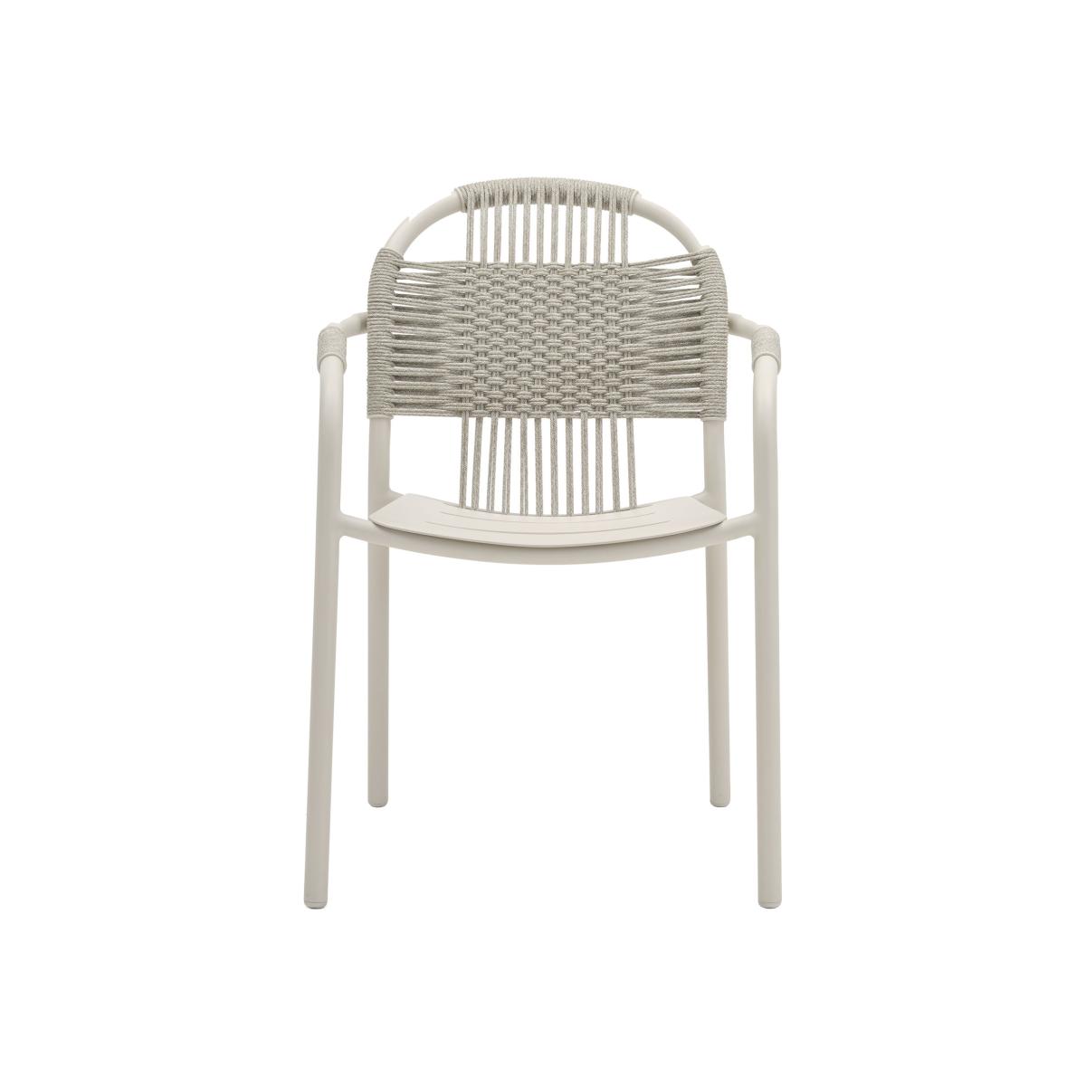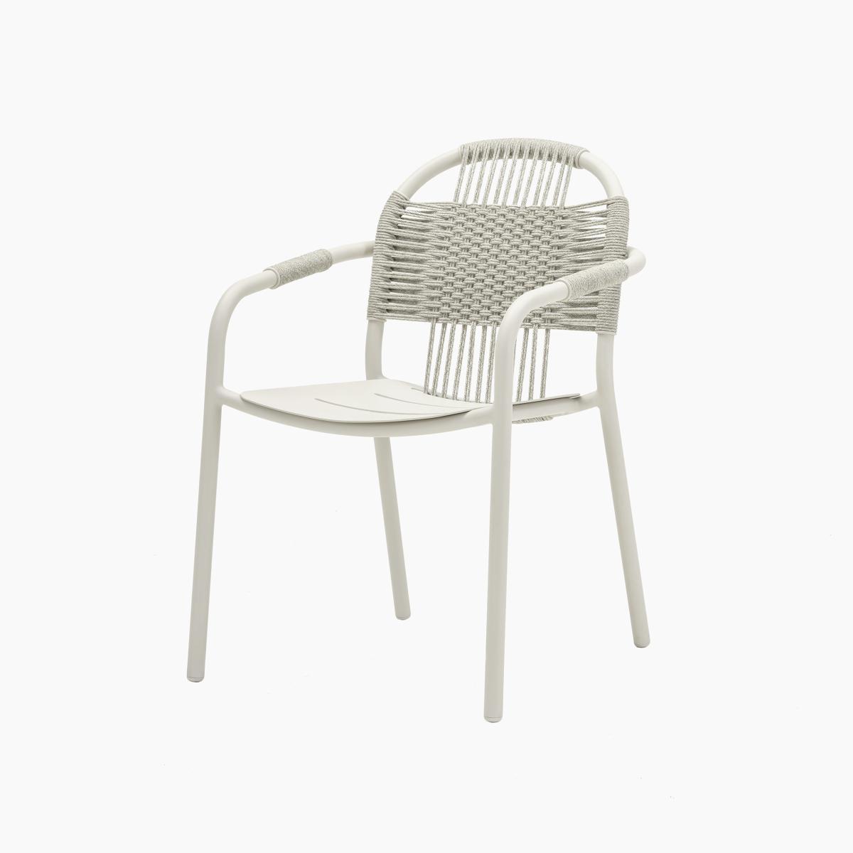 Cleo is an outdoor dining chair with a lightweight and stackable design, available in three combinations of gorgeous colours. The slender profile of Cleo is composed of two sections made with heat-lacquered aluminium. One of these sections forms the arch of the backrest, while the other section stretches around the backrest to become the armrest. A woven polypropylene rope creates the chair's characteristic backrest, while it is also used around the armrests for additional comfort. Airy and graphic, the openwork backrest adds a wonderful lightness to the visual finish. Cleo offers an unexpected alliance between the design minimalism of its metal structure and the artisan warmth of its hand-braided rope. This rope is weather- and UV-resistant. The ropework forms a flexible, comfortable, ergonomic seat that adapts to the shape of the body. Lightweight and stackable, the Cleo dining chair combines design with functionality. Synonymous with exceptional seating comfort, high quality and durable materials, Vincent Sheppard furniture places craftsmanship at the heart of its DNA. Each Vincent Sheppard piece of furniture is handcrafted in Indonesia by the most highly qualified craftsmen. The knowledge and skills of local artisans elevate these creations to the rank of works of art. The Vincent Sheppard brand guarantees good working conditions and fair pay for all of its employees. Maintenance: To clean stains from the rope, we suggest using soapy water in a spray bottle, then wipe with a soft cloth. Sponge off any excess humidity and leave to air-dry.