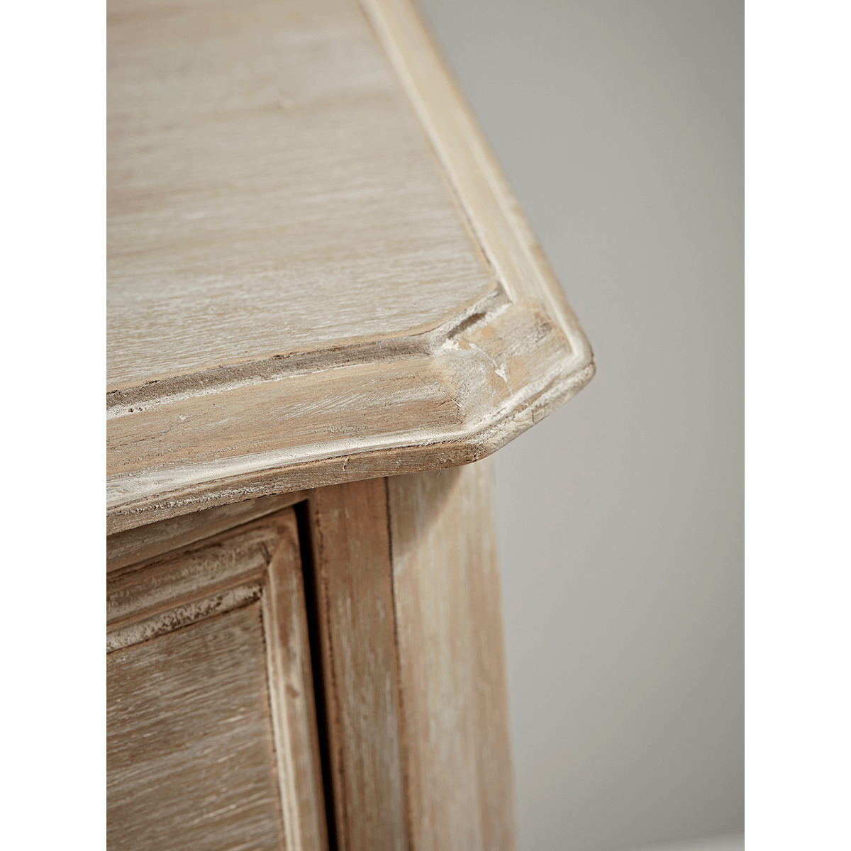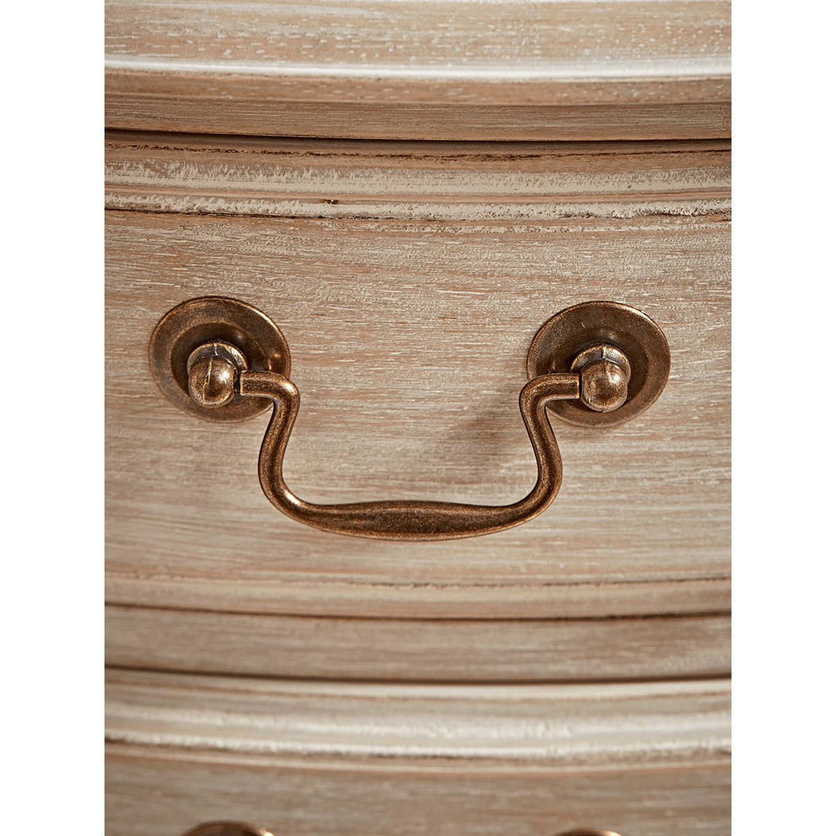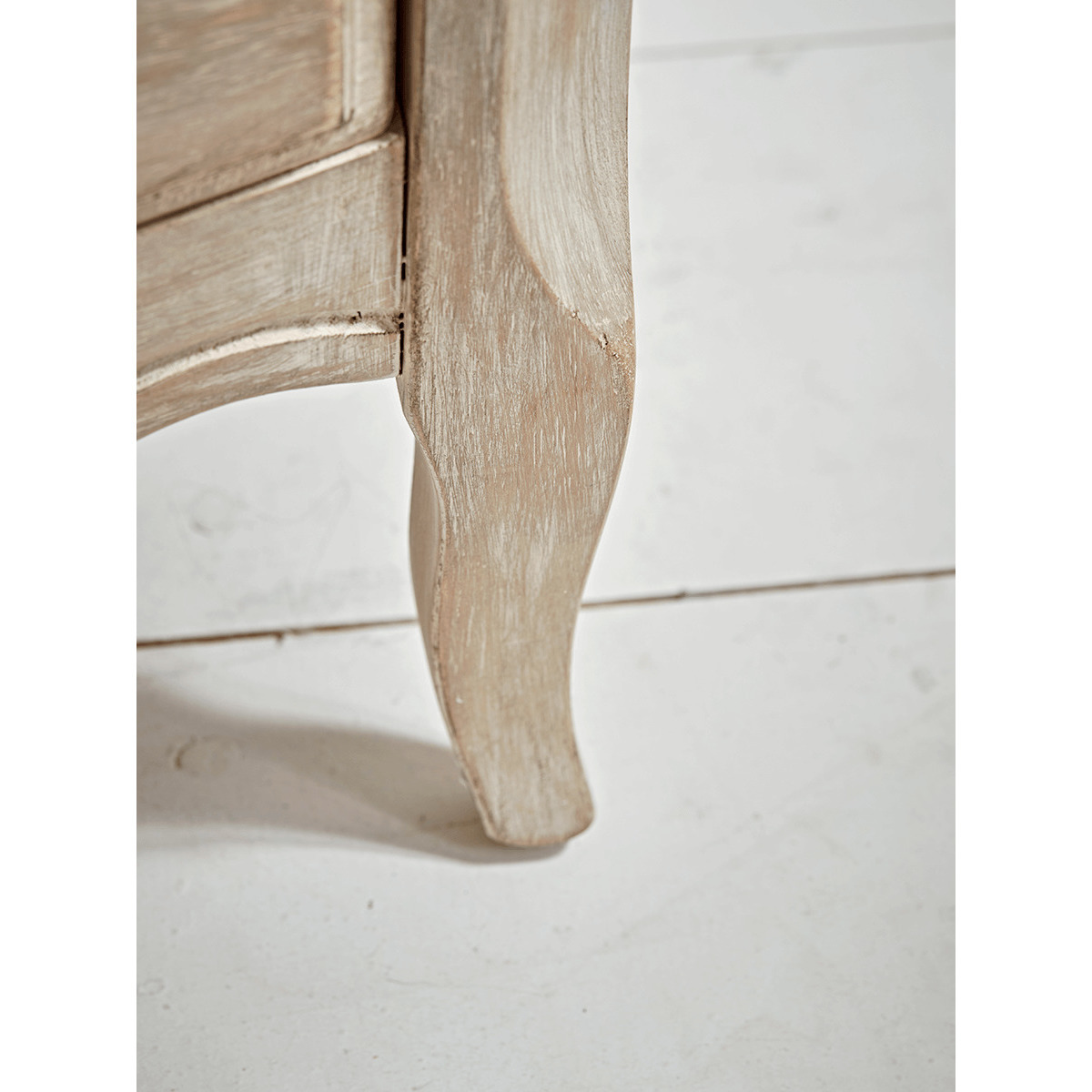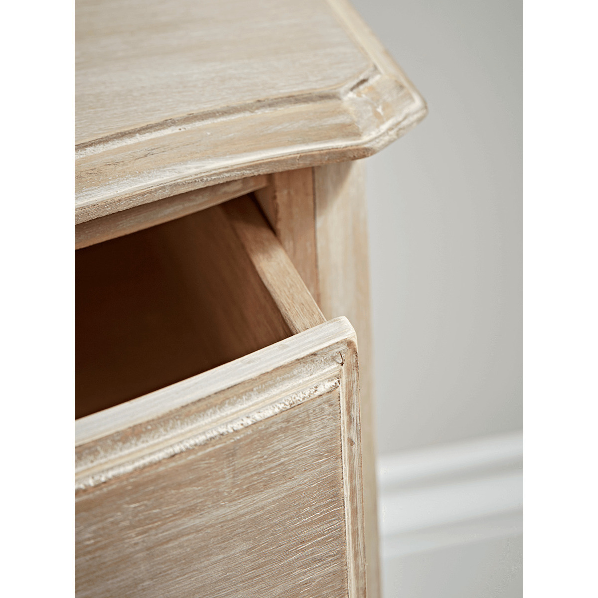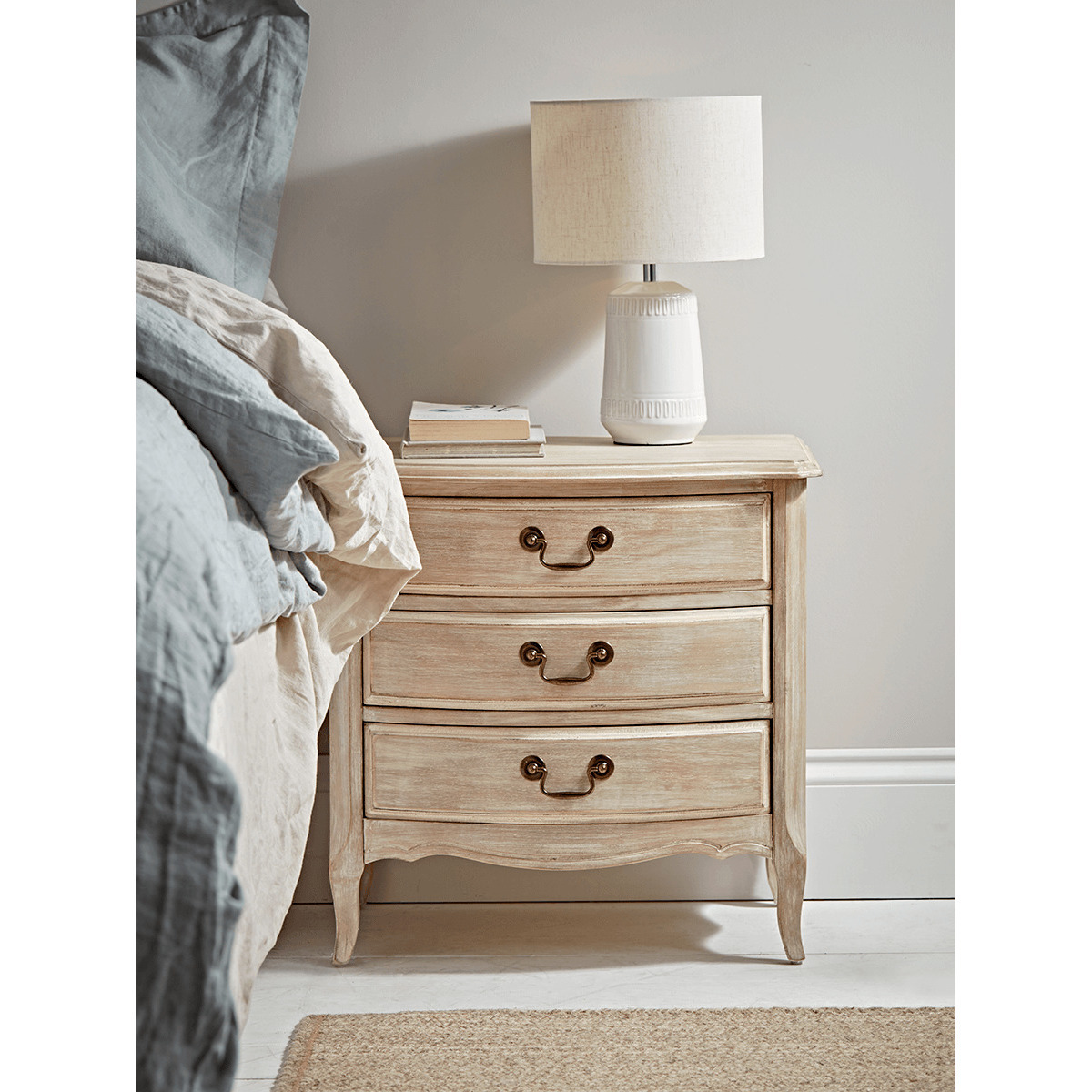 Beautifully carved from birch wood with elegantly shaped legs and burnished brass hardware, our Clermont range has a classical, romantic look. Our bedside table features three drawers and is the perfect bedside addition. Recreate our look with our Soft Geometric Bedside Lamp.