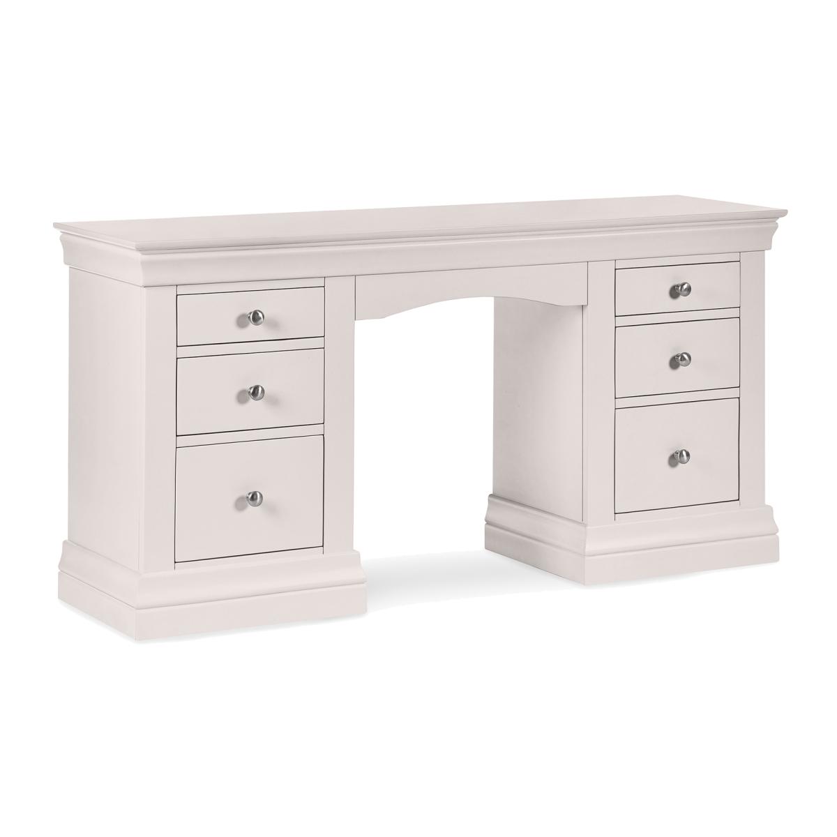 The Clermont Dressing Table in Light Grey adds a touch of French elegance to your bedroom or dressing area. Its soothing light grey lacquered finish and simple, clean lines create a bright and airy atmosphere, making it a versatile addition to both contemporary and traditional settings. Crafted from durable Pine and MDF, the design features brushed steel handles that offer a sleek, modern touch. With six pull-out drawers, you have ample storage for all your accessories and essentials. Assembly is straightforwardjust attach the handles, and you're ready to go.