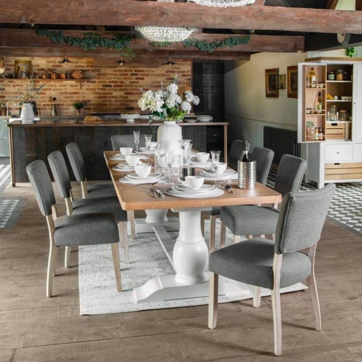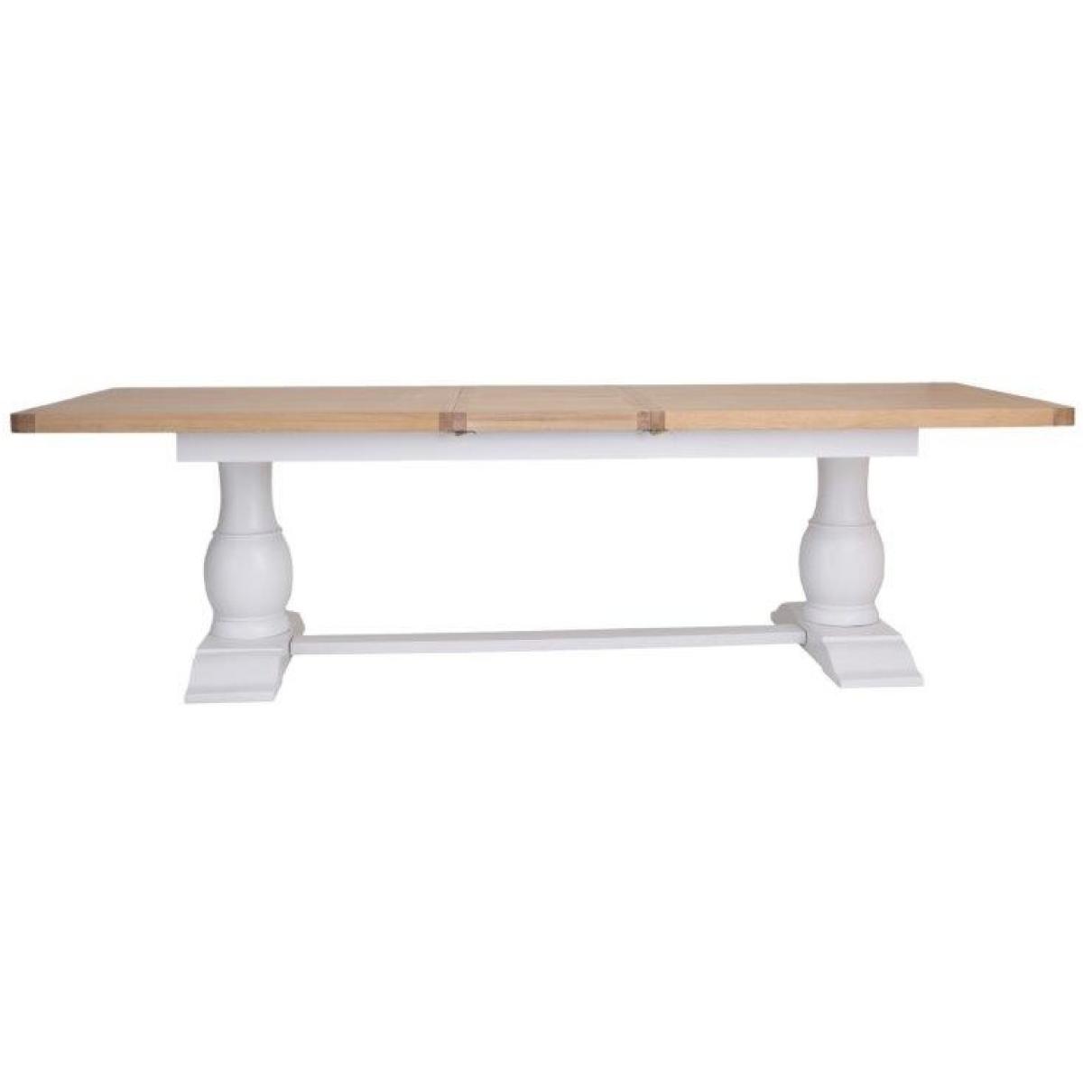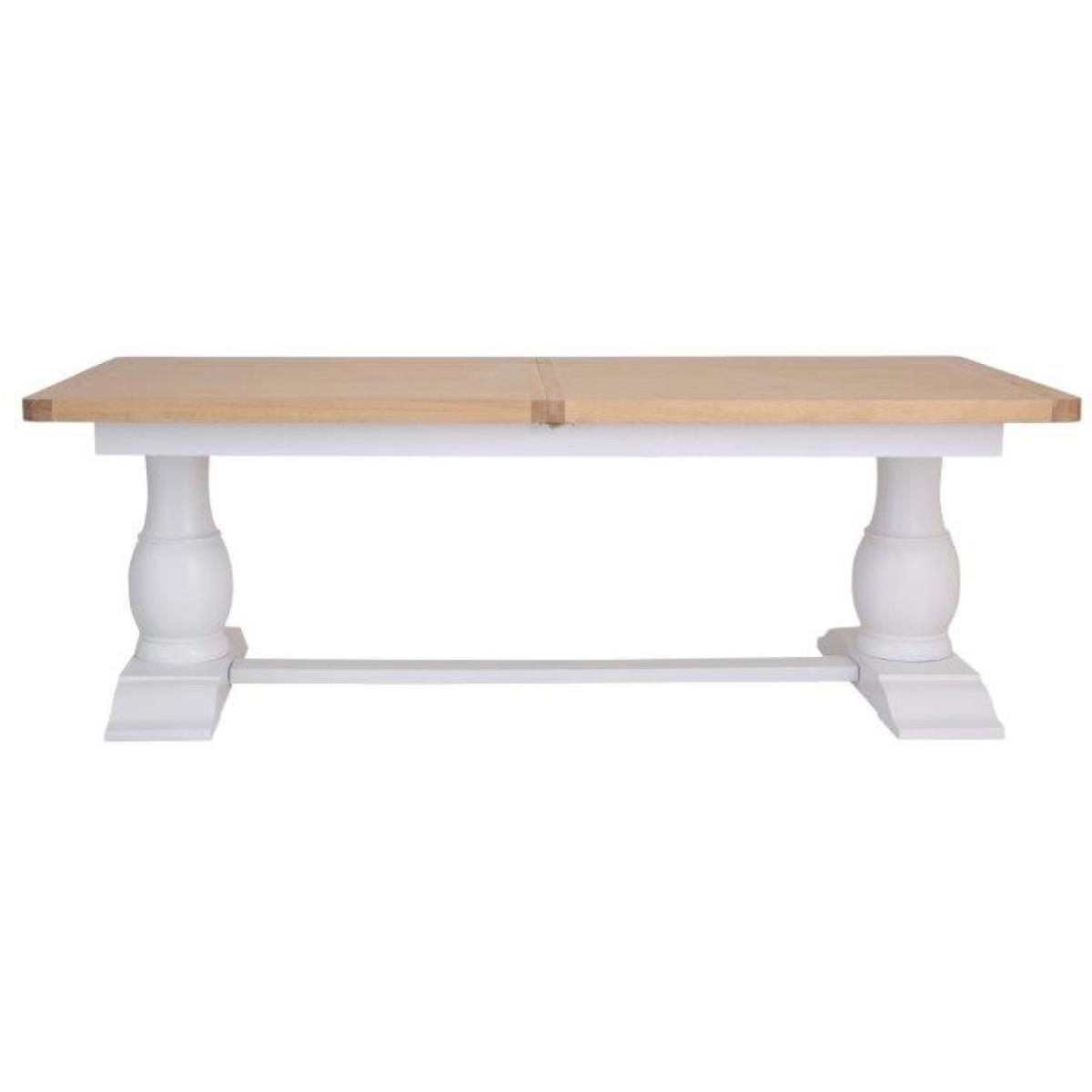 The Clevedon 2.2m Extending Table in White and Oak is a modern farmhouse-inspired look paired with contemporary colours and finishes. With this range, you can design the home of your dreams. is a modern farmhouse-inspired look paired with contemporary colours and finishes. With this range, you can design the home of your dreams. Key Features: Assembly required. Hidden Butterfly Mechanism Chunky Oak Top with Rounded Corners Aluminium ball bearing runner for smooth extending action Centre Support Rail between legs Clips to lock in extended or standard position Colour - White/Oak Dimensions: Height: 78cm Width: 220 / 270cm Depth: 100cm All screens vary in colour reproduction and whilst every effort has been made to display the colour as accurately as possible it is for guidance only.