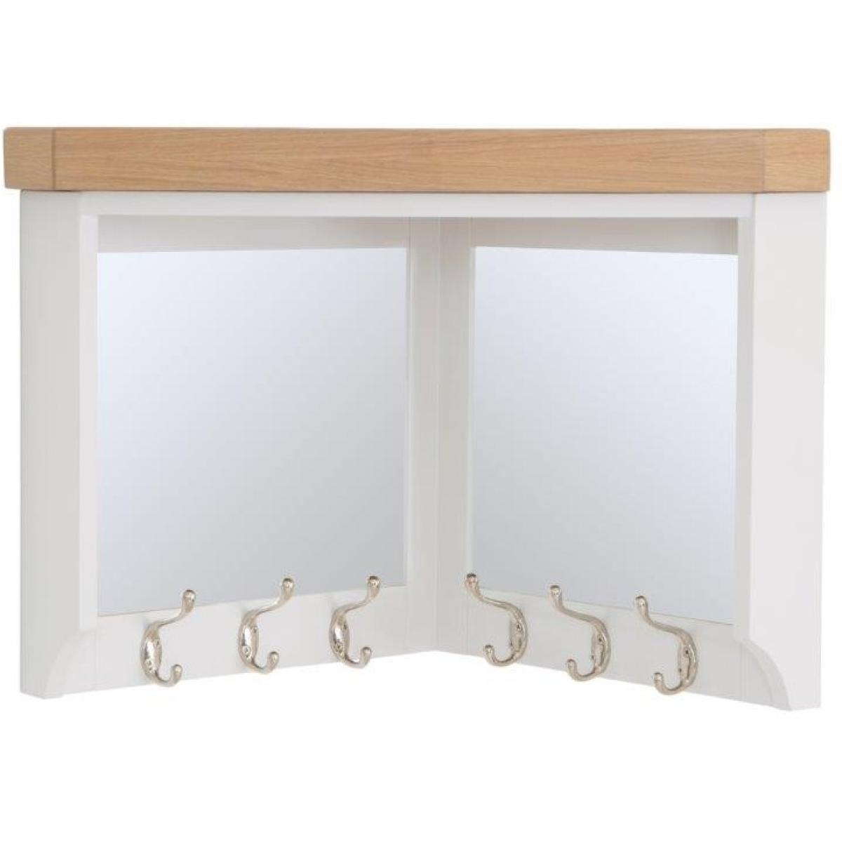 This Clevedon Corner Hall Bench Top in White and Oak is a modern farmhouse-inspired look paired with contemporary colours and finishes. Features a corner piece with attachment brackets and 6 coat hooks with mirrored panels. With this range, you can design the home of your dreams. Key Features:. *No assembly required. *Corner piece unit with brackets *Mirrored Panels *6 Chrome Coat Hooks *Chunky Oak Top with Rounded Corners *Colour - White/Oak Dimensions:. *Height: 45cm *Width: 67.2cm *Depth: 40.1cm *Weight 9kg All screens vary in colour reproduction and whilst every effort has been made to display the colour as accurately as possible it is for guidance only.