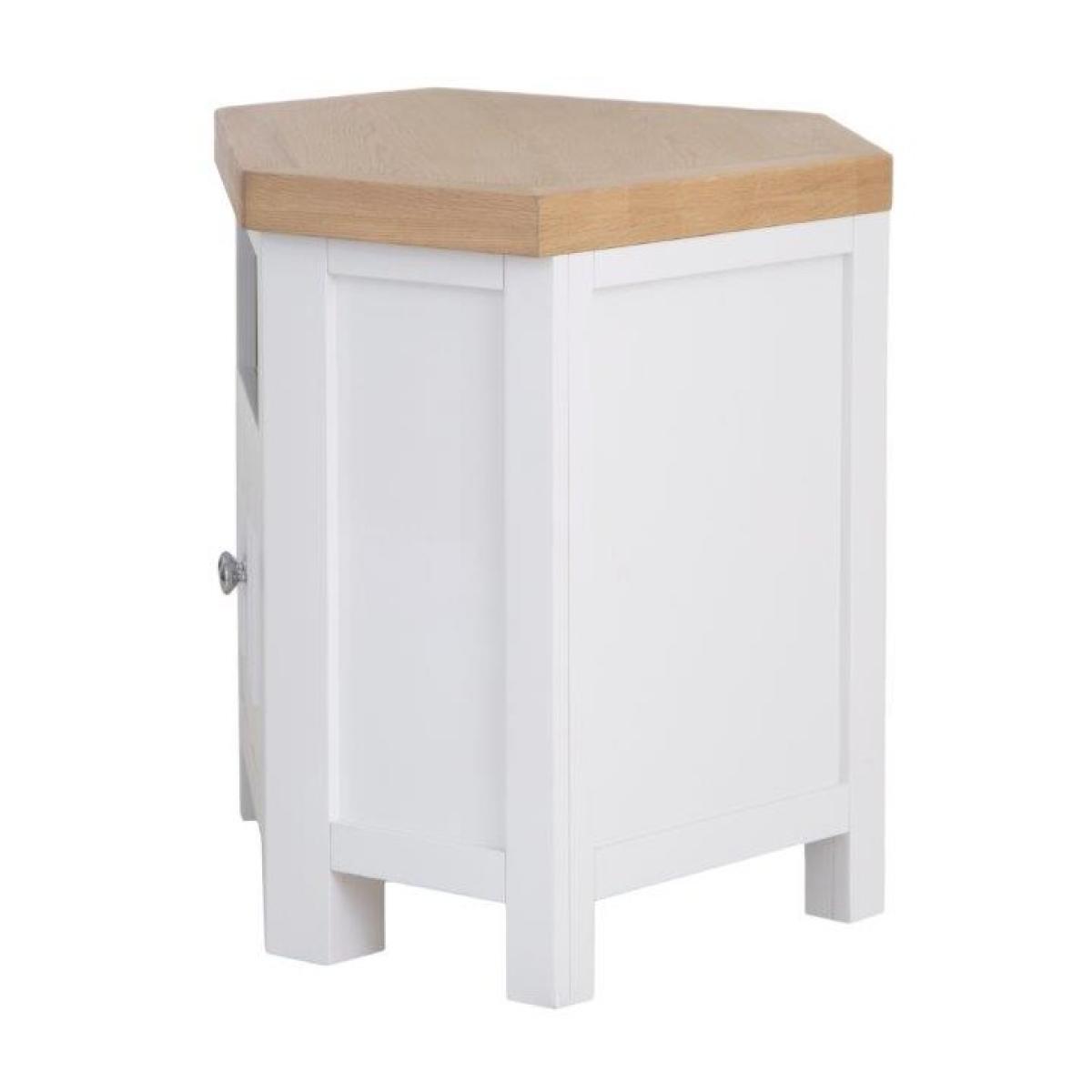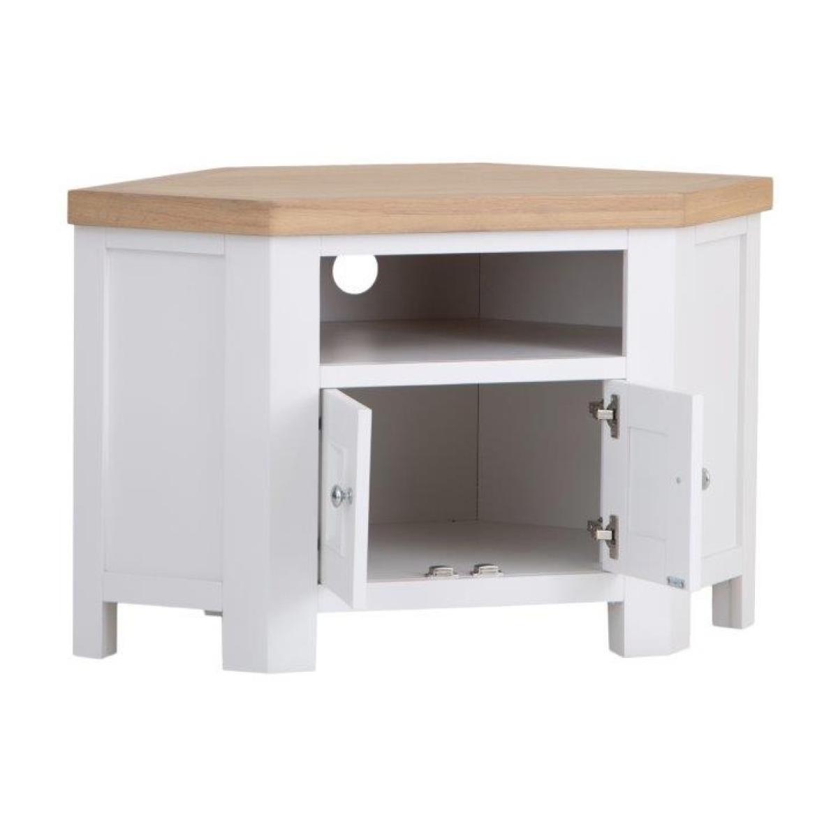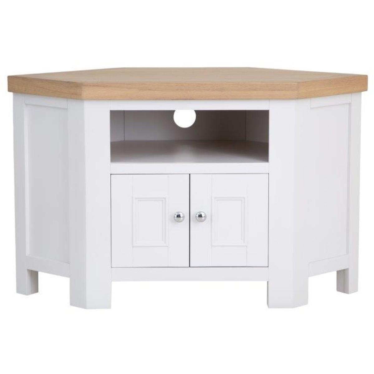 This Clevedon Corner TV Unit in White and Oak is a modern farmhouse-inspired look paired with contemporary colours and finishes. Features double doors on the front with cable holes in the back of the unit. With this range, you can design the home of your dreams. Key Features:. *No assembly required. *Double door opening on the front *Cable holes in back of unit * Chrome Handles *Chunky Oak Top with Rounded Corners *Soft Close Doors *colour White/Oak Dimensions:. *Height: 65cm *Width: 105.2cm *Depth: 55cm *Weight 24kg All screens vary in colour reproduction and whilst every effort has been made to display the colour as accurately as possible it is for guidance only.