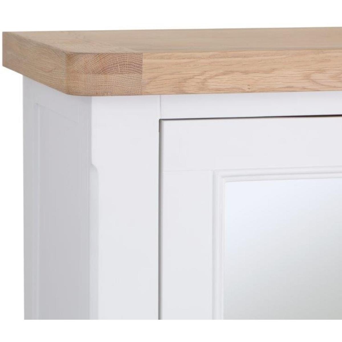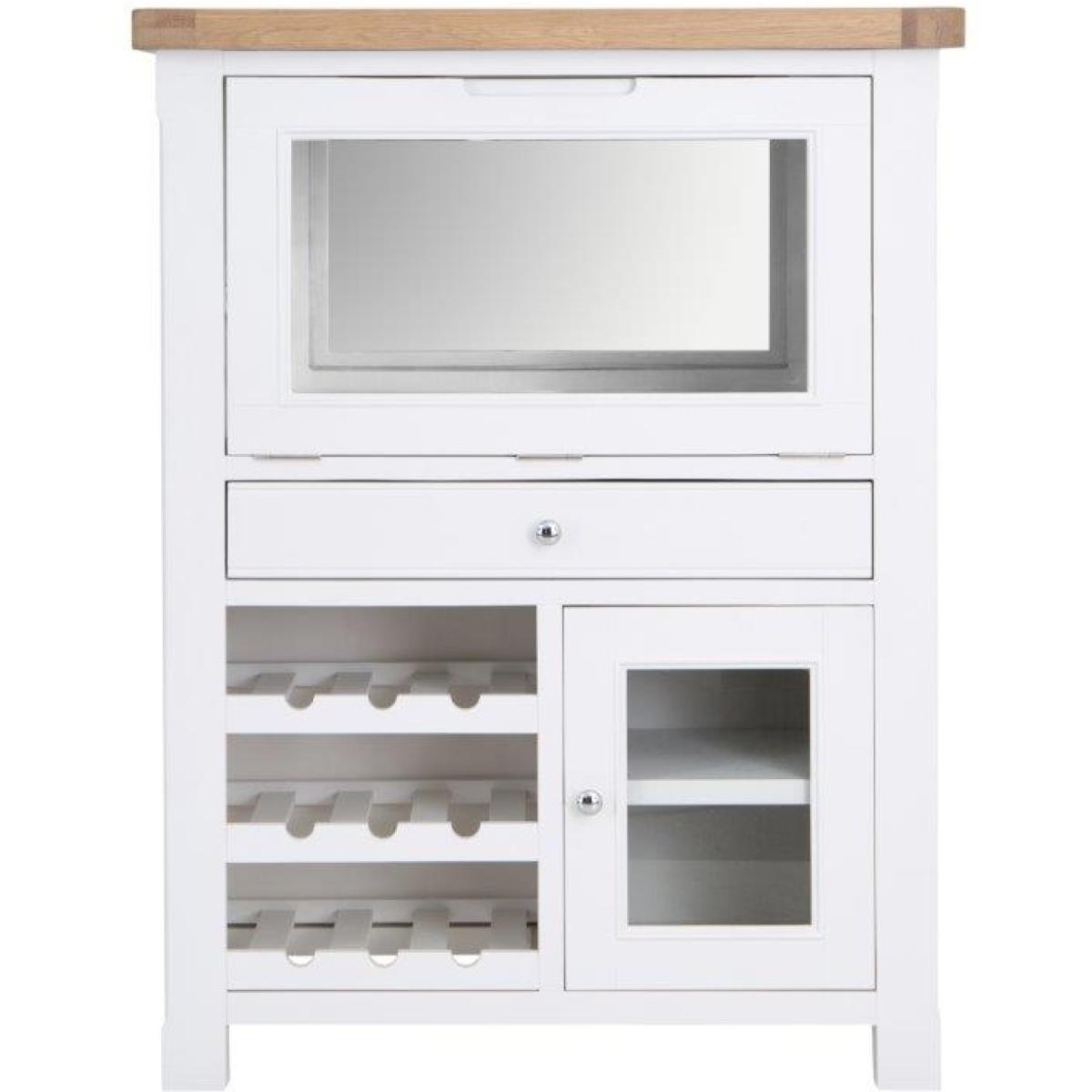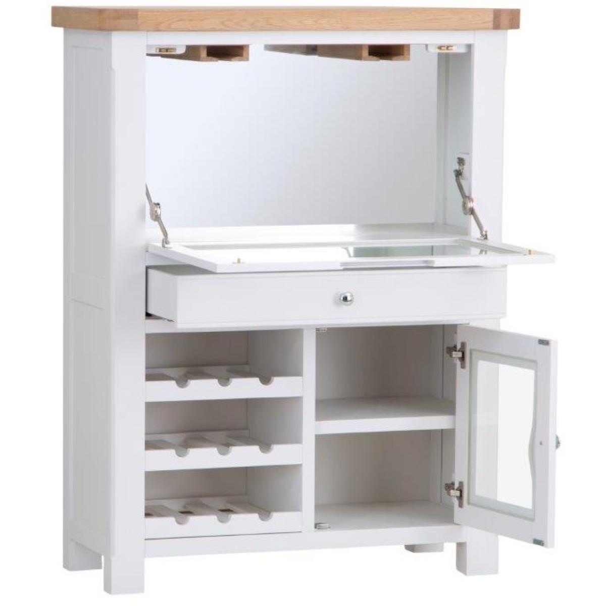 This Clevedon Drinks Bureau in White and Oak is a modern farmhouse-inspired look paired with contemporary colours and finishes. Features 1 Glass flip down door, 1 storage drawer and 1 glass cupboard with an open wine rack shelves holds 9 bottles. With this range, you can design the home of your dreams. Key Features:. *No assembly required. *External: 1 Glass flip down door, 1 slimline drawer, 1 cupboard Door *Internal: Glass holders mounted undertop, open space top, 1 interal shelf in cupboard *Open Wine rack shelves holds 9 bottles *Chunky Oak Top with Rounded Corners *Soft Close Doors Drawers, Magnet close top flip door *Colour - White/Oak Dimensions:. *Height: 130cm *Width: 100cm *Depth: 40cm *Weight 55kg All screens vary in colour reproduction and whilst every effort has been made to display the colour as accurately as possible it is for guidance only.