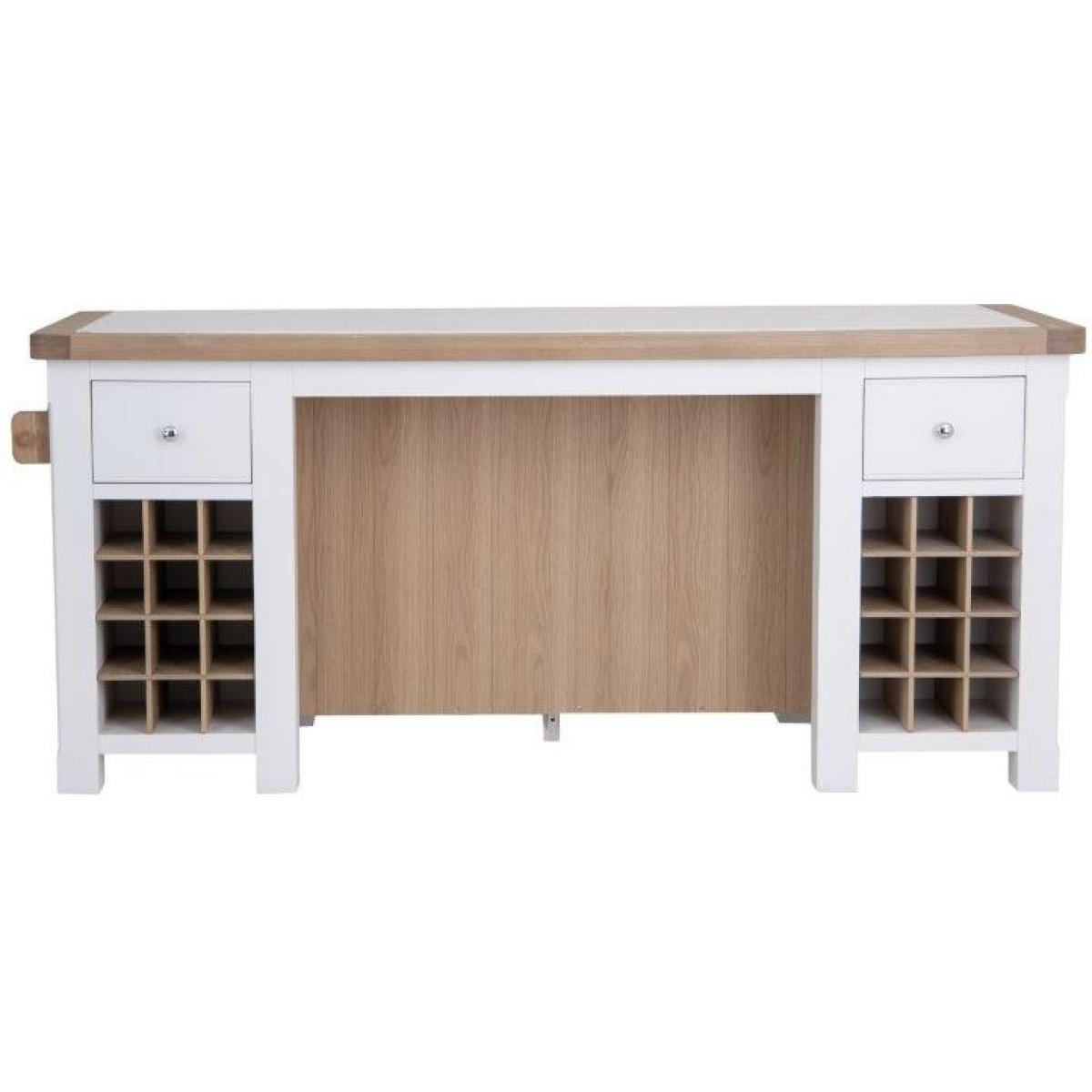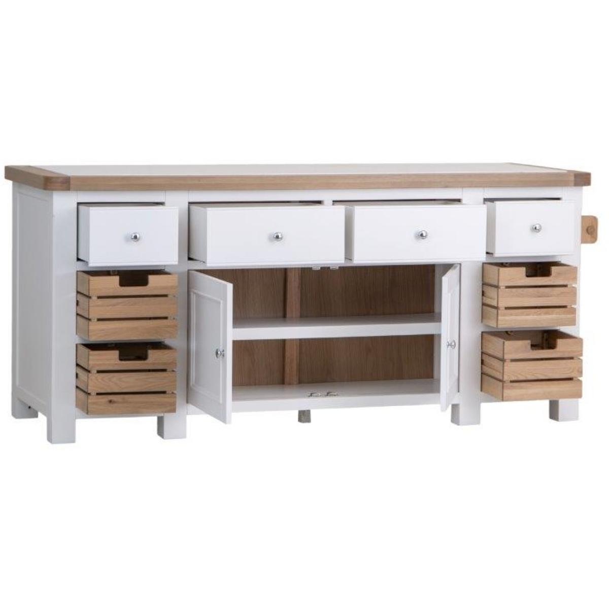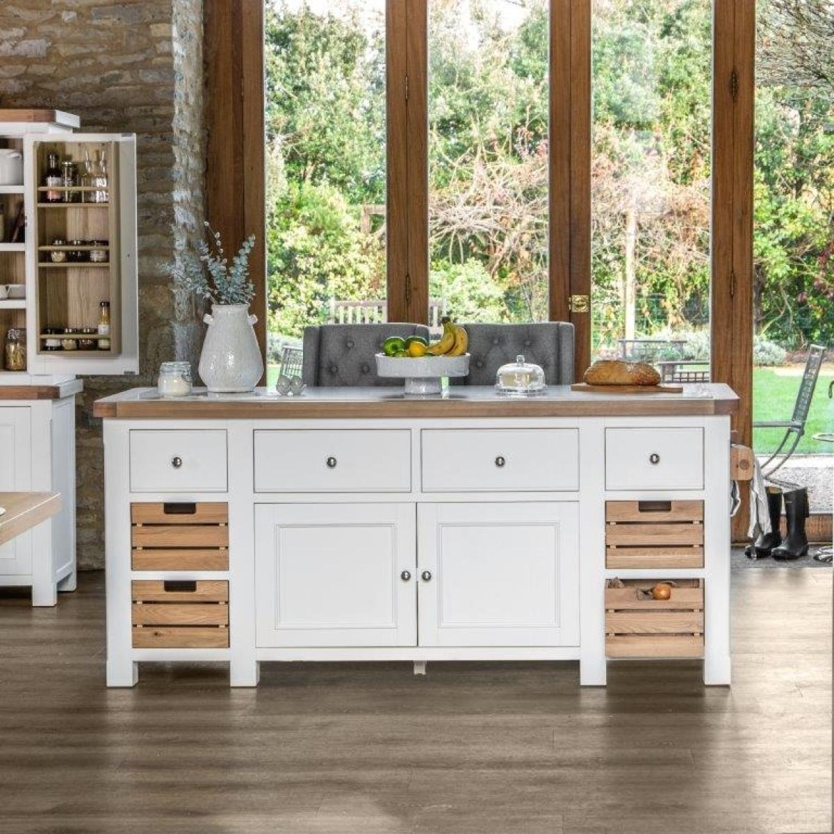 This Clevedon Large Kitchen Island in White and Oak is a modern farmhouse-inspired look paired with contemporary colours and finishes. Features a workspace top made with quartz with 6 drawers, (double door cupboard 2 small wooden create pull out) and 2 wine racks either side that holds 24 bottles. With this range, you can design the home of your dreams. Key Features: No assembly required. Work space top made with Quartz 6 Drawers, double door cupboard, 2 small wooden create pull out 2 wine Racks either side, holds 24 bottles Chunky Oak Top with Rounded Corners Soft Close Doors & Drawers Colour - White/Oak Dimensions: Height: 90cm Width: 200cm Depth: 70cm Weight 171kg All screens vary in colour reproduction and whilst every effort has been made to display the colour as accurately as possible it is for guidance only.