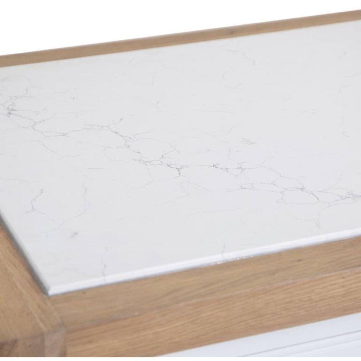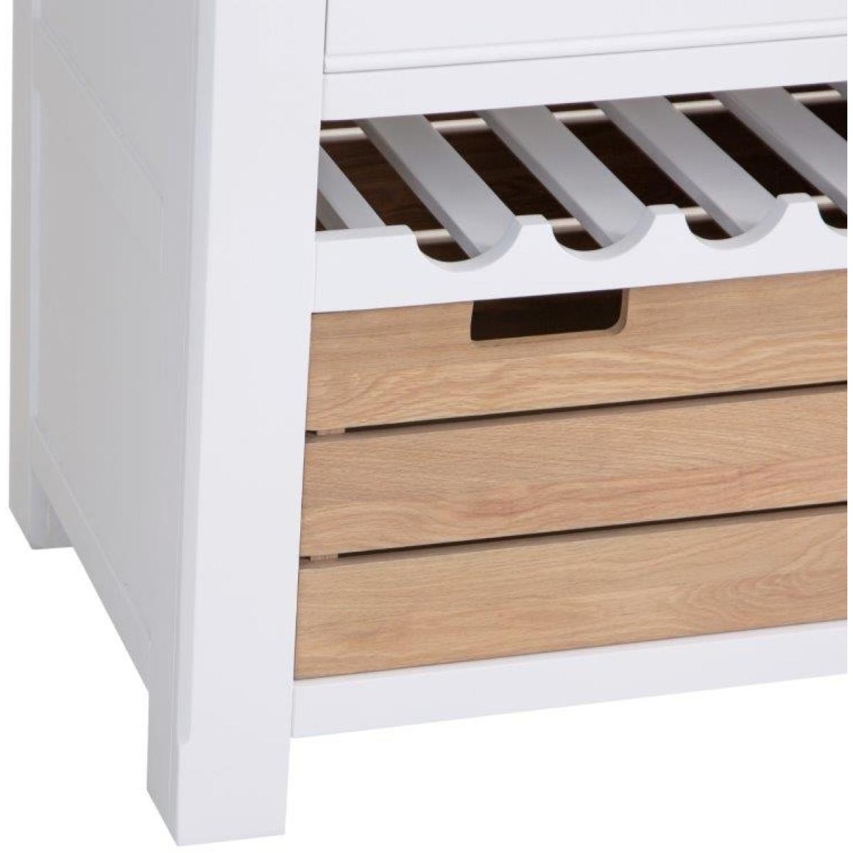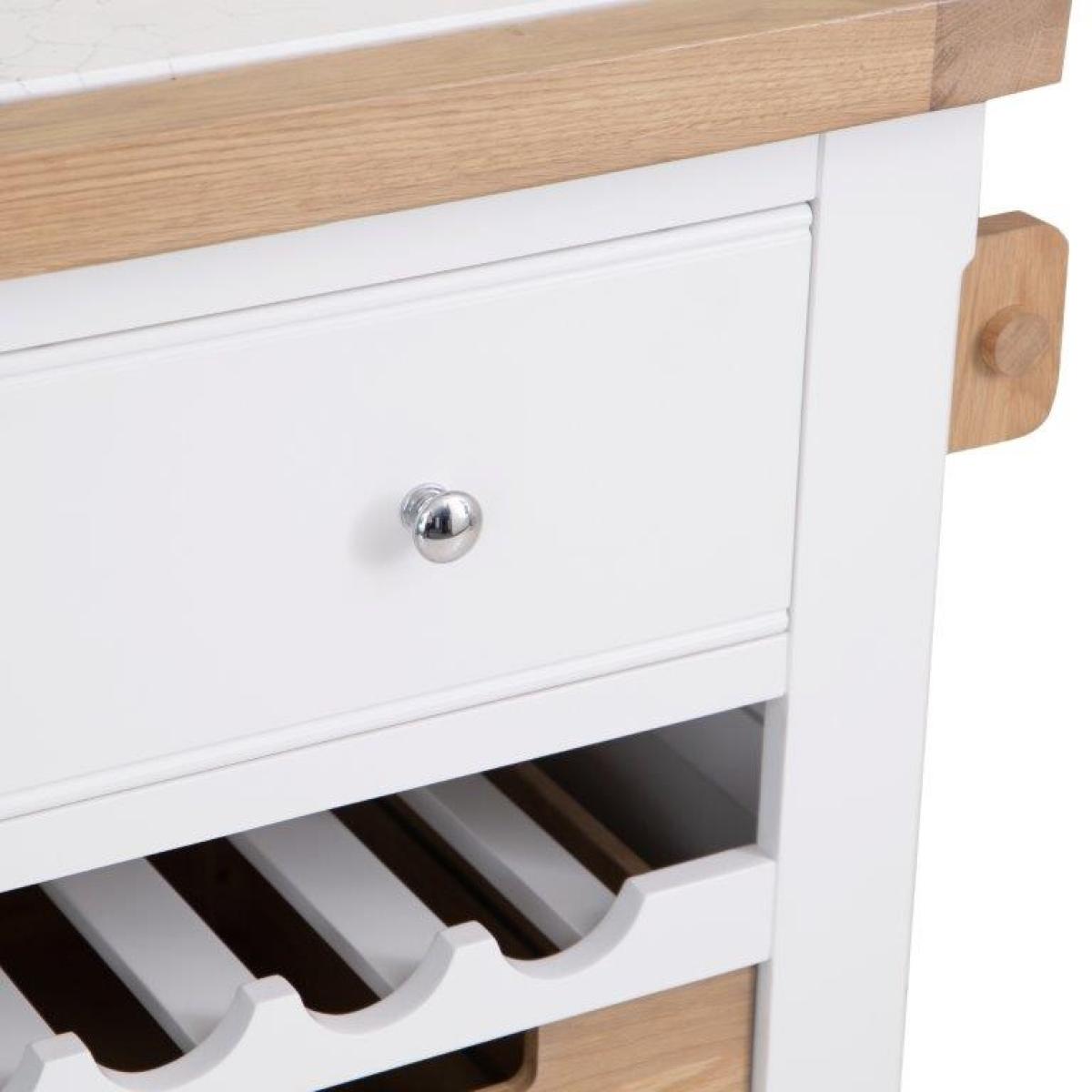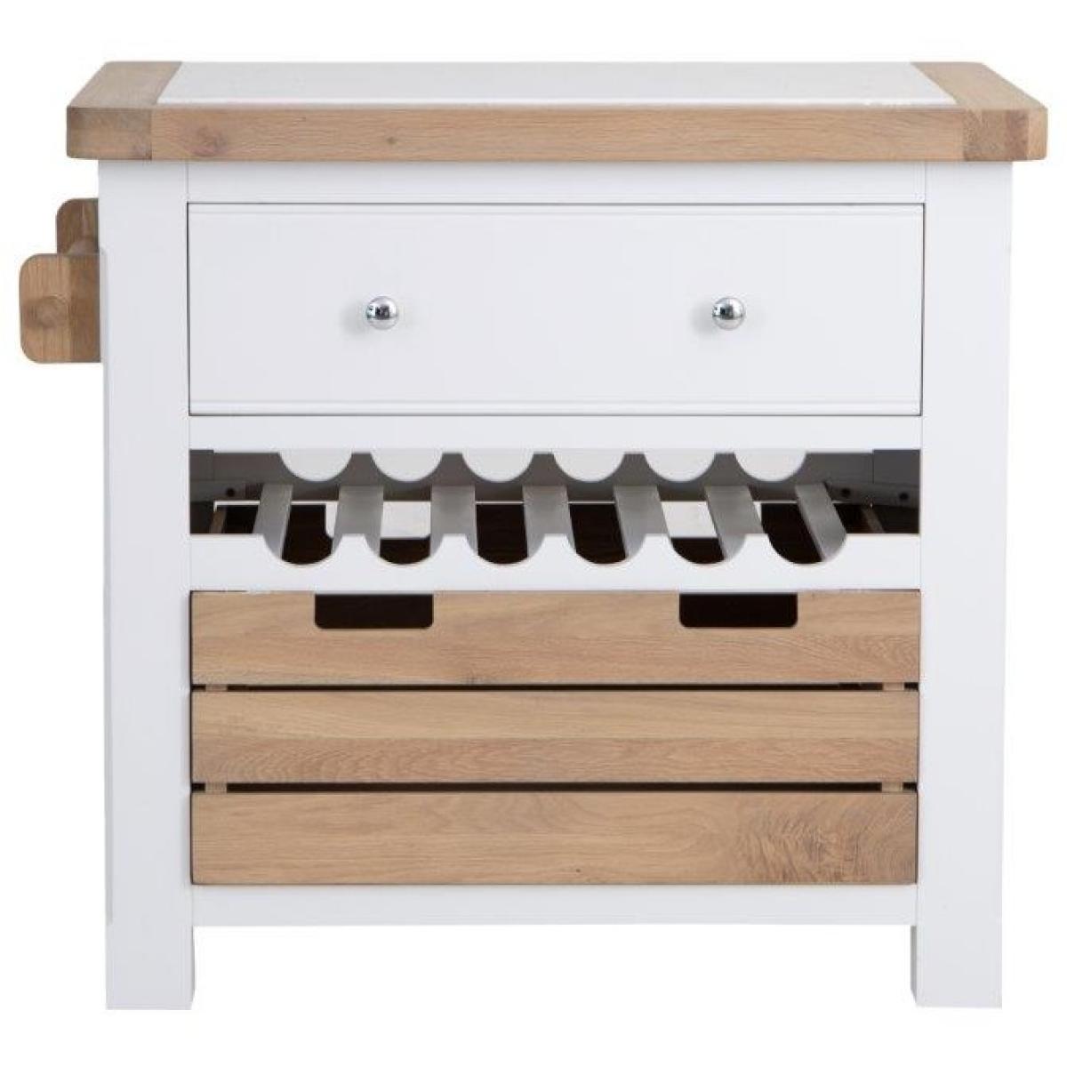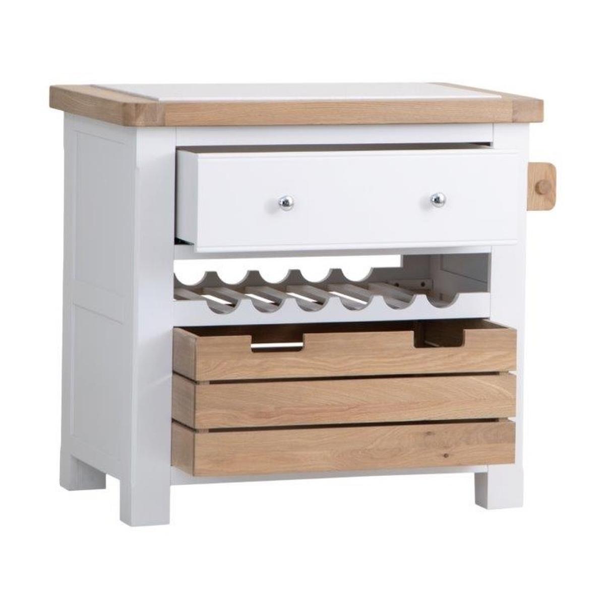 This Clevedon Small Kitchen Island in White and Oak is a modern farmhouse-inspired look paired with contemporary colours and finishes. Features a workspace top made with quartz and a wine rack that holds up to 12 bottles. With this range, you can design the home of your dreams. Key Features: No assembly required. Work space top made with Quartz Wine Rack holds 12 bottles 1 large top drawer, 1 large pull out wooden crate bottom Chunky Oak Top with Rounded Corners Soft Close Drawers Colour - White/Oak Dimensions: Height: 85cm Width: 94.5cm Depth: 60cm Weight 61kg All screens vary in colour reproduction and whilst every effort has been made to display the colour as accurately as possible it is for guidance only.