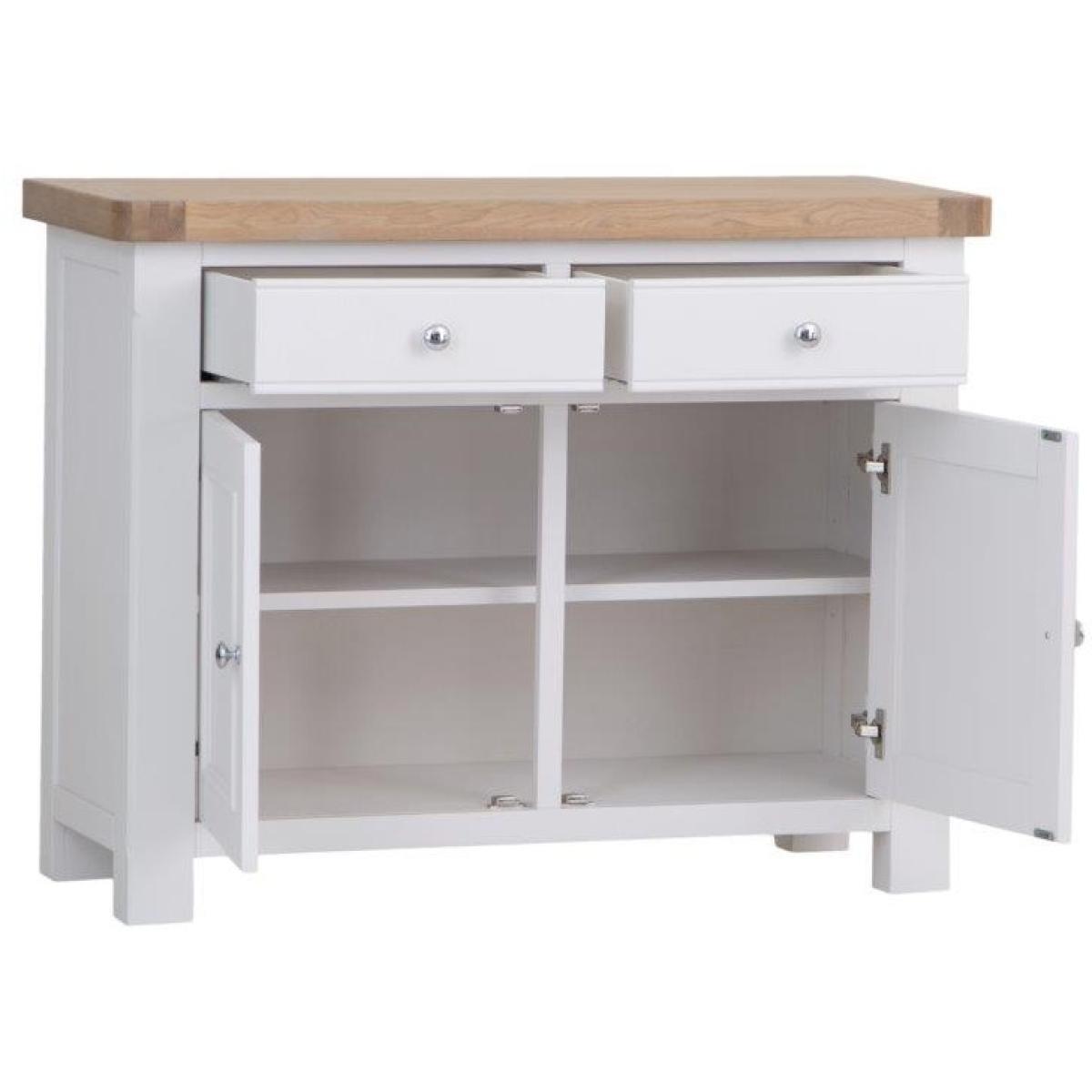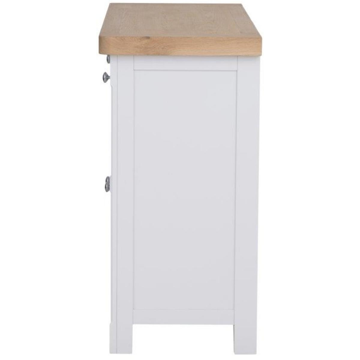This Clevedon Standard Sideboard in White and Oak is a modern farmhouse-inspired look paired with contemporary colours and finishes. Features 2 drawers and 2 doors with chrome handles. With this range, you can design the home of your dreams. Key Features: No assembly required. 2 drawers, 2 doors Chunky Oak Top with Rounded Corners Chrome Handles Soft Close Doors & Drawers Colour - White/Oak Dimensions: Height: 85cm Width: 110cm Depth: 42cm Weight 37kg All screens vary in colour reproduction and whilst every effort has been made to display the colour as accurately as possible it is for guidance only.
