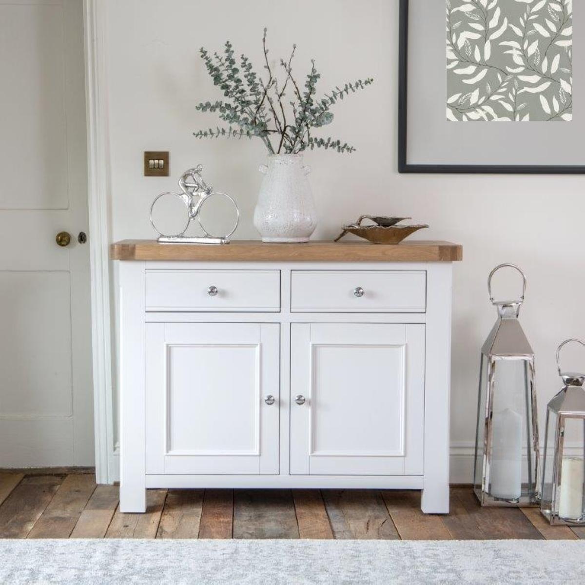 I love this sideboard for its versatile blend of white and oak tones, making it a great choice for both contemporary and Scandi-inspired interiors. Its clean lines and functional design mean it works well in living rooms, dining rooms, or hallways, adding a touch of practicality without compromising style. For styling, try pairing it with minimalist accessories like ceramics or greenery to keep the look fresh and uncluttered. It’s also worth playing with textured items or layered lighting above to highlight its warm oak top while keeping the overall space bright and inviting.