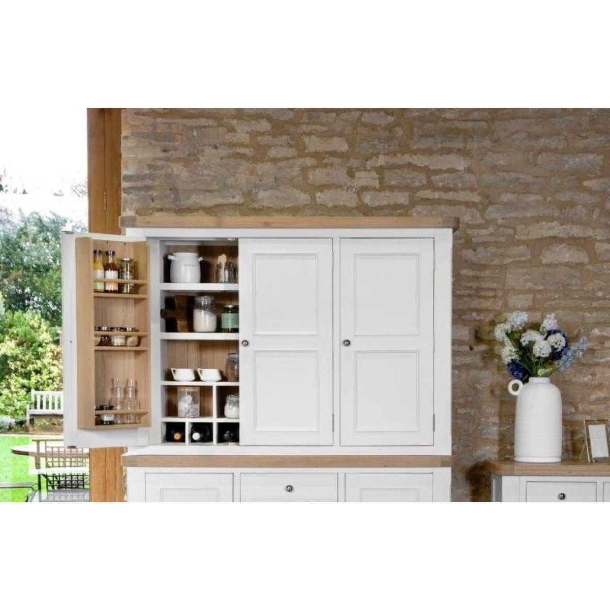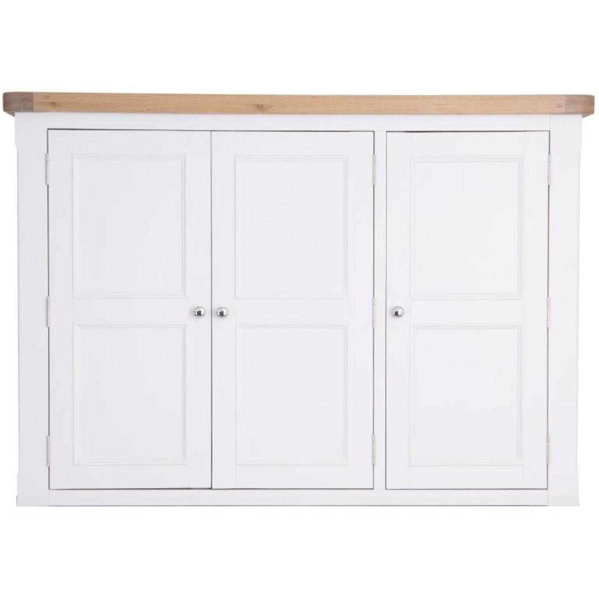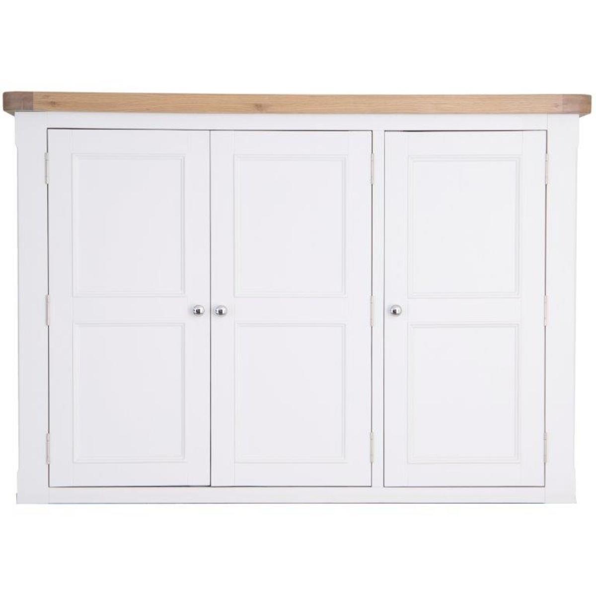 This Clevedon Triple Larder Unit Top in White and Oak is a modern farmhouse-inspired look paired with contemporary colours and finishes. Features 3 cupboard doors with 6 large shelves with storage racks and cubby holes. With this range, you can design the home of your dreams. Key Features: No assembly required. External: 3 cupboard doors with chrome handles Internal Double cupboard: 3 large shelves, 9 cubby holes Internal single door: 3 large shelves Storage racks on the inside of the cabinet doors Chunky Oak Top with Rounded Corners Colour - White/Oak Dimensions: Height: 105cm Width: 150cm Depth: 45cm Weight 92kg All screens vary in colour reproduction and whilst every effort has been made to display the colour as accurately as possible it is for guidance only.