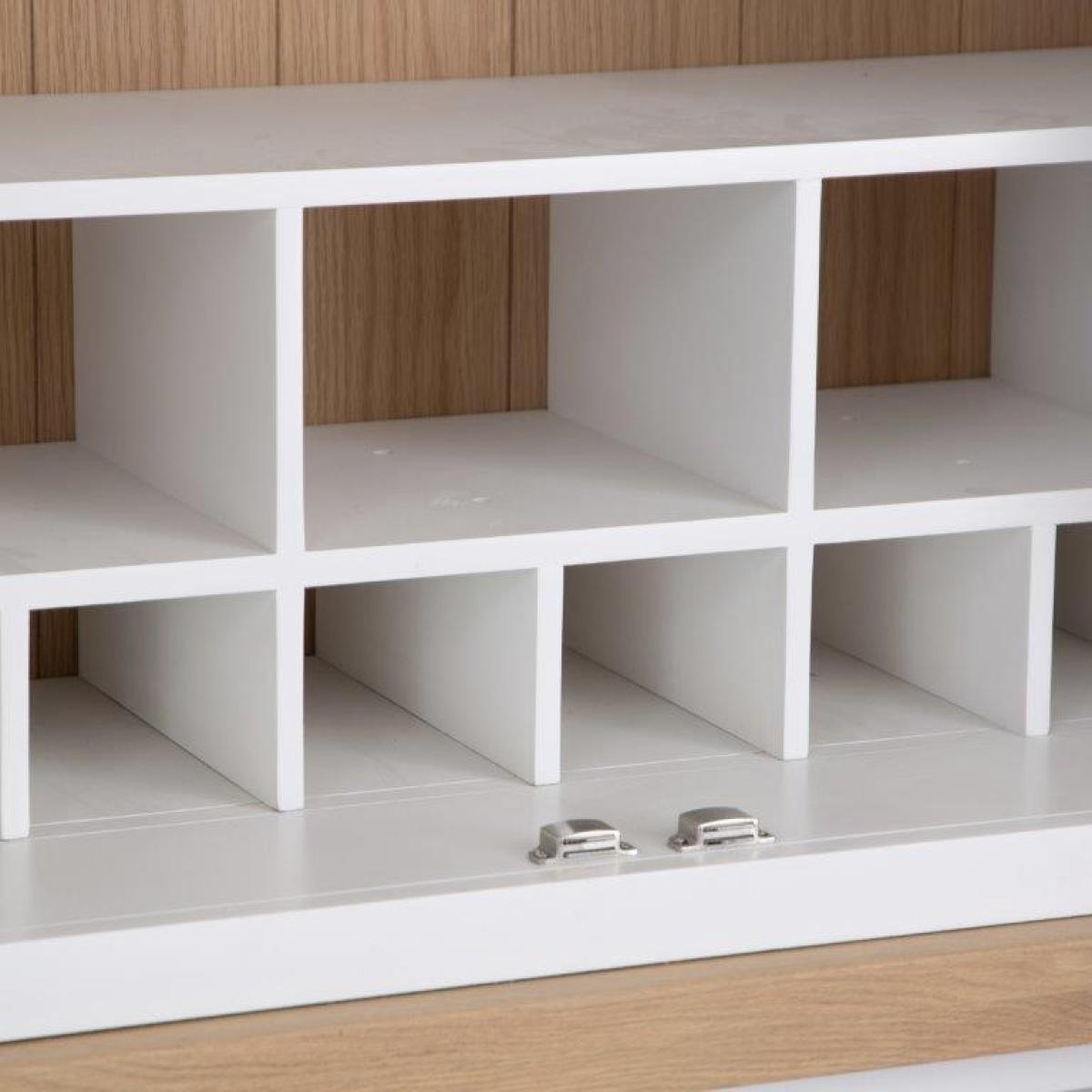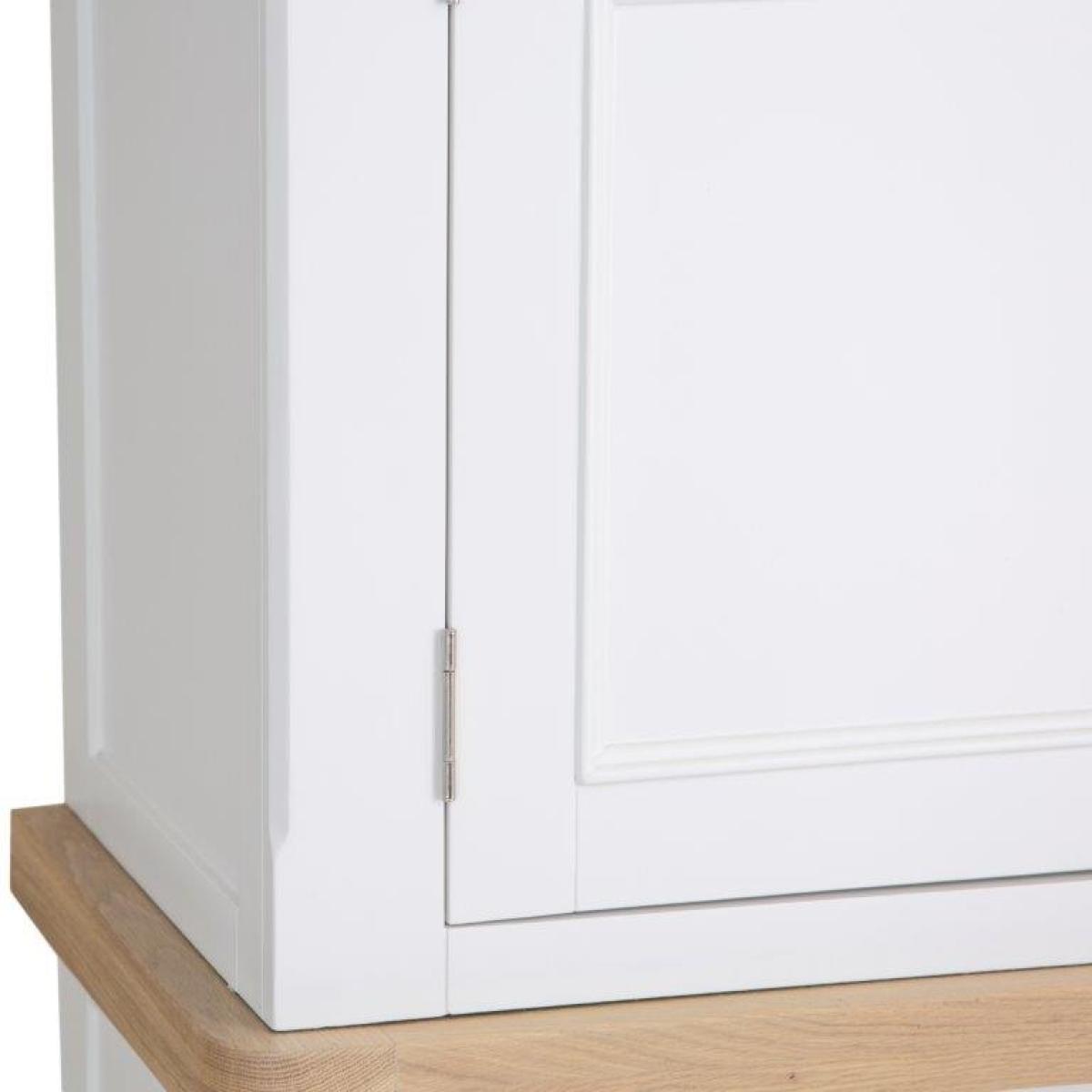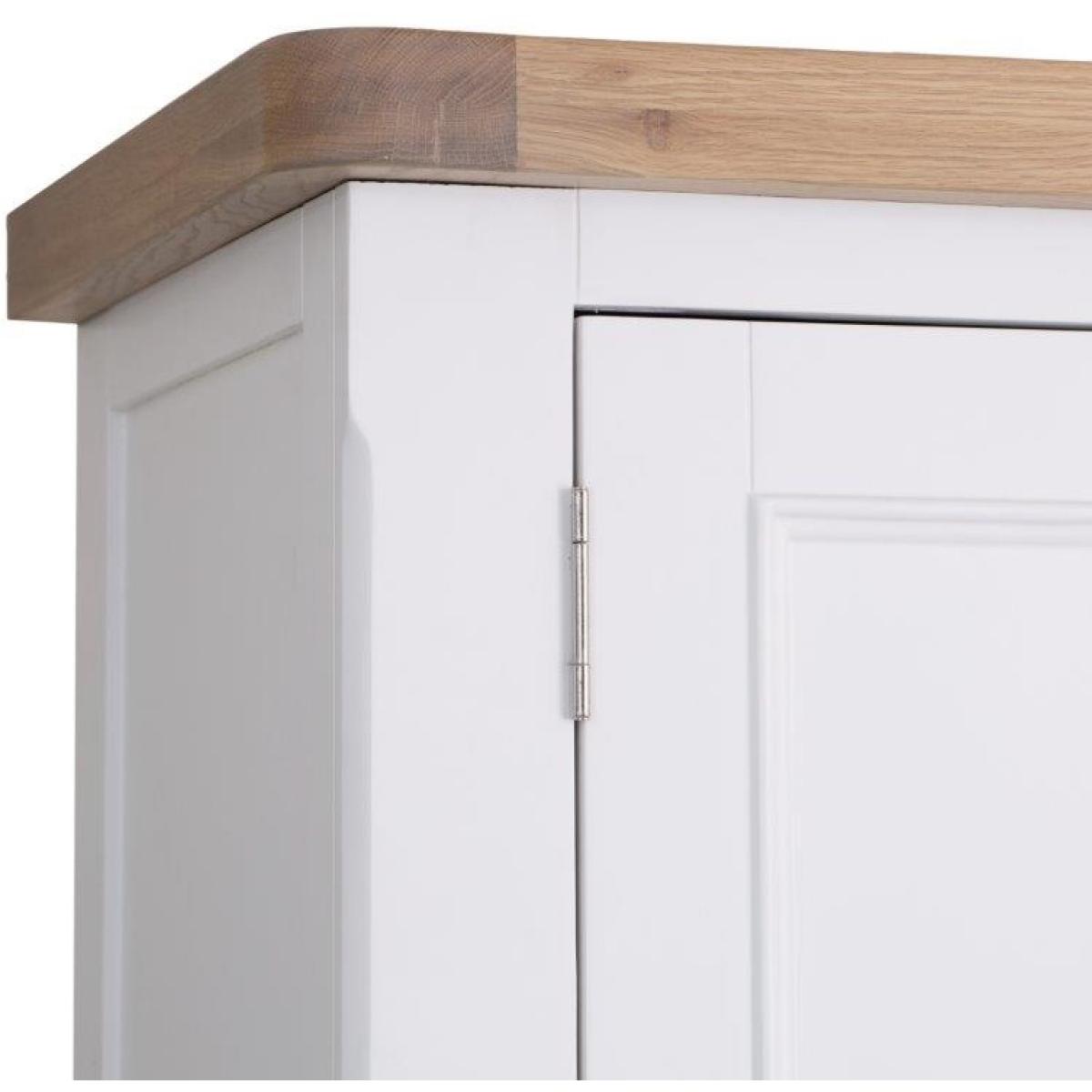 This Clevedon Triple Larder Unit Top in White and Oak is a modern farmhouse-inspired look paired with contemporary colours and finishes. Features 3 cupboard doors with 6 large shelves with storage racks and cubby holes. With this range, you can design the home of your dreams. Key Features: No assembly required. External: 3 cupboard doors with chrome handles Internal Double cupboard: 3 large shelves, 9 cubby holes Internal single door: 3 large shelves Storage racks on the inside of the cabinet doors Chunky Oak Top with Rounded Corners Colour - White/Oak Dimensions: Height: 105cm Width: 150cm Depth: 45cm Weight 92kg All screens vary in colour reproduction and whilst every effort has been made to display the colour as accurately as possible it is for guidance only.