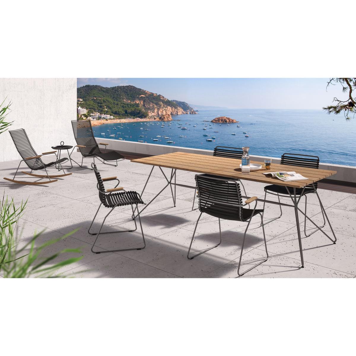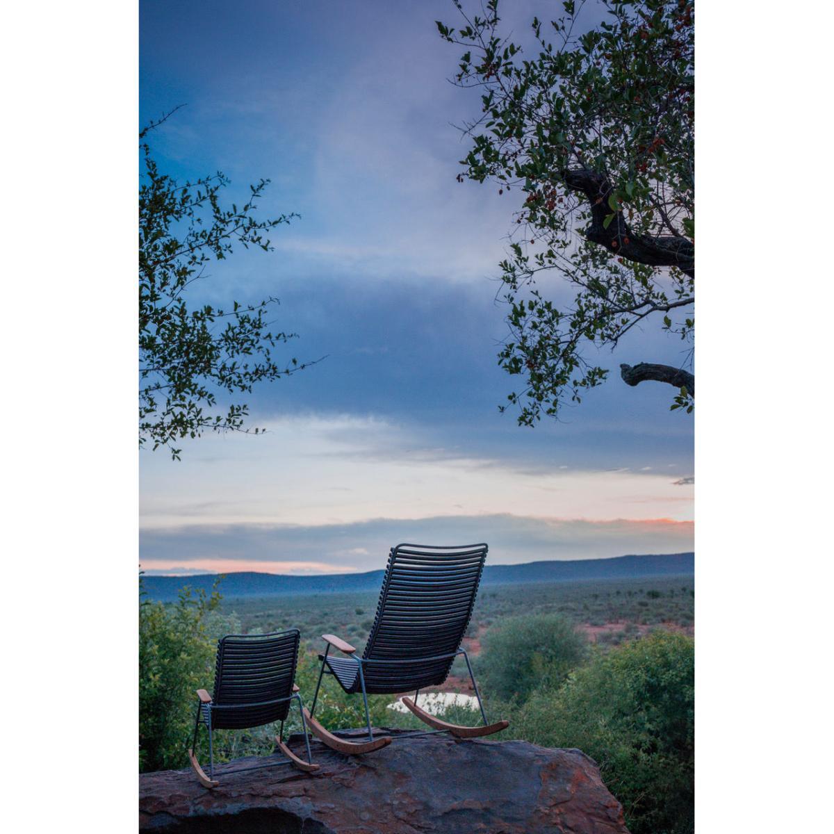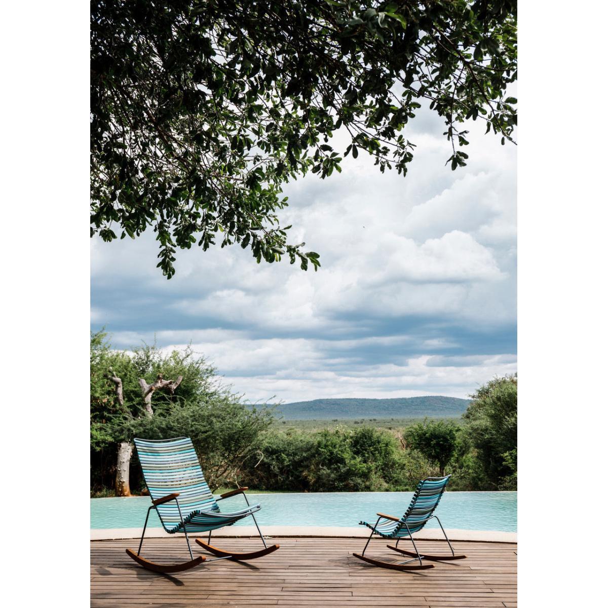 Danish designer Henrik Pedersen reinterprets traditional outdoor furniture in plastic slats. His Click collection is elegant, robust and fun all at the same time. The Click collection stands out for its great modularity: the plastic slats that form the seats are removable and interchangeable. They clip and unclip in the blink of an eye to the wire metal structure. In this way, you can mix the colours of several seats to create an ultra-personalised style!The Click rocking chair relies on a beautiful combination of materials: a fine, ethereal metal structure, armrests and rockers in natural bamboo with a warm look and a seat made up of a multitude of plastic slats. Make no mistake, plastic doesn’t necessarily mean discomfort. The flexible, supple seat adapts to your body. The slightly curved shape of the slats guarantees excellent comfort. With its high backrest, this rocking chair supports your back perfectly. Its sculptural curves make it an exceptional piece that fits in just as comfortably inside as out.
