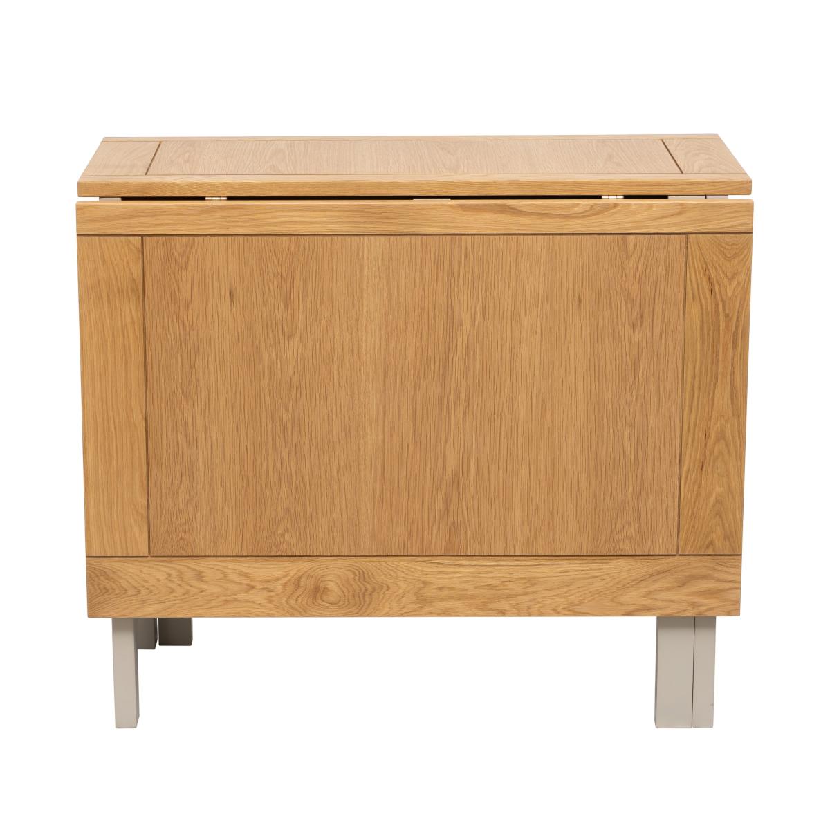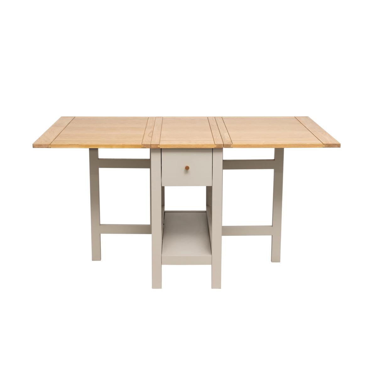 * Space saving* Storage drawers* Solid Oak frame* Easy to extend Designed to accommodate small gatherings and intimate meals, this table features a clever drop-leaf design that allows you to easily expand or reduce its size as needed. When fully extended, it comfortably seats up to four people, making it perfect for hosting dinners with family or friends. When not in use, the leaves can be folded down to save space, making it ideal for compact living areas.