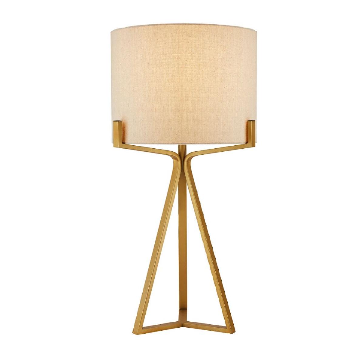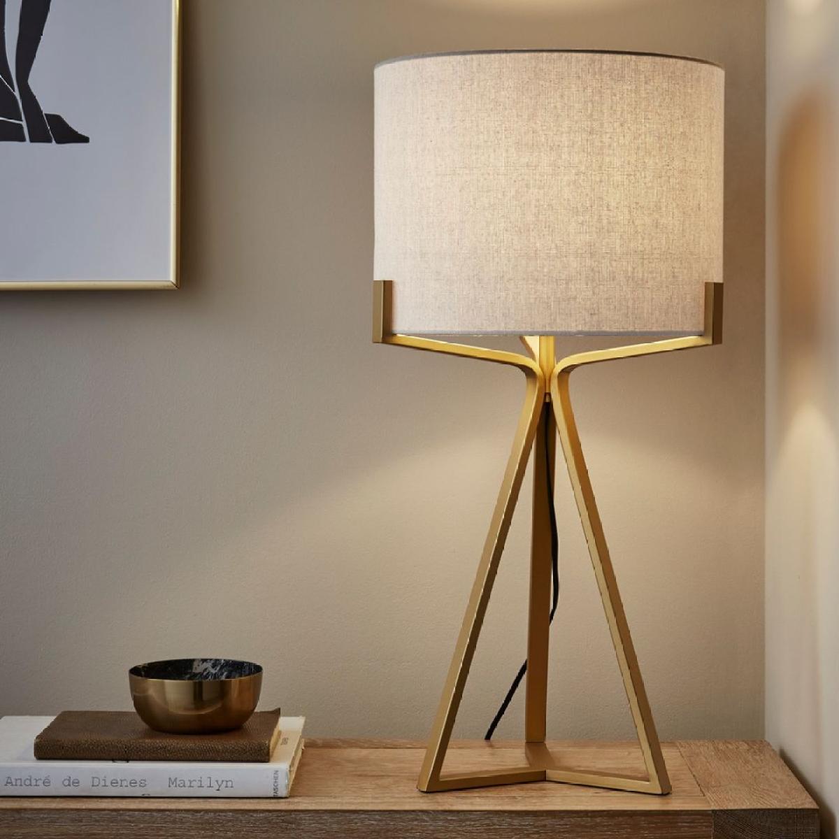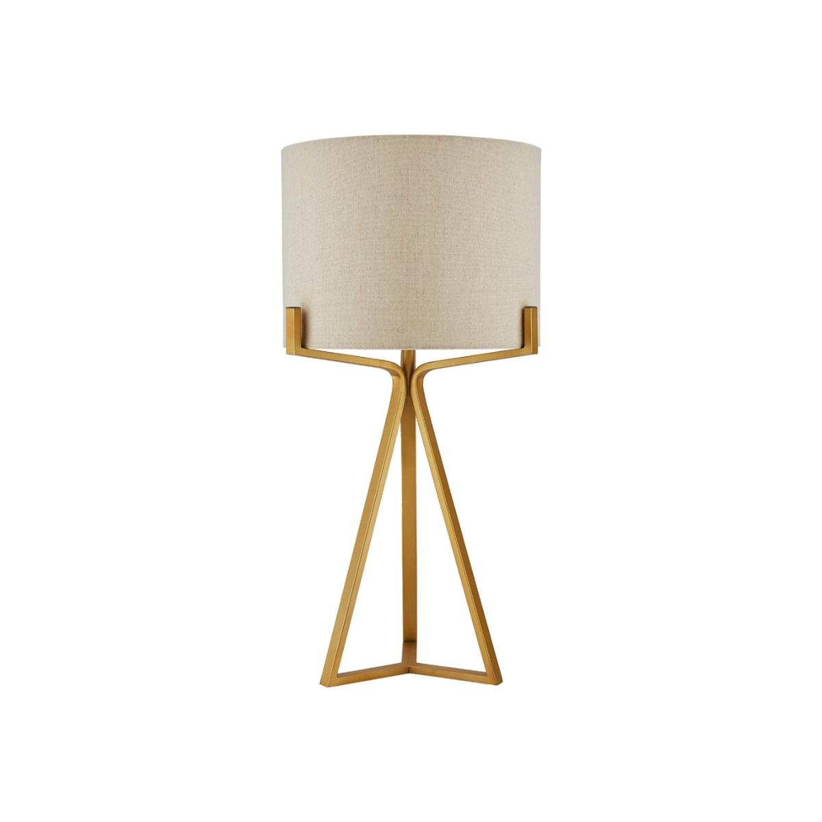 Clifford table lamp with brushed gold tripod base and neutral cylindrical shade.   Clifford table lamp with brushed gold tripod base and neutral cylindrical shade.
