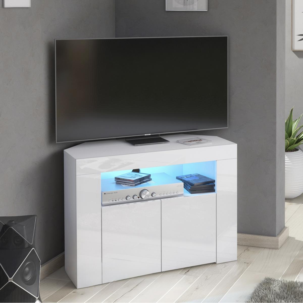 The unit features a high gloss white finish to the front (including doors and front panels) with the rest of the body (top, sides and bottom) in a matt white finish. It features a cupboard with two doors that elevate slightly above the top for opening, a shelf behind them, as well as an open space for your media above. Note that this is a flatpack item and will require assembly. Picture instructions, and a written notice are included with the item, these should be looked over carefully, before attempting assembly. Blue LED lights are included, they are mains powered with a UK power adapter and foot switch to turn them on and off.