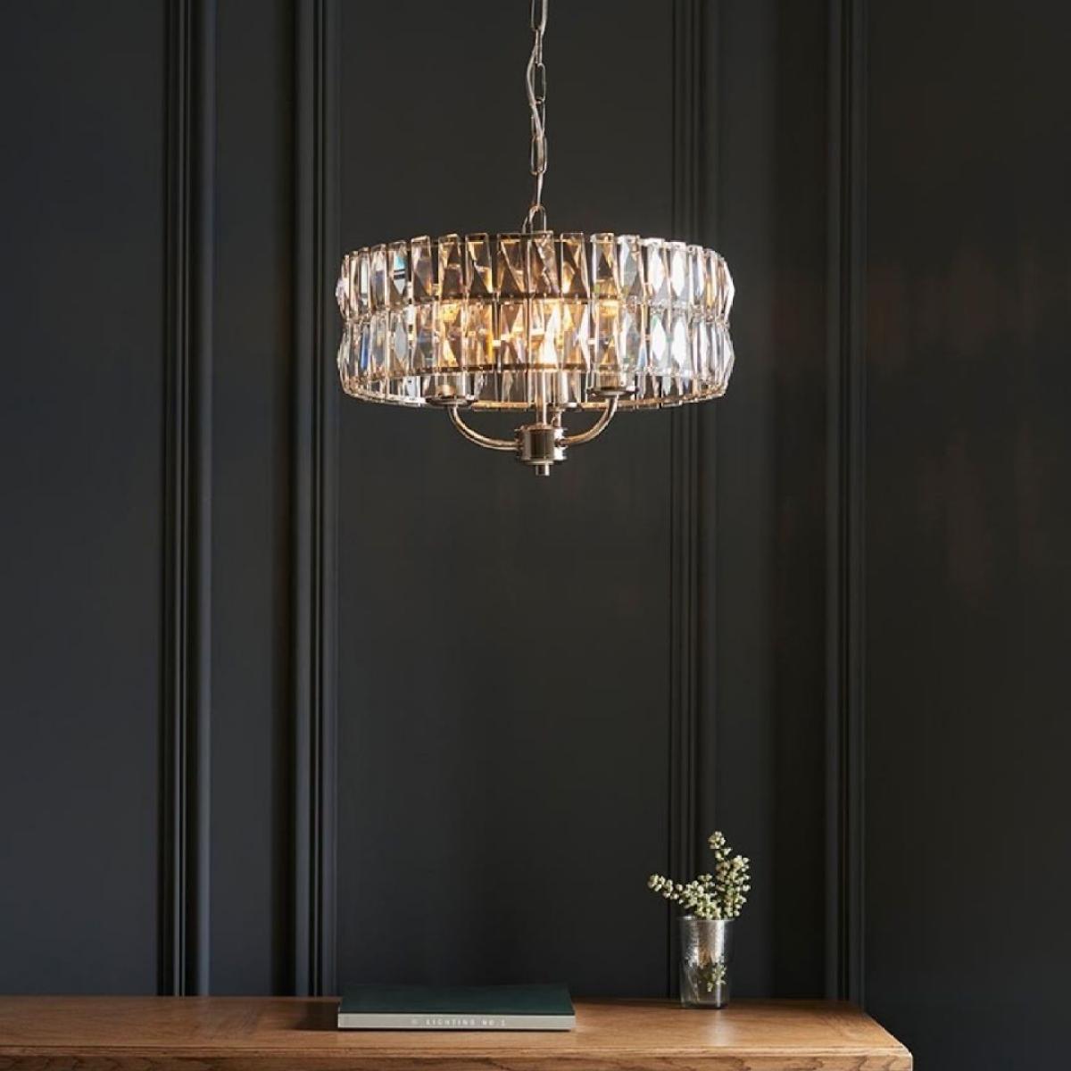 Clifton 3-light pendant ceiling light, featuring a shade made of decorative clear cut faceted glass and and a bright nickel finish. This exquisite fixture features a stunning shade crafted from decorative clear-cut faceted glass, creating a dazzling display of light and reflections. The bright nickel finish enhances its elegant design, making it a striking addition to both modern and traditional interiors. Perfect for bedrooms, dining areas or living spaces, the Clifton pendant light provides a warm and inviting glow while serving as a captivating focal point. Its three-light design offers balanced illumination, seamlessly blending functionality with style. Clifton 3-light pendant ceiling light, featuring a shade made of decorative clear cut faceted glass and and a bright nickel finish. This exquisite fixture features a stunning shade crafted from decorative clear-cut faceted glass, creating a dazzling display of light and reflections. The bright nickel finish enhances its elegant design, making it a striking addition to both modern and traditional interiors. Perfect for bedrooms, dining areas or living spaces, the Clifton pendant light provides a warm and inviting glow while serving as a captivating focal point. Its three-light design offers balanced illumination, seamlessly blending functionality with style.