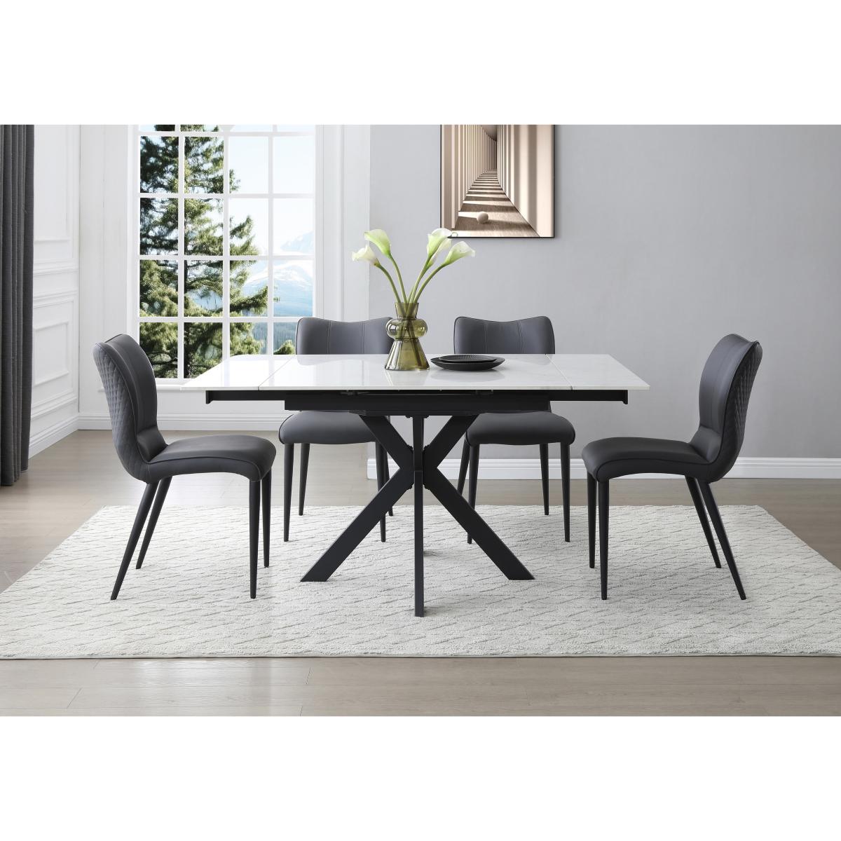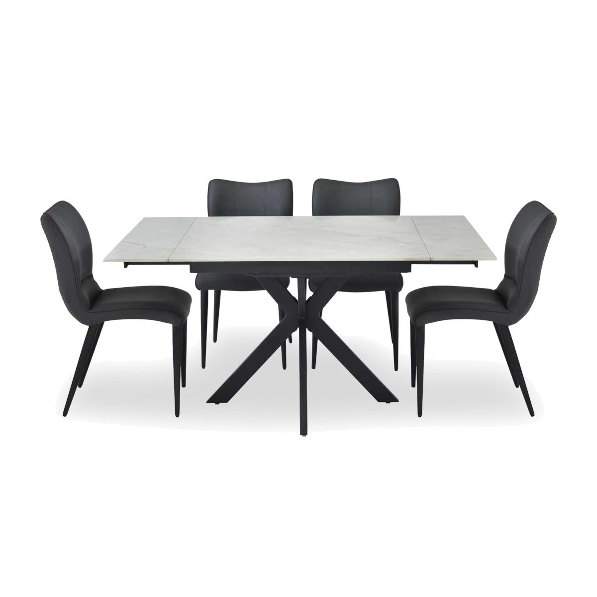 Small is beautiful, and that’s especially true of our Clio range. Thoughtfully designed to suit more compact rooms, this modern collection brings striking ceramic style to living and dining spaces. The square extending dining table can be neatly pushed against a wall until guests arrive, and the occasional tables are the perfect size for compact living rooms. And there’s no doubting the quality of these pieces. Glossy off-white ceramic tops are a full 12 mm deep, and table frames and bases are sturdily made of black metal. The range includes dining sets that feature the collection’s shapely dining chairs. The Clio range is exclusively available at Furniture Village. Designed for compact spaces, the ceramic furniture in our Clio range delivers sleek and striking modern style in abundance. This dining set with four dining chairs is a real showstopper. Why you’ll love it Perfectly proportioned, stylishly ceramic – that’s our Clio collection. Ideal for compact spaces, this dining set features a square extending table. Off-white ceramic top has a high-gloss finish and subtle veining. The finish is as durable as it is beautiful, as ceramic is heat-, scratch- and chip-resistant. So easy to extend. Simply pull on the table ends to draw out 2 extra leaves. Twisted leg base in black metal is stylish and sculptural – and also very practical. This ergonomic design makes more space for diners’ legs. Dining set includes 4 of the range’s very comfortable dining chairs. A standout look with elegant lines and exaggerated curves. Slender black metal legs. Upholstered in soft faux leather with diamond stitching detail on seat backs. Only at Furniture Village. This dining set is part of our Clio range. What you need to know Dining chairs have metal frames and legs, and foam cushioning. Table top is 12 mm ceramic. Metal frame and base. 100 cm dining table seats 4 closed and 6 when extended to 150 cm. Please note that the ceramic patterning on the extension leaves may not match that of the table top. We recommend using coasters and placemats at all times. To clean, simply wipe with a clean damp cloth. Do not use abrasive cleaning products. Item code: CLIODST1DGRY-001