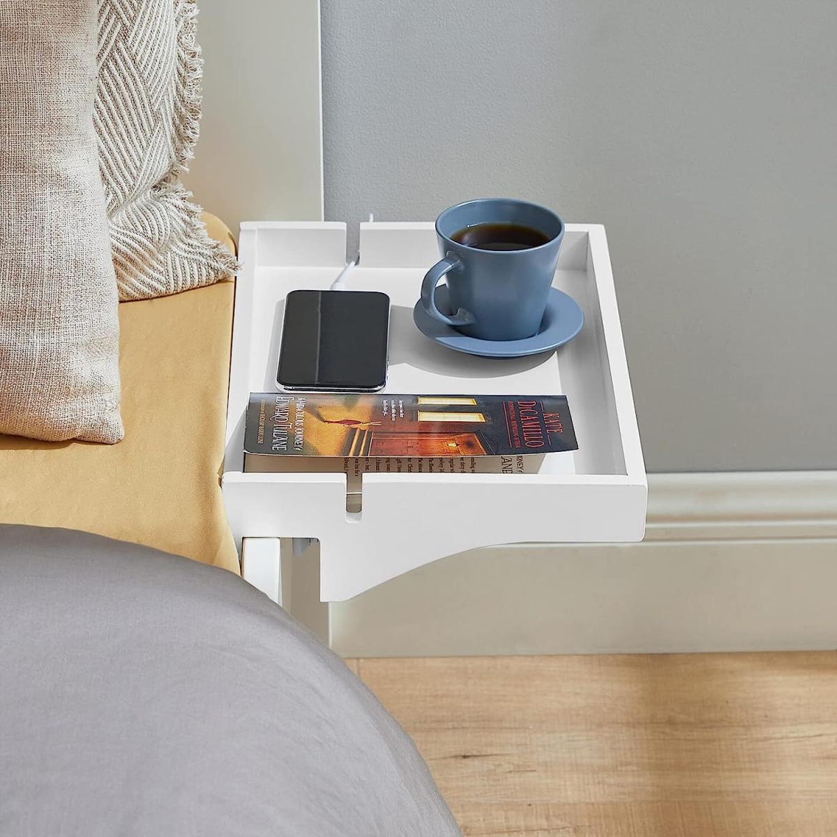 This clip on shelf is a very useful little accessory, suitable for anyone. bedroom, like small bedrooms, bunk beds, cabin beds university dorms. It has 2 cable slots to make charging your device easier. Perfect for store night reading accessories, cups, phone, alarm clock, etc. Can be fit on the rail of the bed. It is a good idea to make full use of the bed frame in a small bedroom, when using bedside table is impossible. The shelf has a simple construction and offers an easy and practical solution for everyday application. Made of high quality bamboo and MDF in white lacquer. Easy to clean and maintain. Lightweight yet sturdy, also space saving. It is a great bedroom storage solution. Material Bamboo, MDF. Dimensions W36 x D25 x H8cm. Weight 1kg. Load capacity 2.5kg. No assembly required. Ready to use. Please note this shelf can be attached to the 1-3cm wide frame of the bed.
