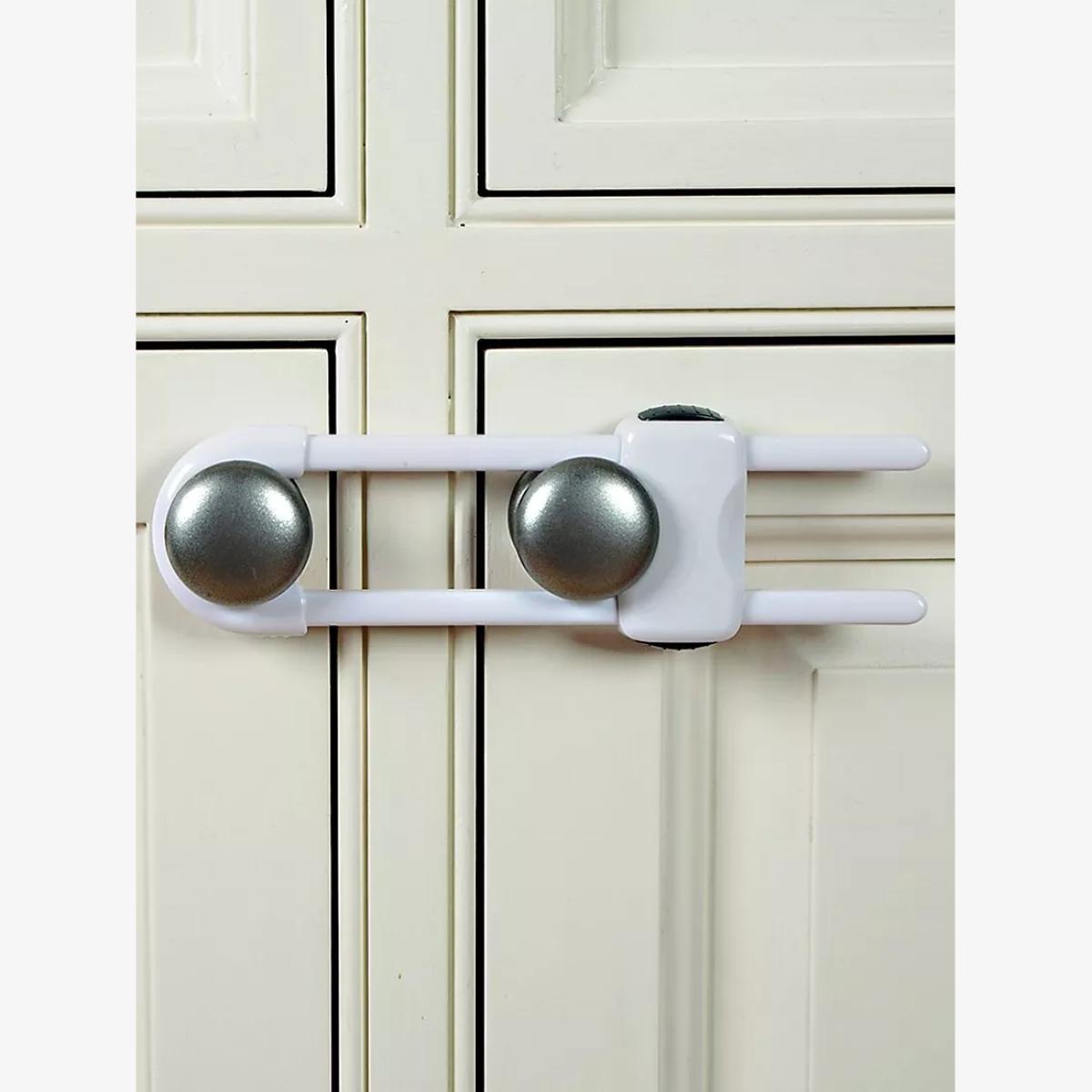 This lock helps keep curious little hands out of double cupboard doors for their safety and your peace of mind.