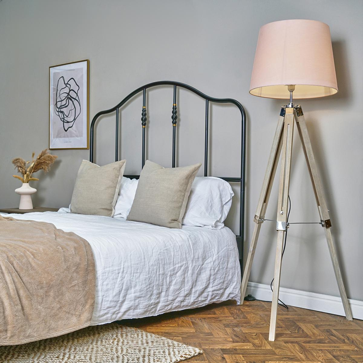 I love this floor lamp for its understated yet versatile style. The warm brown base combined with the dusky pink shade creates a subtle colour palette that works beautifully in both contemporary and more traditional interiors. It’s especially suited to relaxed living rooms, reading nooks, or even bedrooms where a soft, ambient glow is desired. Practical styling tips include placing it beside a cosy armchair or sofa to enhance comfort, or using it to add warmth and texture to neutral schemes. Its tripod design adds a modern touch without overwhelming a space, making it a great statement piece that can anchor a cosy corner or serve as a chic lighting solution in a minimalist setting.