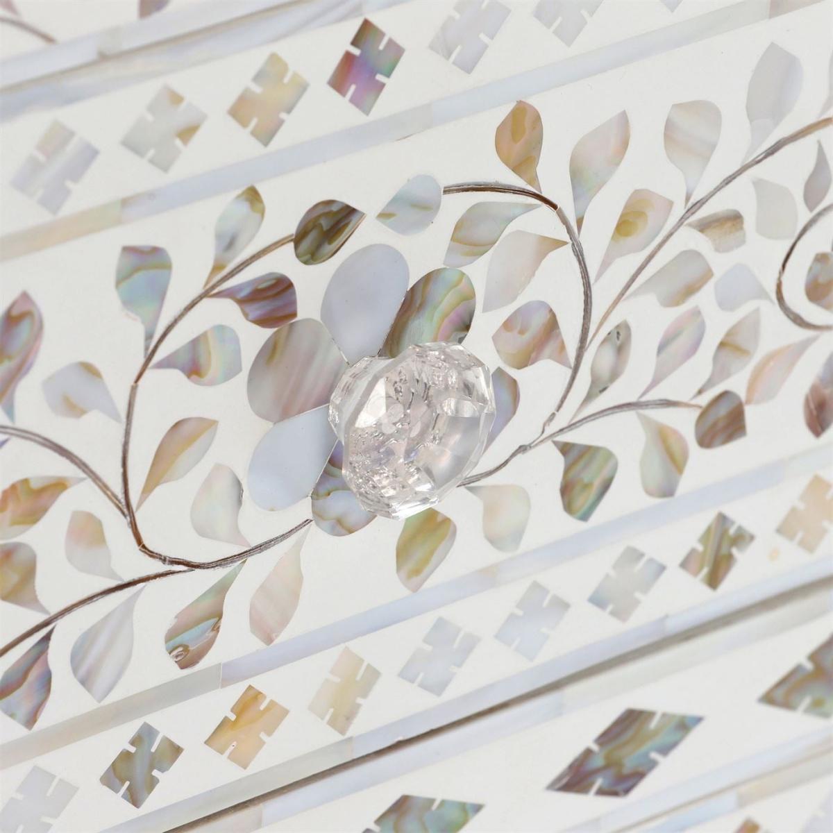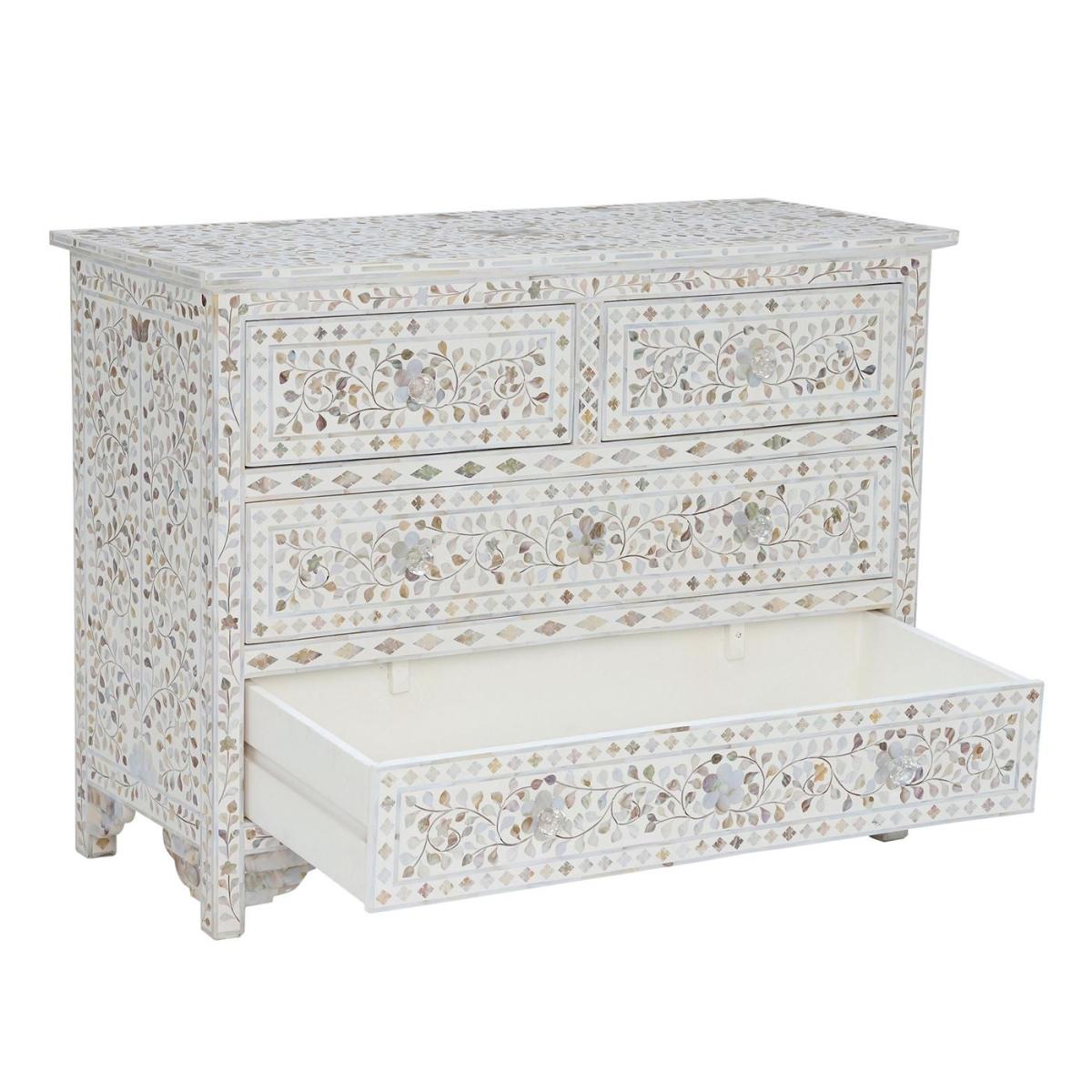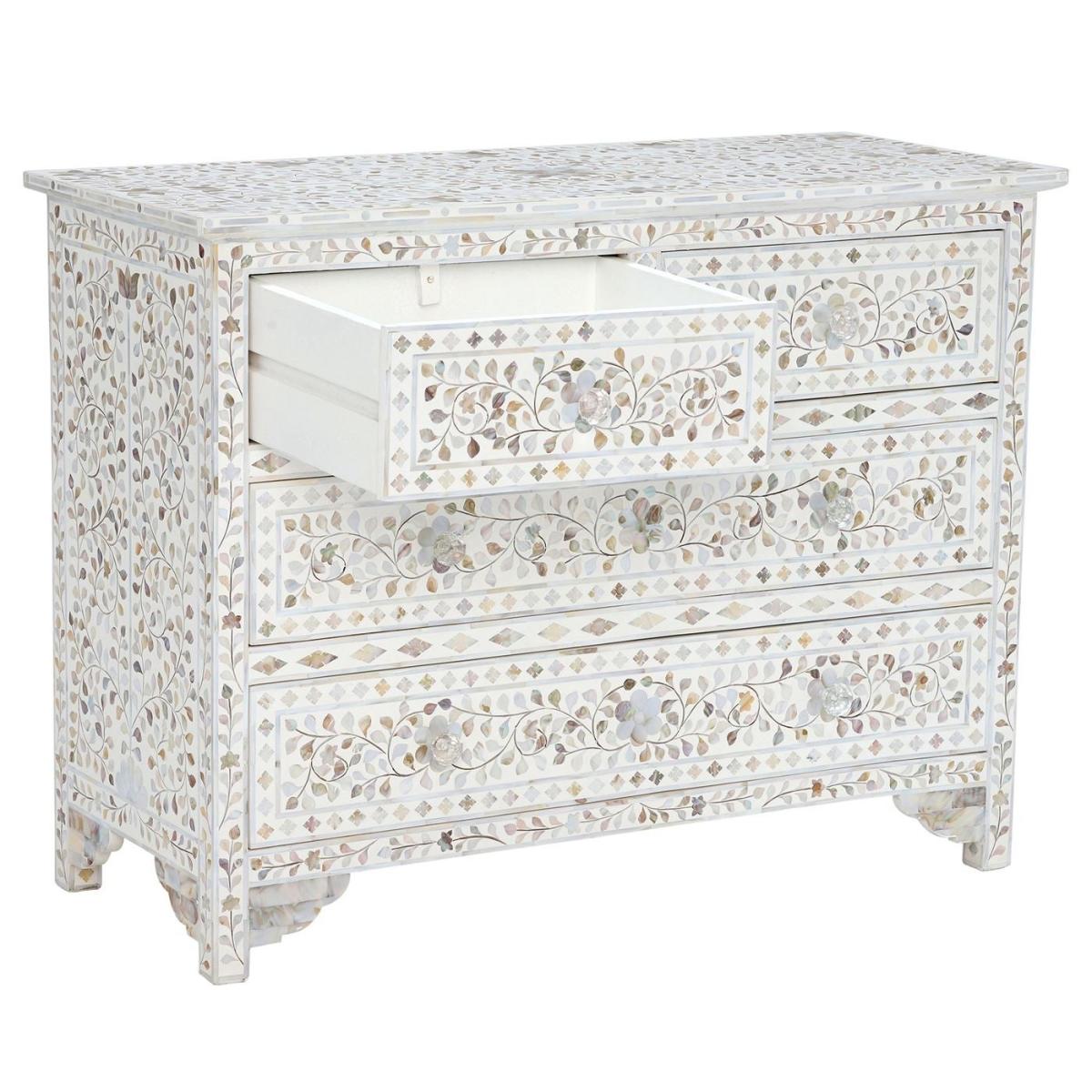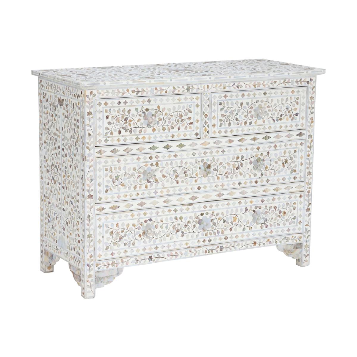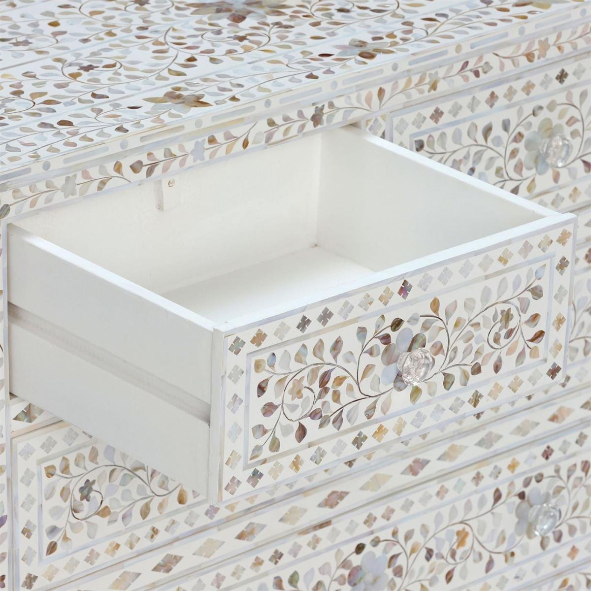 Design. Featuring a bone inlay design with modern influence, this charming chest of drawers boasts a number of intricate shapes woven into white resin. With a gorgeous mother of pearl finish that shimmers from every angle, the Clipper chest of drawers is simply stunning. Unique in every way, each chest is crafted using traditional methods that have been passed down through generations.