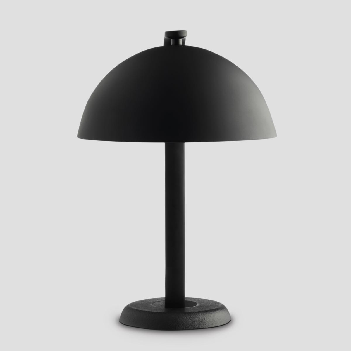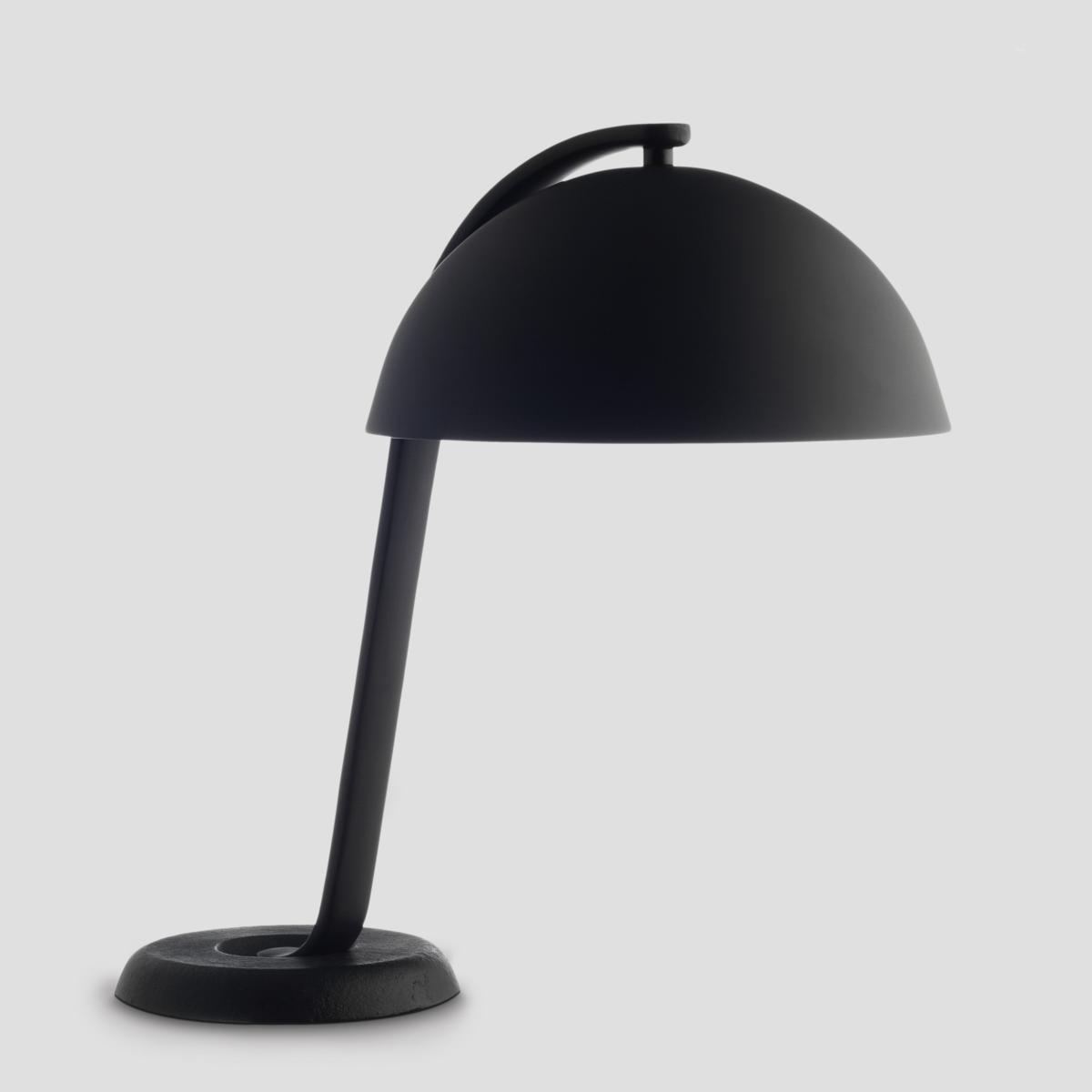 Cloche is a table top lamp providing a directional light. Its black powder coated arm and off-set cast iron base creates a visual imbalance, resembling the suspension of a traditional dining cloche.