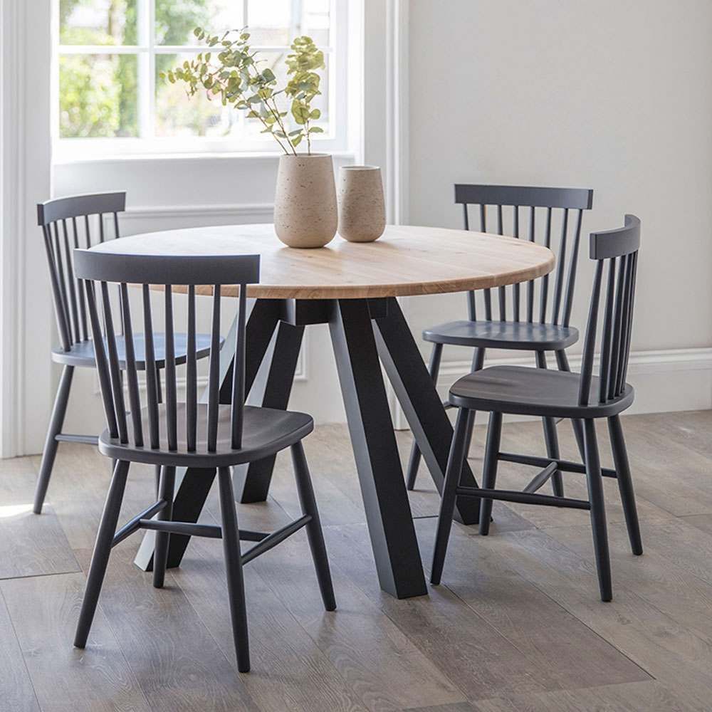 Create a welcoming communal space in your dining room or kitchen with our classic Clockhouse Dining Table. Crafted from solid raw oak the round table surface is unvarnished, allowing you to choose whether to varnish, stain or leave the top entirely natural, depending on your individual interior style. Finished in carbon grey, the four beech wood legs contrast against the soft oak, ensuring this piece will not go unnoticed.