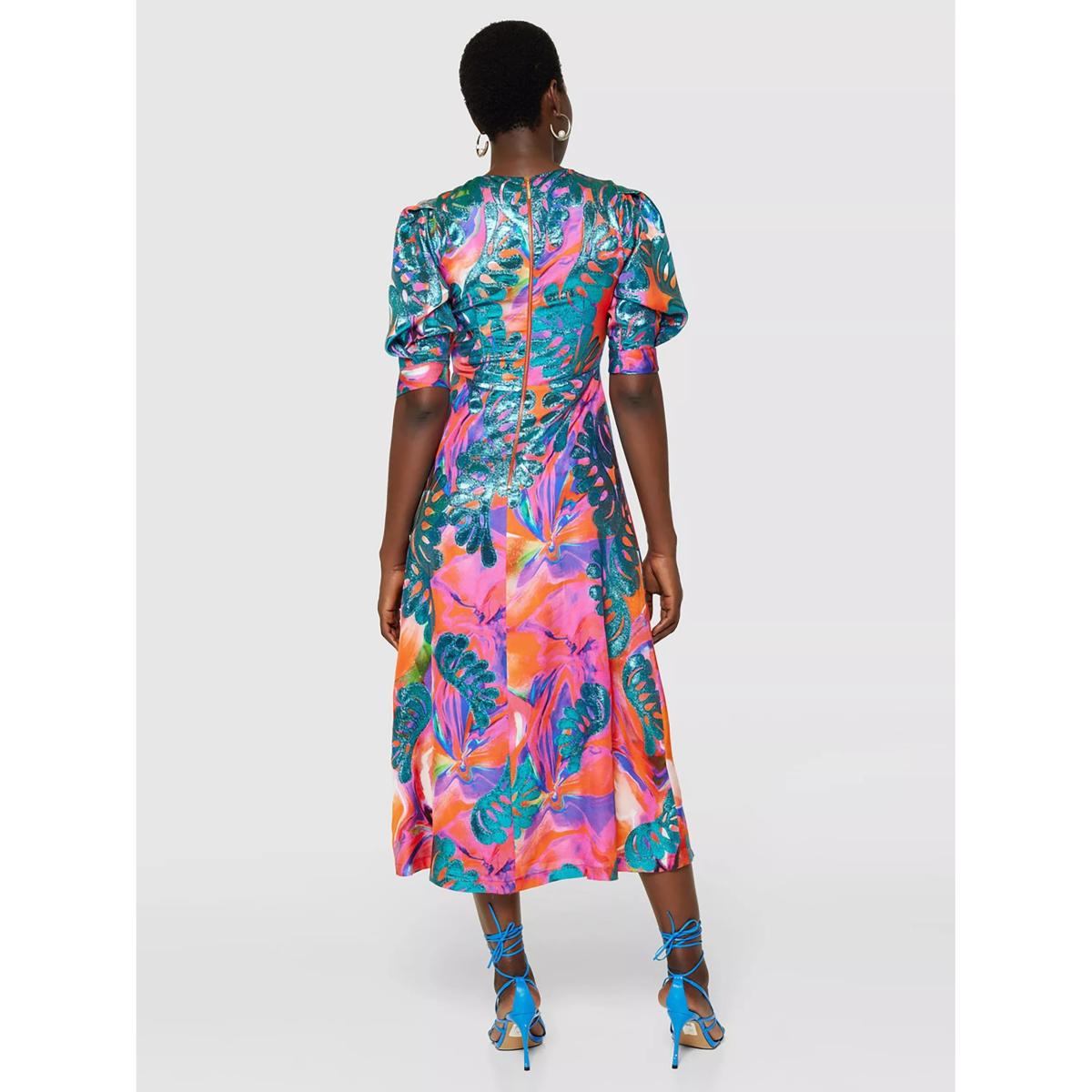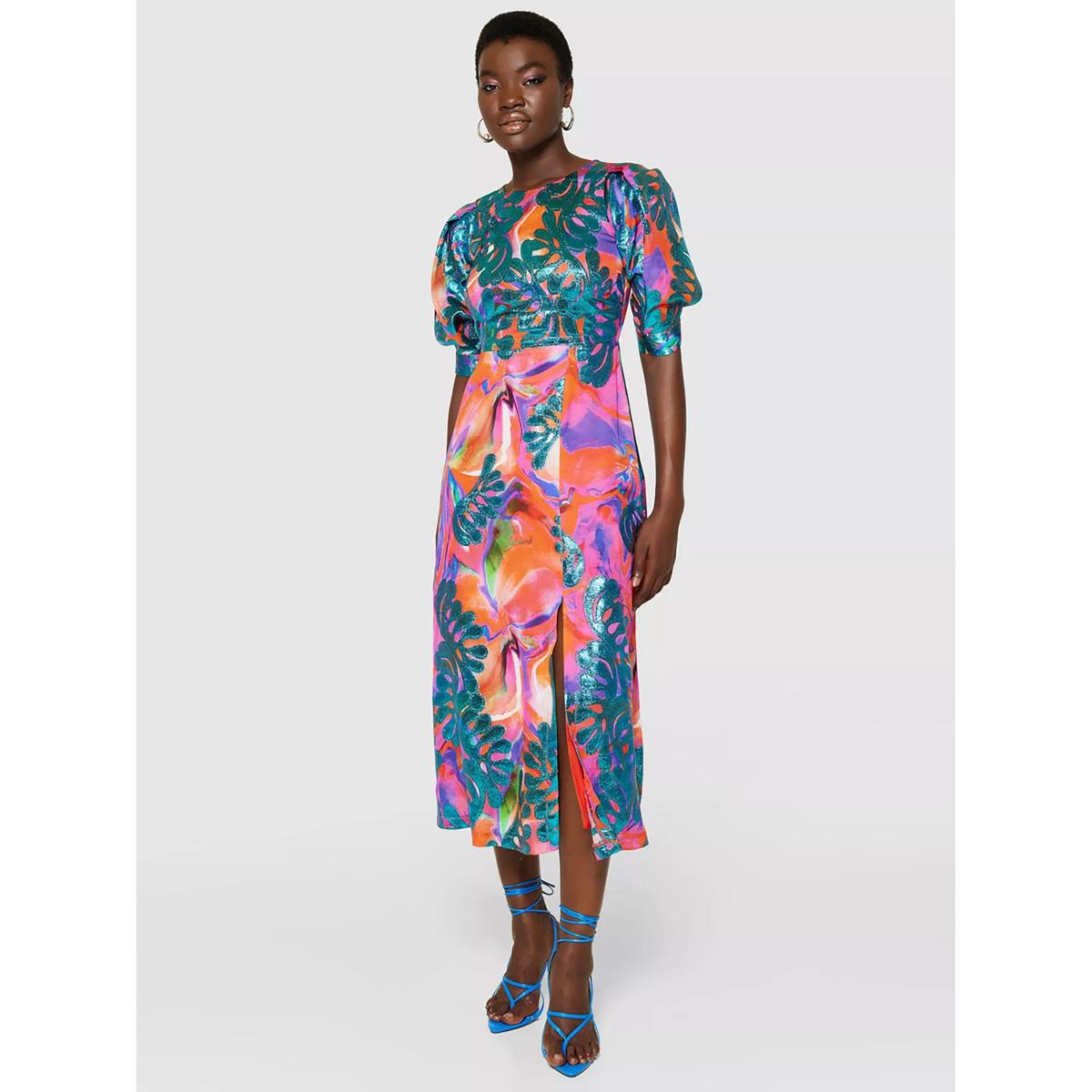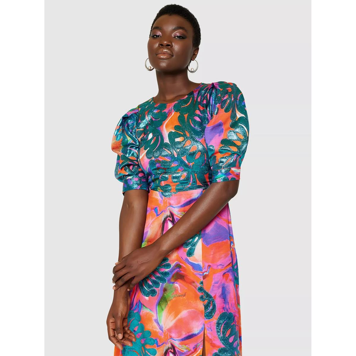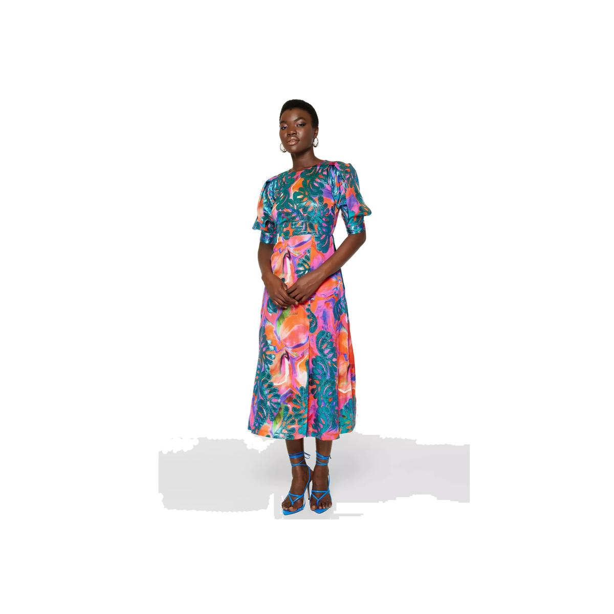 Cut to a flattering A-line shape, this midi dress features puff sleeves and a statement print. Bright and bold with vibrant colours, style it with strappy heels and minimal accessories.