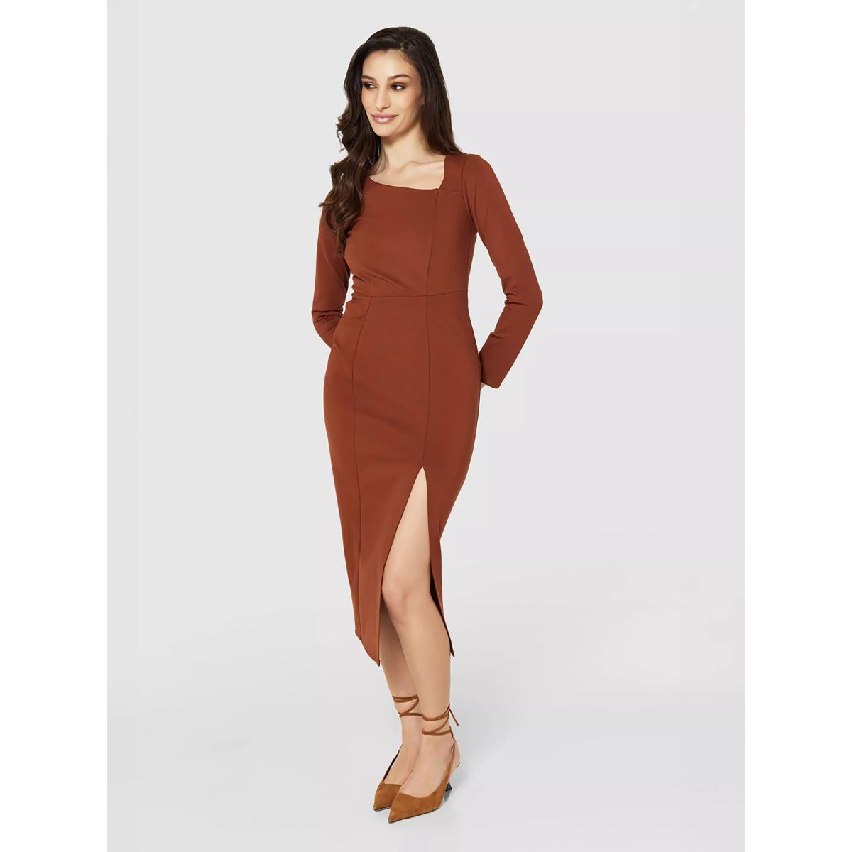 Make a sophisticated statement with this bodycon dress. Featuring a chic square neckline and long sleeves, this figure-flattering dress is designed to accentuate your curves with its tailored fit and stylish front slit. Ideal for both professional and social settings, this versatile dress can be effortlessly paired with heels and minimal accessories for a polished and elegant look.
