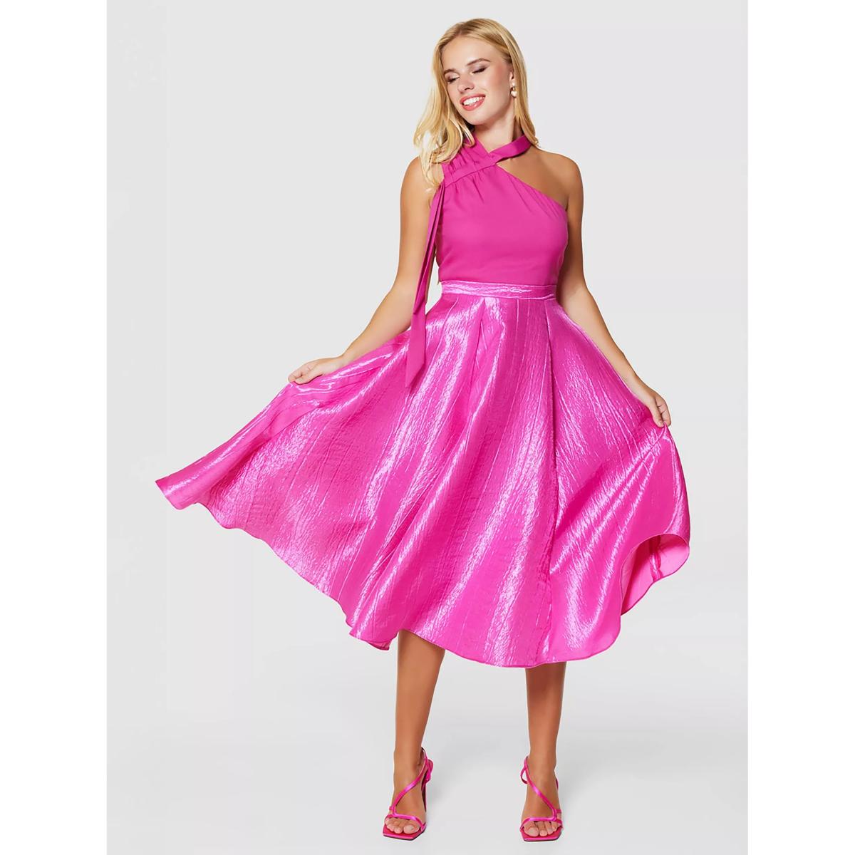 The dress is a bold choice, and I love how its vibrant pink colour can add a lively touch to any wardrobe interior. It pairs beautifully with minimalistic, modern interiors that feature clean lines and neutral tones, allowing the dress to be the statement piece. When styling a space around such a standout garment, consider incorporating subtle accents in similar shades or soft metallics to echo its sheen. Practical tips for wardrobe organisation include incorporating adjustable shelving to accommodate different lengths and layering pieces, ensuring the dress remains the star amid a well-organised, functional environment. This dress works especially well in organised walk-in wardrobes with ample natural light, where its colour can truly shine.