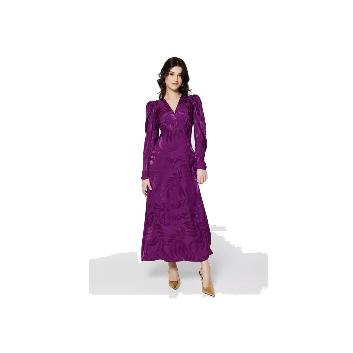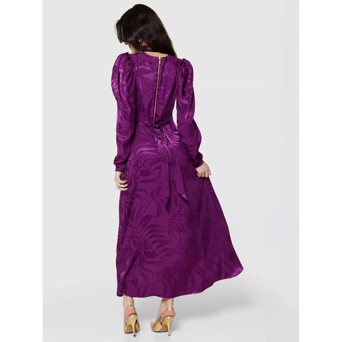 Designed in a viscose jacquard with satin leaver woven into it making it perfect for a dressy occasion. With a shaped waistband that ties at the back, long a=line skirt and draped and pleated sleeves.