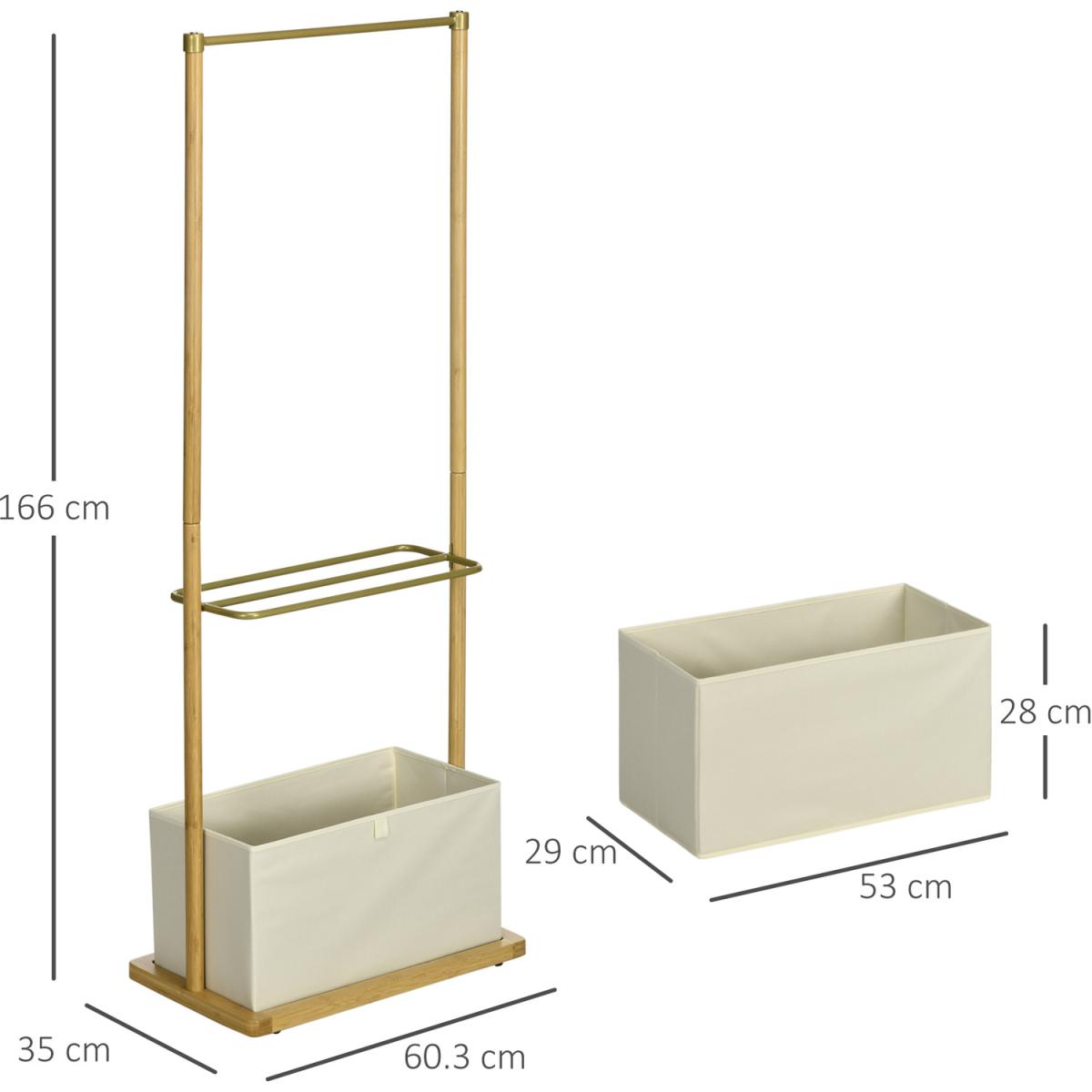 Handy outerwear storage, thanks to this HOMCOM coat rack. A strong bamboo frame with a powder coated metal hanging rail for plenty of support. A middle slatted metal shelf for extra hanging room. Bottom fabric box for protected storage - can be removed whenever. A large base for keeping it weighted and balanced. Use it in the home and office to keep your space tidy and organised.