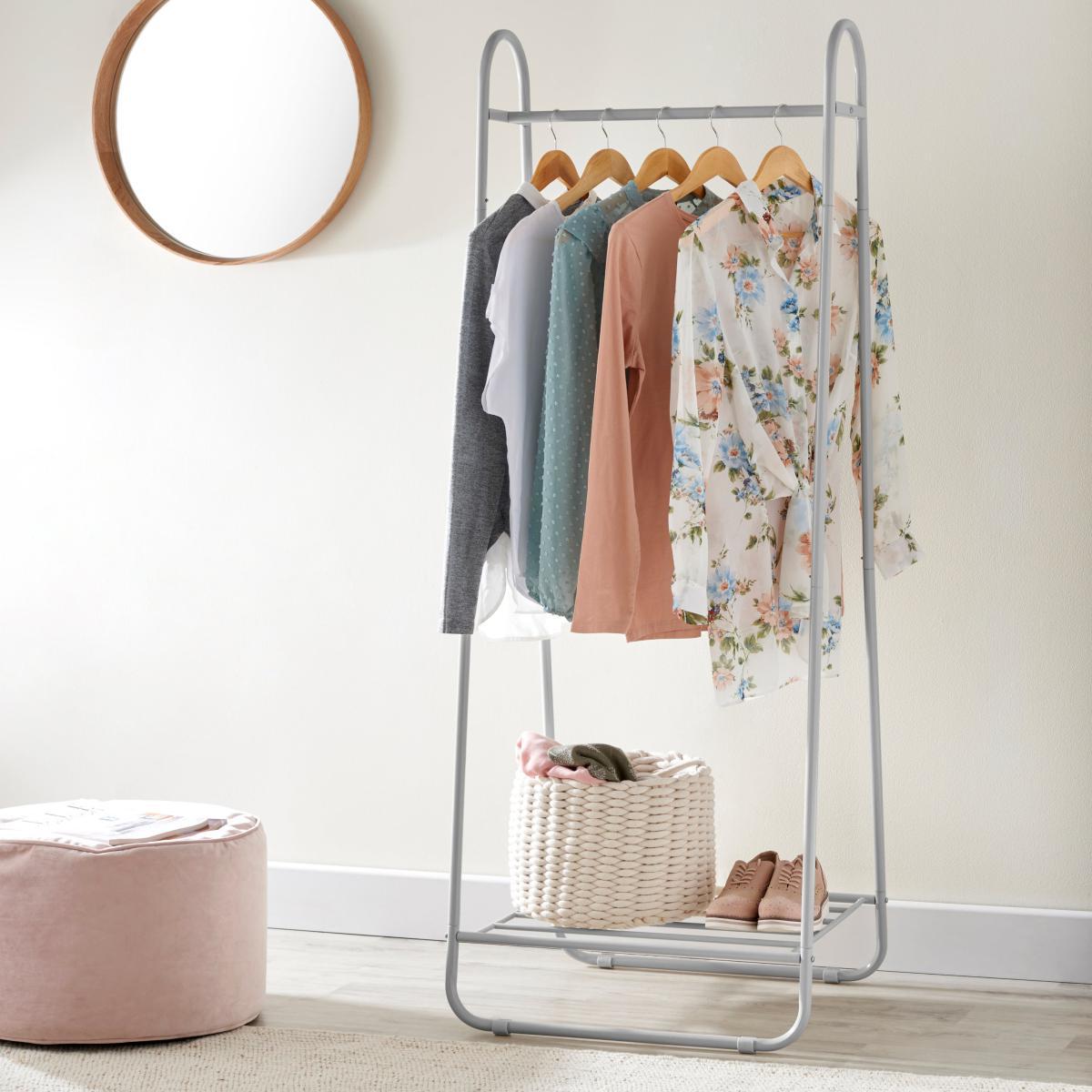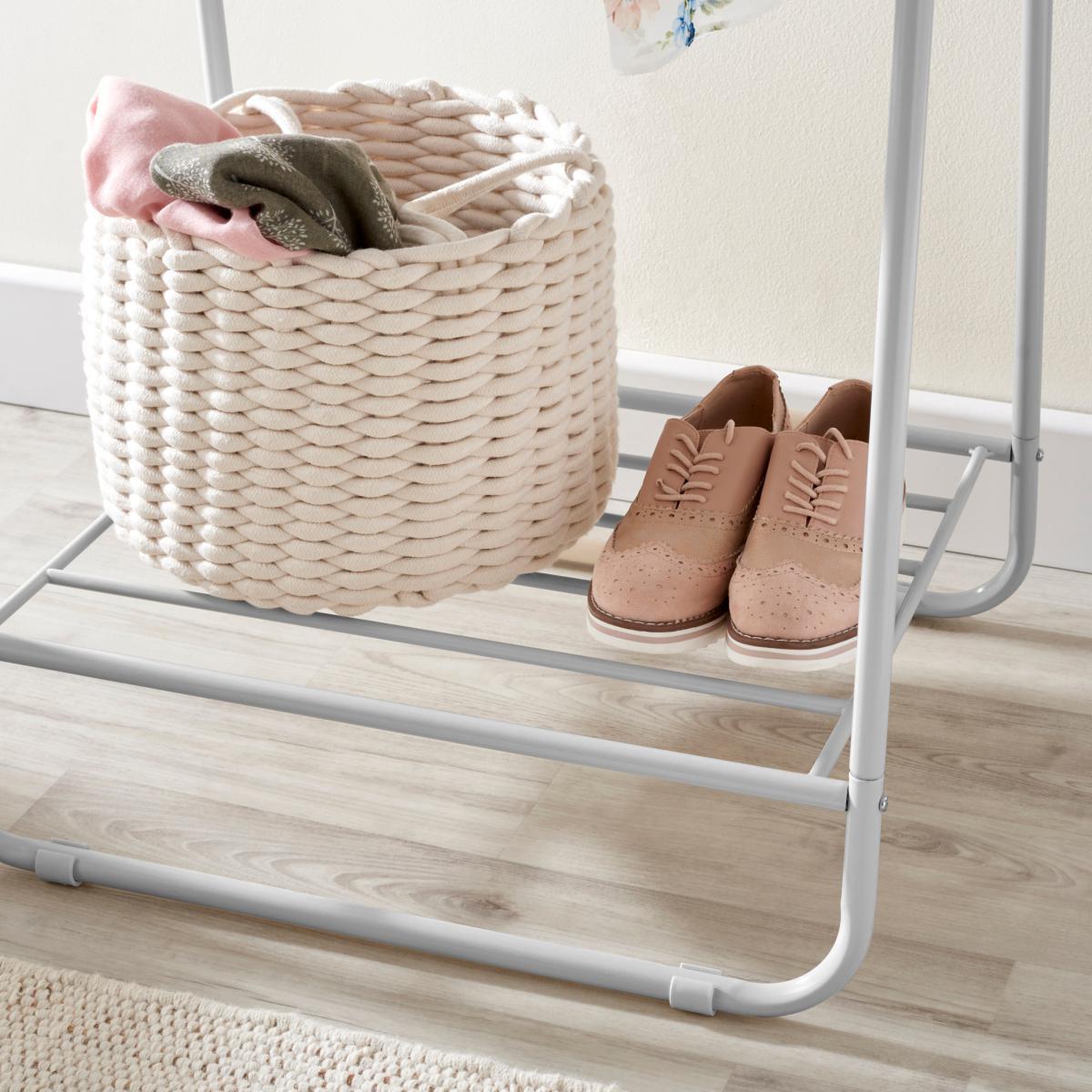 Featuring a modern and minimalist clothes rail with a base storage shelf, a quick and easy storage solution to keep your clothes and shoes nicely organised. This practical rail is made from a powder coated steel structure and plastic, so its stable, sturdy and easy to assemble with simple instructions. This clothing rail is light weight and can hold a maximum weight of 30kg. Its functional design and minimalist style will be perfect for almost every room, with a choice of colours to suit an array of decors.