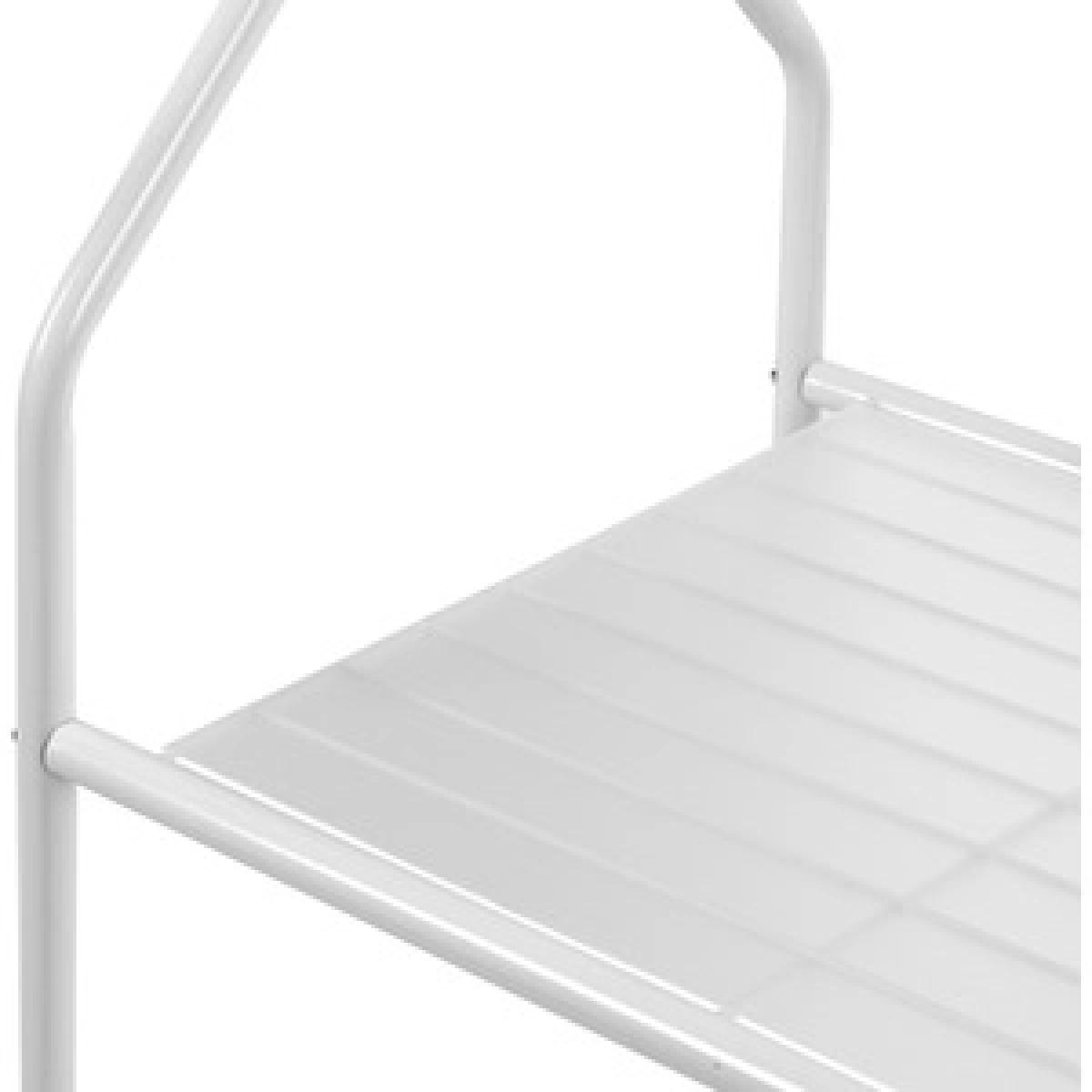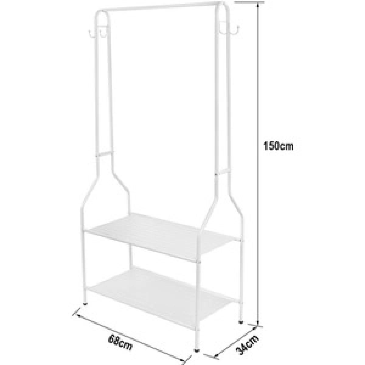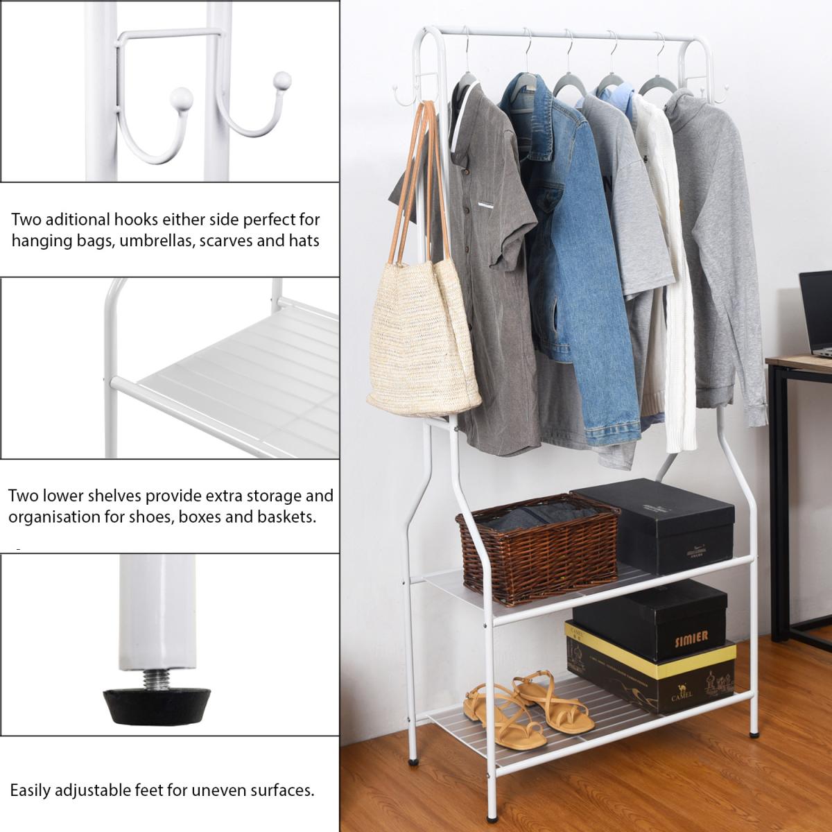 A great alternative to a wardrobe for space saving storage, our white clothes rail with two shelves is perfect for hanging clothes on display. Perfect storage solution not only for your bedroom but for hallways, offices and porches. The sturdy steel design is finished in white powder coating is suitable to compliment all types of decor and adds a beautifully elegant and vintage style to the room. With the addition of two handy hooks on either side perfect for hanging bags, umbrellas, scarves and hats. Also, the two lower shelves provide extra storage and organisation for shoes, boxes and baskets.