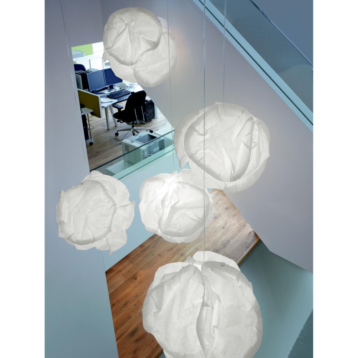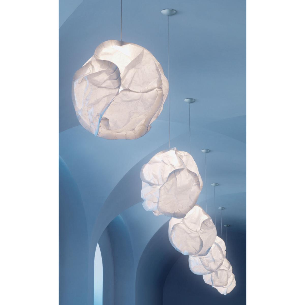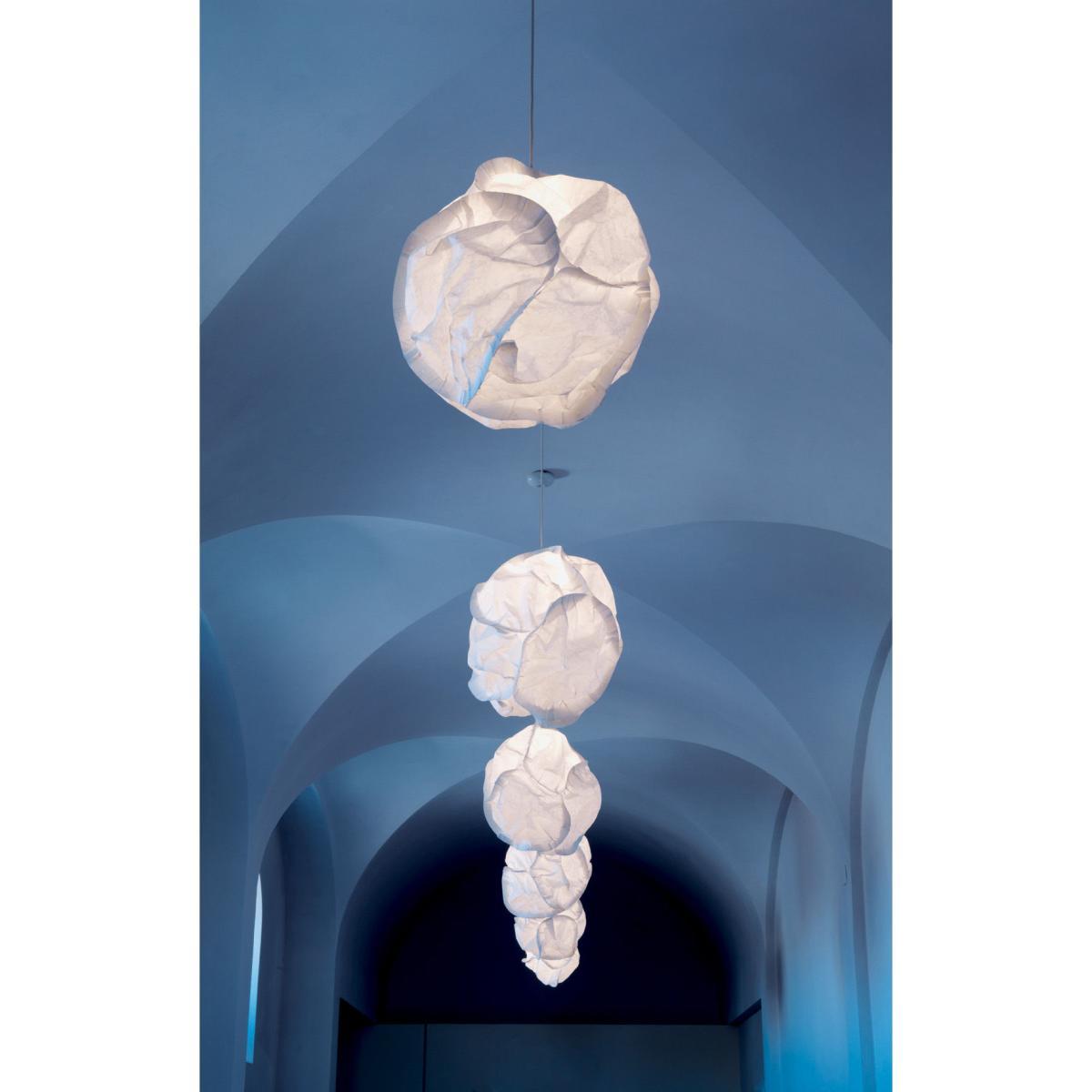 BELUX presents CLOUD, the first lamp designed for serial production by master architect Frank O. Gehry. As both a sculptural lamp and a lamp sculpture, CLOUD is a design concept in which the user becomes co-designer. The design is convincing because of its uncommonly poetic and richly associative visual language, its simple construction and its many applications. The lamps are available in various sizes and models, such as hanging, standing, floor and table lamps. Each lamp has a voluminous yet delicate paper-like shade, in the centre of which is the invisible light source. With its irregular sculptural shape, marked by countless folds, crimps, bulges and dents, it suggests a fleecy CLOUD and then again a large, soft snowball. Looked at more closely, the lampshade consists of several interlinked cup-like elements. Each lamp has an individual note in spite of all lamps having the same structure and the same predetermined shape. The idea is that the fold structure of the shade, which is shaped more or less by accident during production, can be changed by bulging it out or pressing it in. In doing so, Gehry makes users into co-designers who can repeatedly change the shape of the lamp if they so wish. After comprehensive tests, a multiply refined polyester material was developed, which feels and looks like strong fibrous paper. Flexible, tear-free, flame-resistant and aging resistant, this material is easy to clean and therefore ideal for CLOUD.