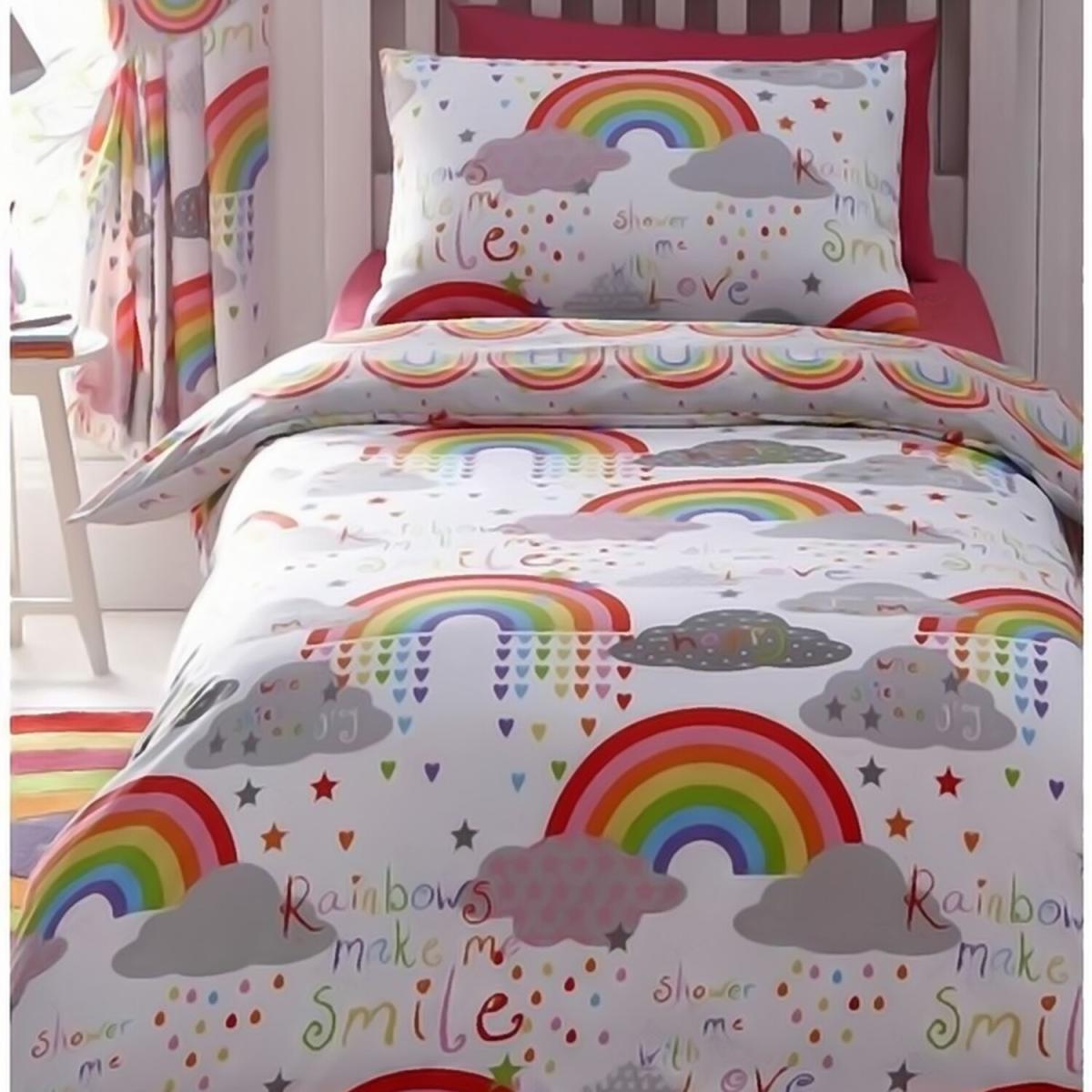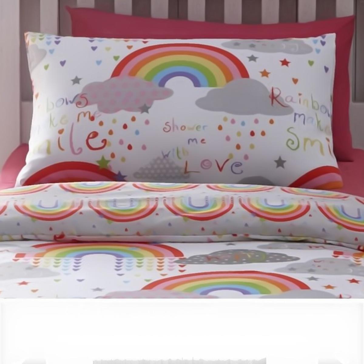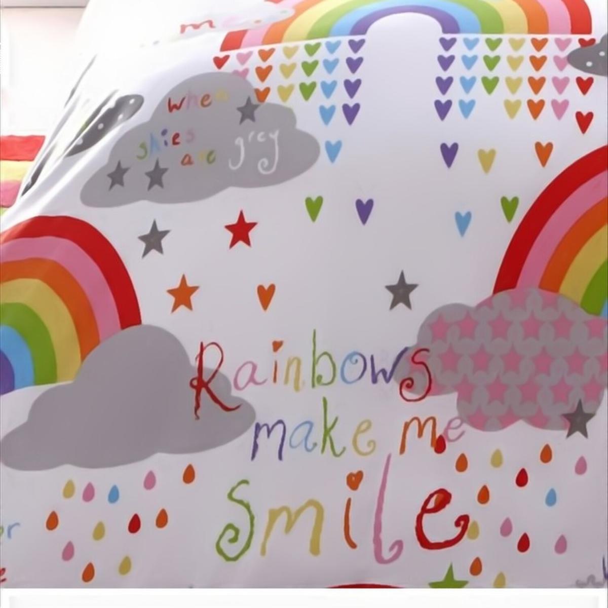 Vibrant and colourful reversible cover with rainbows and fluffy clouds on the front with stars, and love hearts. The reverse has smaller images of the rainbows in a horizontal pattern. The legends 'Rainbows make me smile' and ' Shower me with love' are in multi-coloured font design.