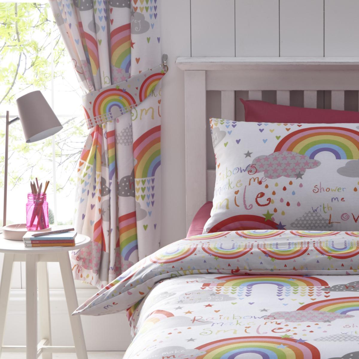 A beautifully illustrated reversible duvet cover of rainbows, rain clouds, and stars all cleverly intertwined with inspiring quotes in crayon coloured text. A rainbow showering stars and hearts on a soft grey background completes the look for the reverse design.