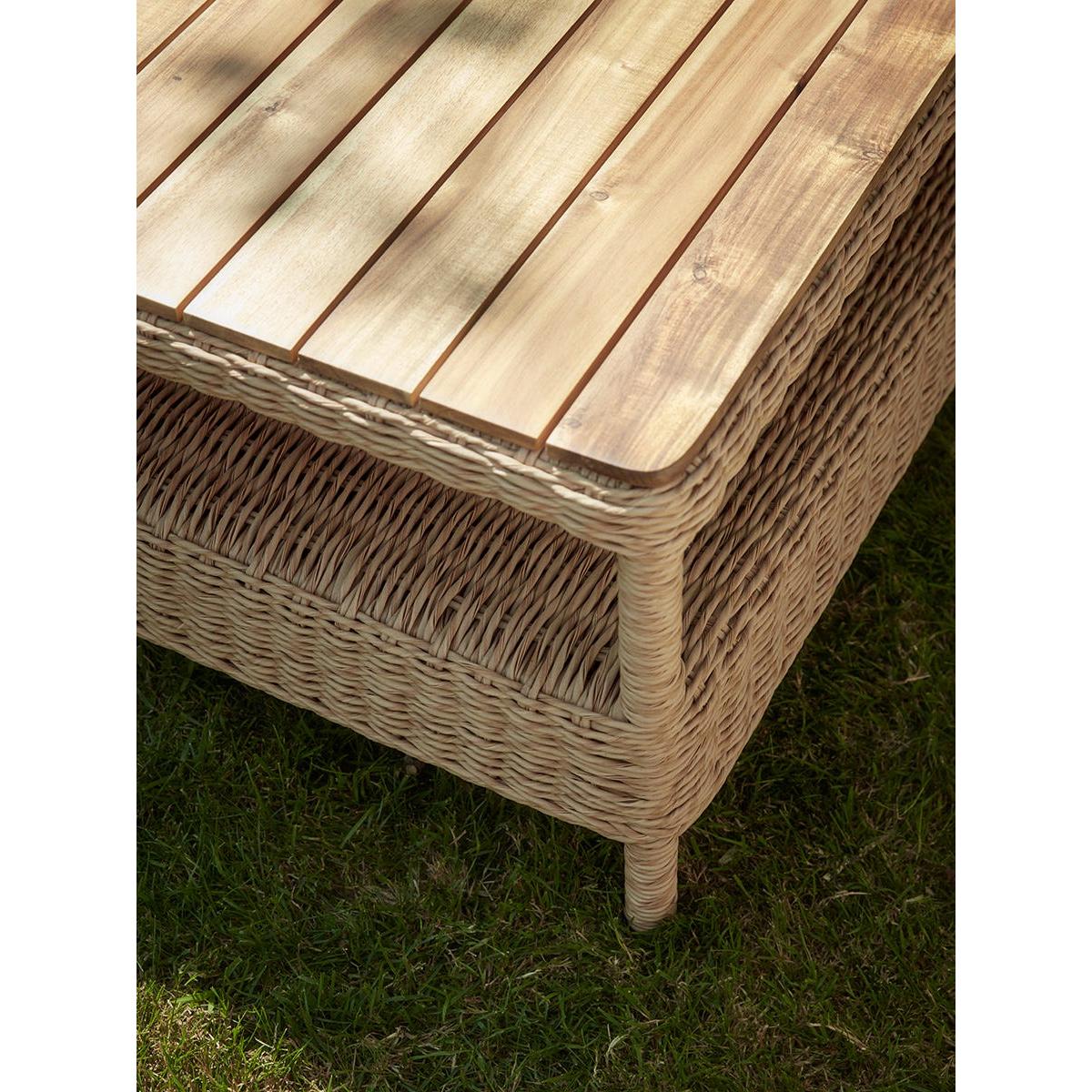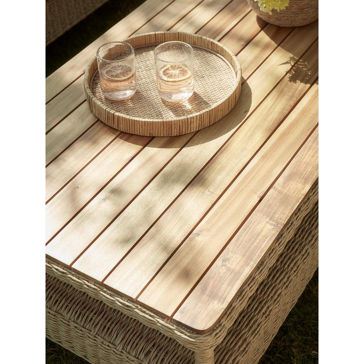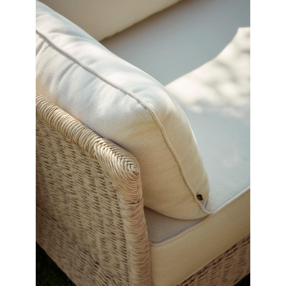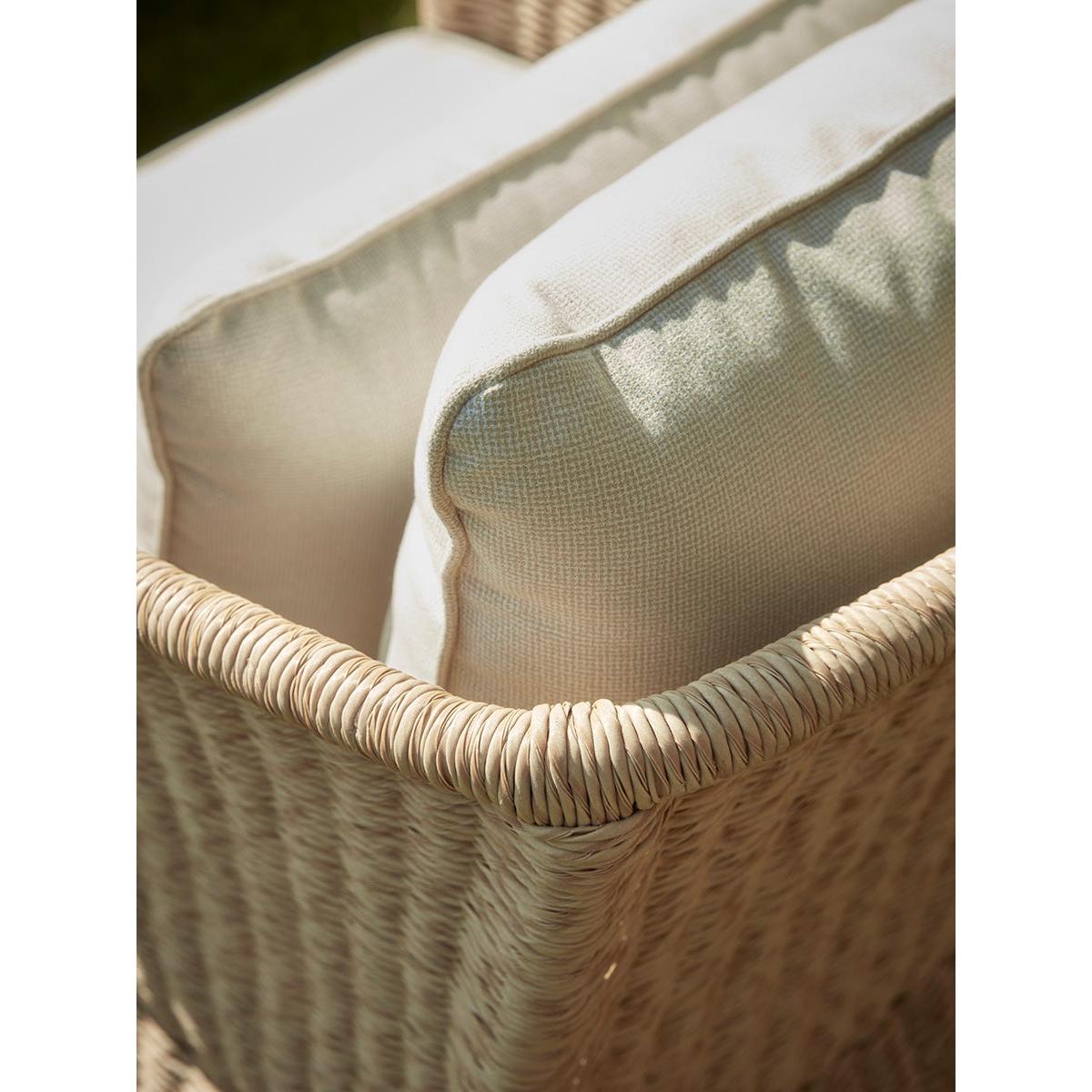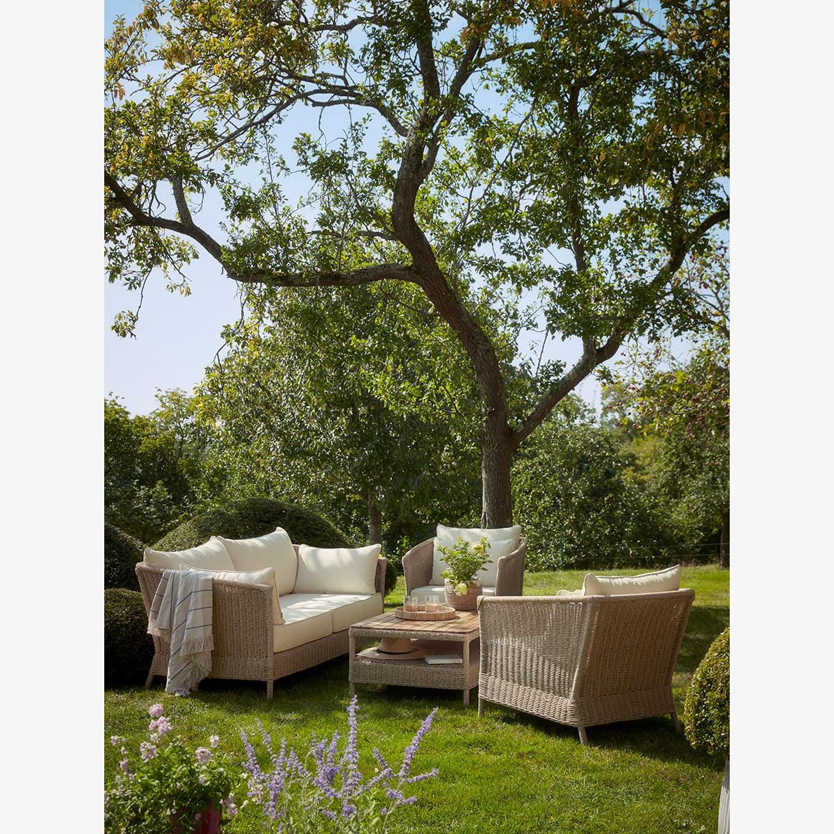 Crafted from a warm acacia wood, a table top that shows off the gorgeous natural patina of the wood sits on top of a wicker frame. A delicately woven wicker also creates the framing of the chairs and sofa in our Clovelly Lounge Set, for a gentle nostalgic feel. Paired with foam filled cushions in a light and refreshing neutral tone, this garden furniture is as comfortable as it is stylish, making it the perfect place for you and your guests to enjoy the summer evenings.