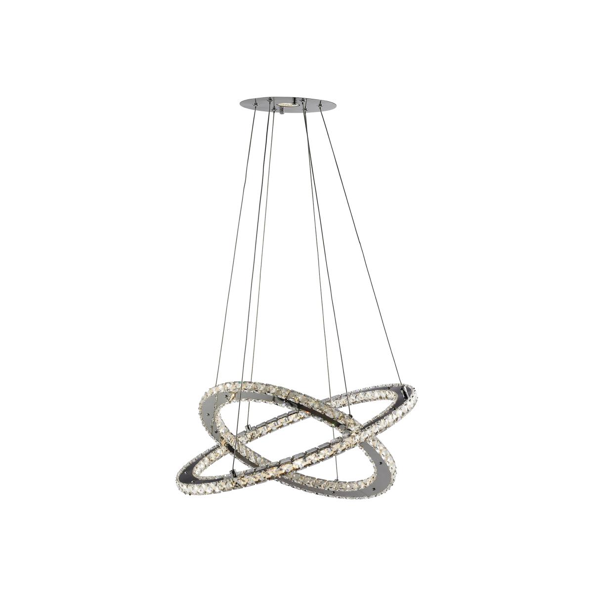 The Clover chrome 168 LED 2 ring pendant light with clear crystal decoration looks absolutely stunning on the ceiling of any living space. The two chrome finish intertwining rings are adorned with crystal squares and they are fully adjustable so the rings can be positioned at different angles for different lighting effects, adding a large touch of glamour to any room.