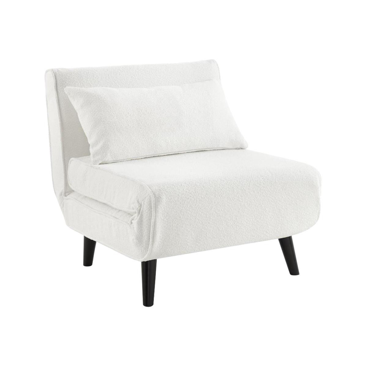Introducing the Clover single seater sofa. Clover features a fold-out cushion body to create a chaise longue feature and a clic-clac reclining backrest, which offers multiple angles to suit your needs. Clover has a matching cushion which can double up as a pillow, and it stands on wooden legs. Clover is available in white boucle, pink and gold cord, and grey and blue teddy jumbo cord. Keep your sofa looking great by vacuuming it once a week on a low setting using the upholstery attachment of your vacuum cleaner or using a soft hand brush to fluff up the fibres. Regularly plump and fluff cushions to maintain their shape and prevent sagging. Be mindful of food and drinks around your sofa bed. If spills occur, clean them up immediately to prevent stains. Delivered by our friendly couriers within 1-3 working days. The courier will deliver to the main door of the building only on an all-day 7 am to 7 pm service, with no time slots provided.