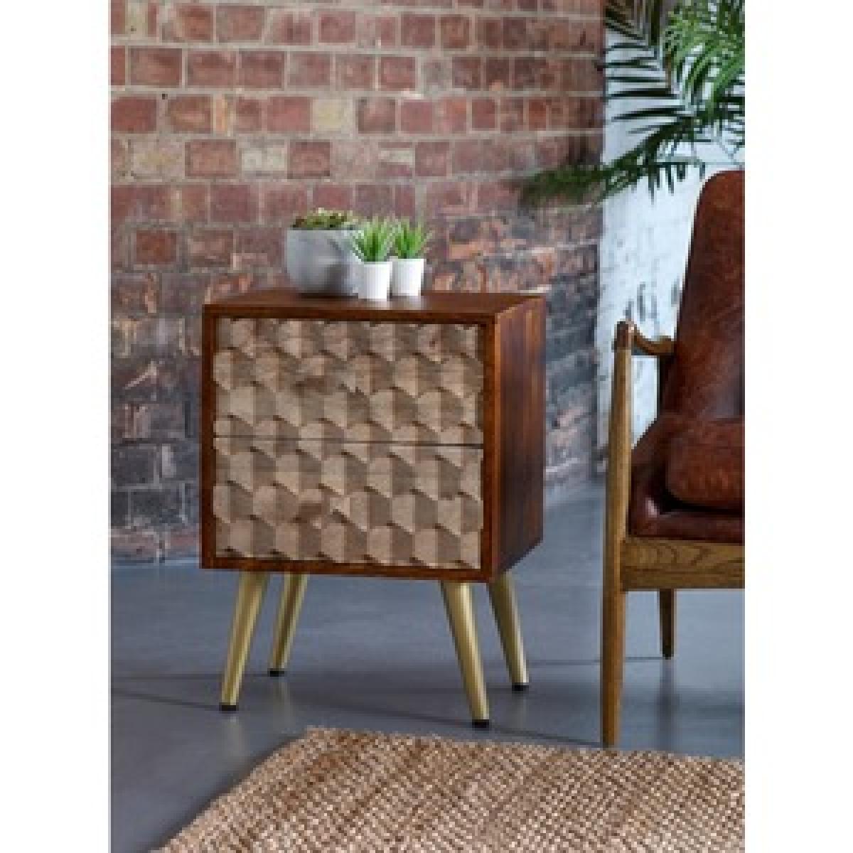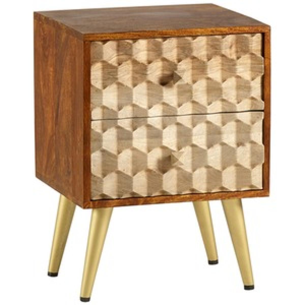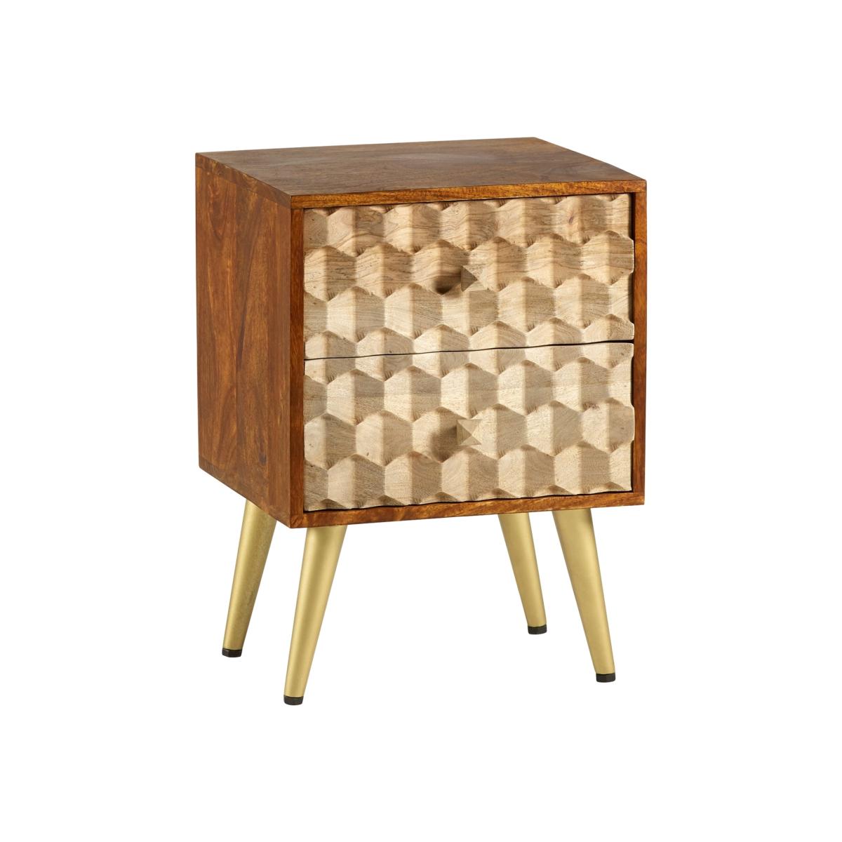 Handmade entirely from solid Mango Wood the side table boasts 2 good sized drawers with subtle matching knobs. It has a 3-tone colour featuring CNC cuts on the front and stylish gold metal angled legs. Designed to blend in and compliment any style of interior, this side table works well as an individual item or paired with other pieces from the wide range available. You will certainly receive plenty of compliments from anyone viewing this unique modern piece of furniture. An eco-friendly, versatile range, handmade by skilled craftsmen in India, combining the beautiful Mango Wood with Reclaimed Metal.