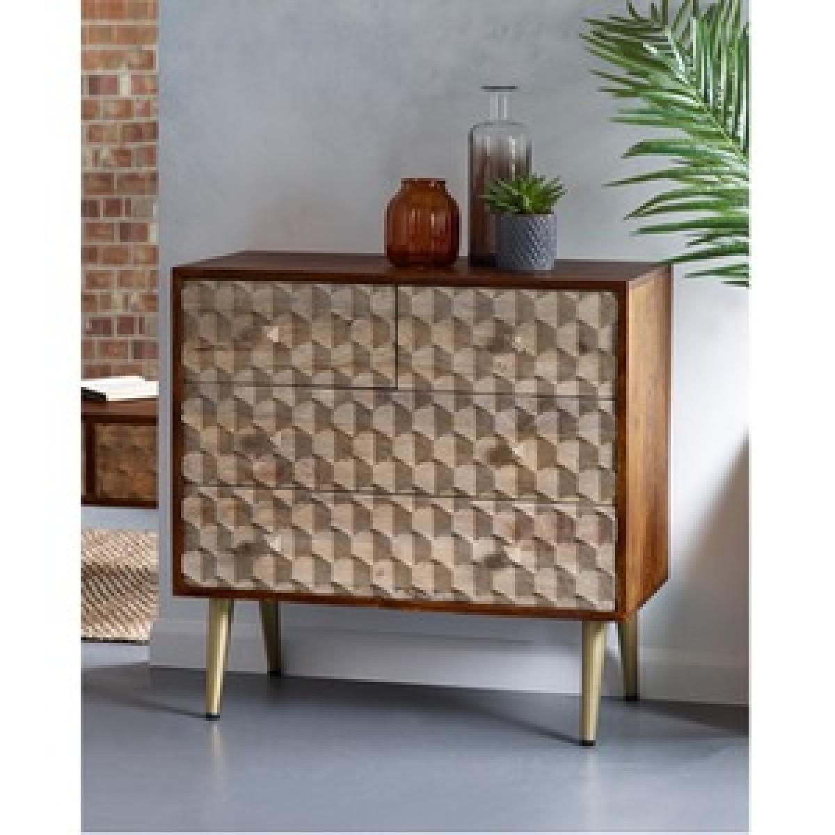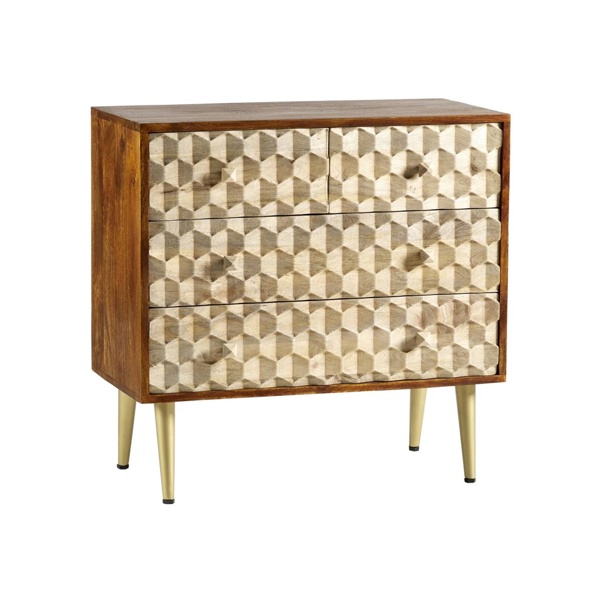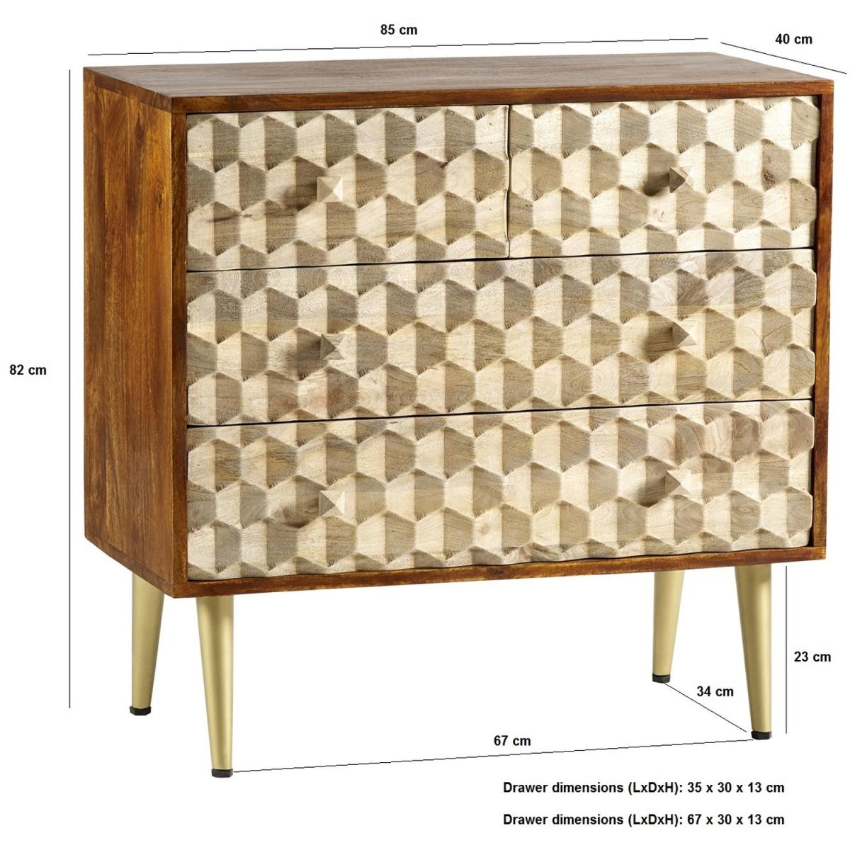 This CNC Retro 4 drawer chest has been handmade using solid Mango Wood throughout and gold-coloured angled metal legs. The natural features and grain of the wood are complemented by a unique CNC cut to the cupboards and subtle matching knobs making it an elegant focal piece in your room of choice. The 4 drawers consist of 2 smaller drawers at the top with 2 longer drawers below and are large enough to solve your storage problems anywhere in the house letting the 3-tone finish blend in with any existing furniture or decor giving your home warmth and style.