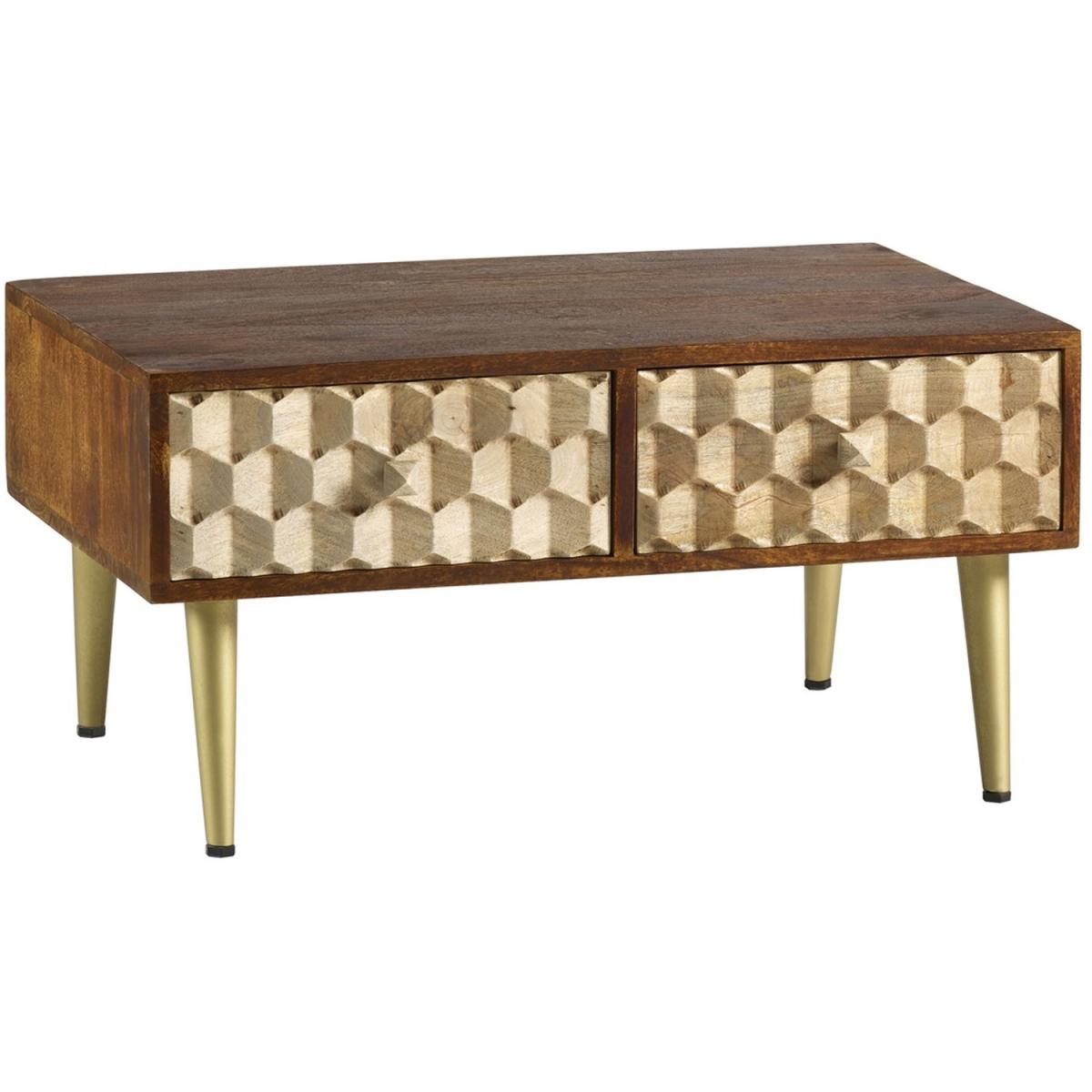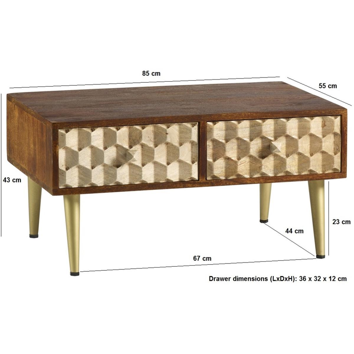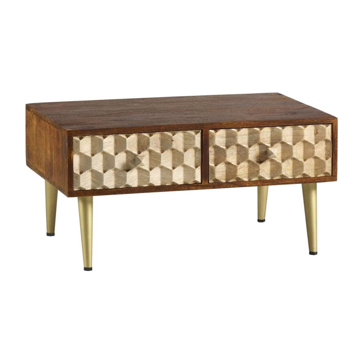 Handmade using solid Mango Wood throughout and gold coloured angled metal legs, the natural features and grain of the wood are complemented by a unique CNC cut to the drawers with subtle matching knobs. Whilst adding a beautiful design feature, the 2 good sized drawers are perfect for storing books, candles, coasters and an abundance of other items you want out of sight but close to hand. Giving an inspirational take on the Scandinavian style your coffee table will blend in with your decor but will also be a major talking point amongst guests. This coffee table is ideal as a single item or simply add other pieces from the wide range of CNC Retro products available to complete your room.