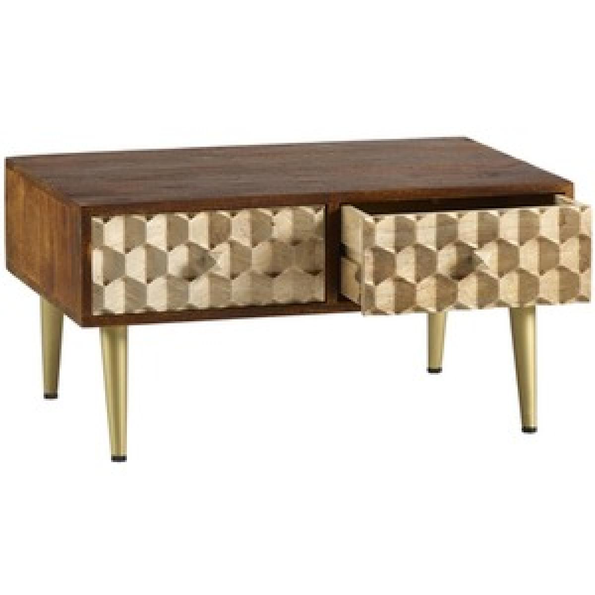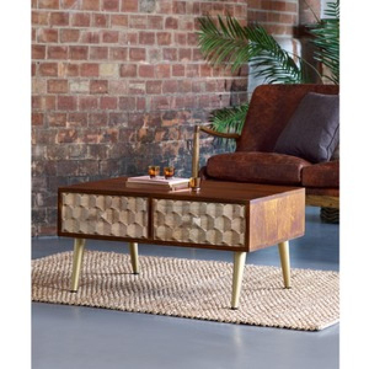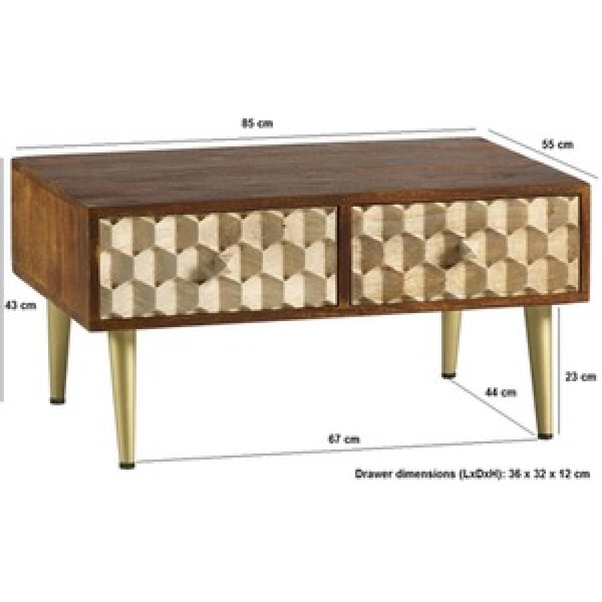 Handmade using solid Mango Wood throughout and gold coloured angled metal legs, the natural features and grain of the wood are complemented by a unique CNC cut to the drawers with subtle matching knobs. Whilst adding a beautiful design feature, the 2 good sized drawers are perfect for storing books, candles, coasters and an abundance of other items you want out of sight but close to hand. Giving an inspirational take on the Scandinavian style your coffee table will blend in with your decor but will also be a major talking point amongst guests. This coffee table is ideal as a single item or simply add other pieces from the wide range of CNC Retro products available to complete your room.
