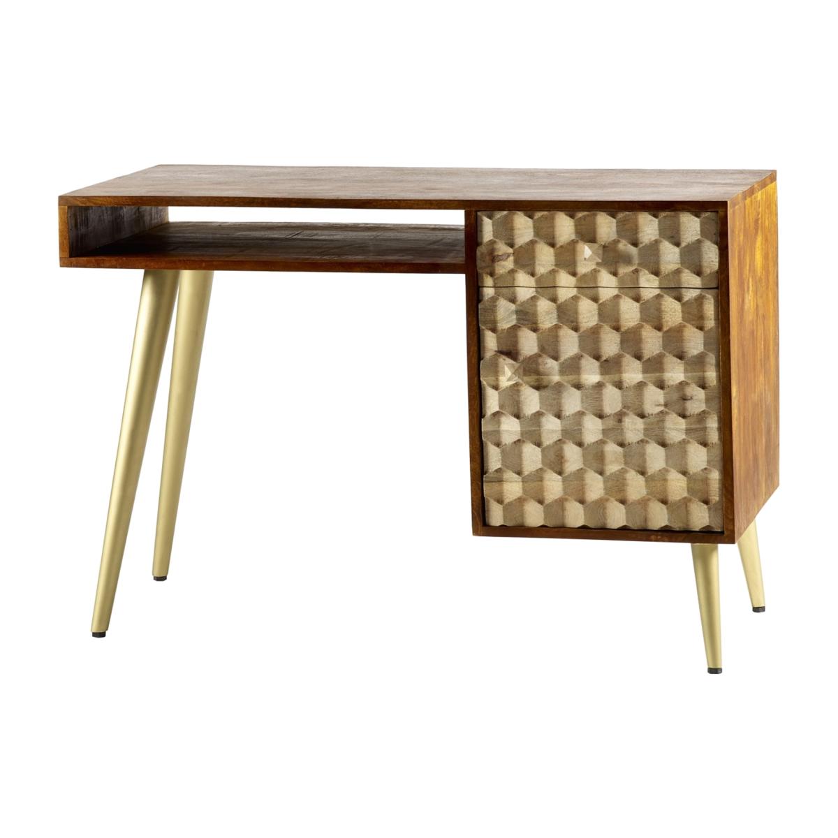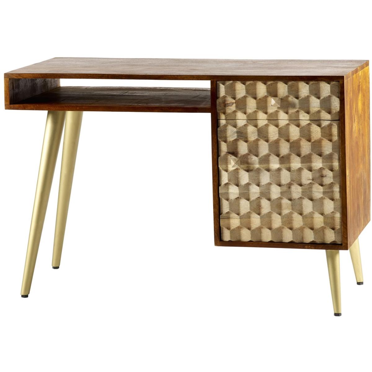 Made from 100% solid hardwood and reclaimed metal, this beautiful Desk features 2 drawers, 1 opens shelf and 1 door and it is complemented with wooden square handles, and gold metal legs.
