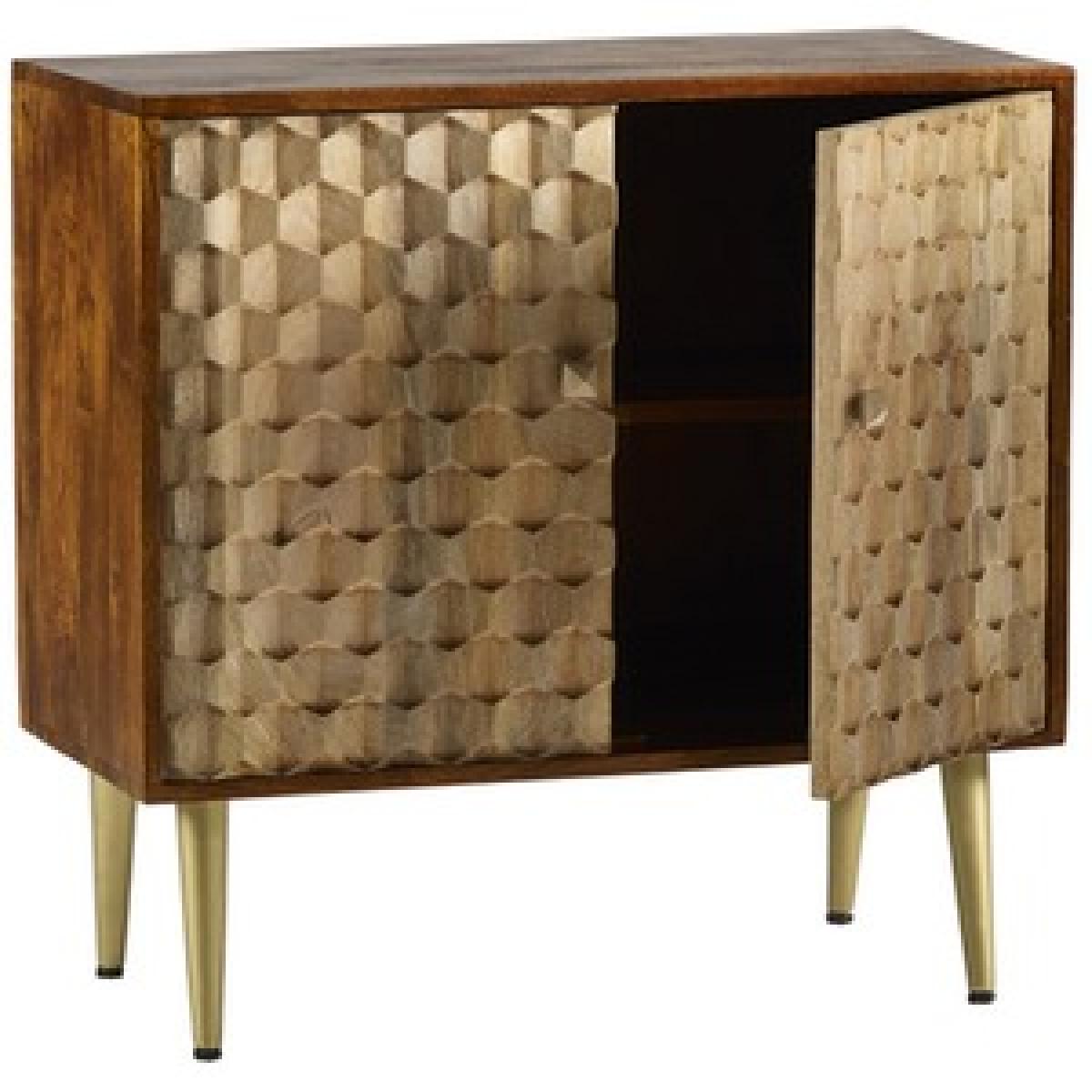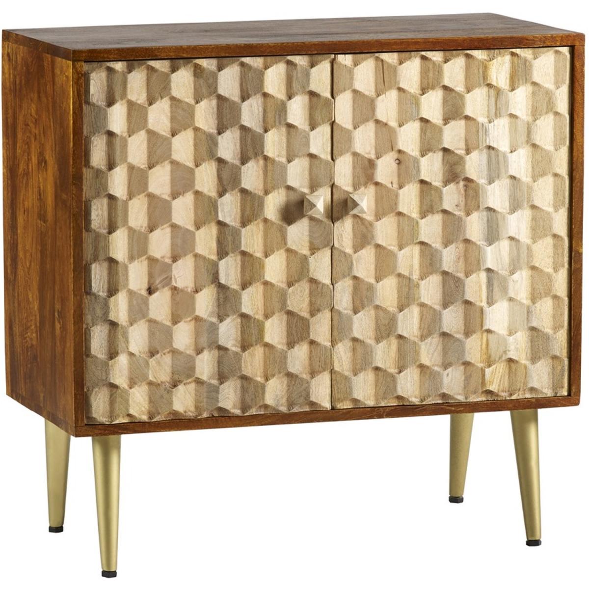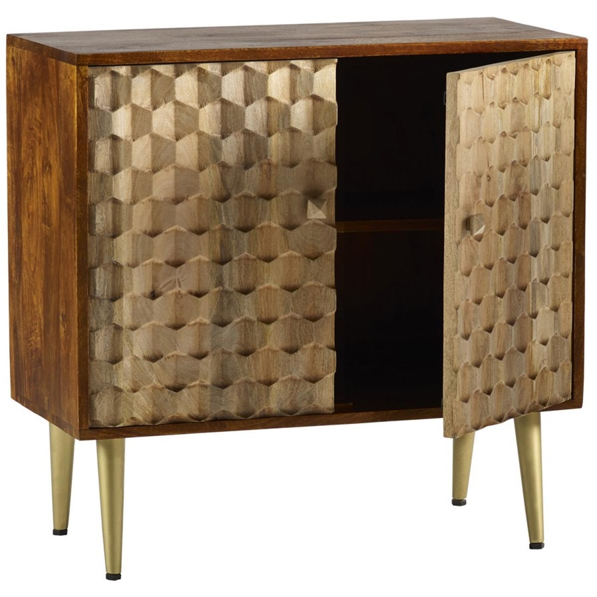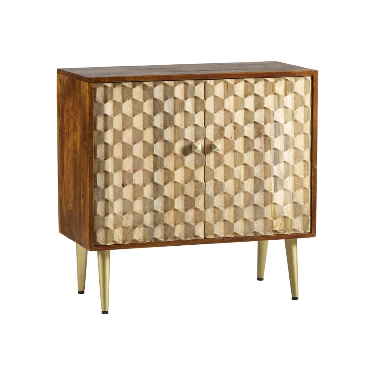 Handmade using solid Mango Wood throughout and gold coloured angled metal legs, the natural features and grain of the wood are complemented by a unique CNC cut to the cupboard doors with subtle matching knobs. The size and look of this sideboard make it a versatile item that can be placed anywhere in your home as it is designed to blend in and compliment any decor. The internal shelf is removable if you are looking for a large storage sideboard or works equally well as an area for books, games, DVDs and so much more This sideboard is ideal as an individual item or pair with other pieces from the wide range of CNC Retro products available to transform your room and provide a modern yet elegant look. An eco-friendly, versatile range, handmade by skilled craftsmen in India, combining the beautiful Mango Wood with Reclaimed Metal.
