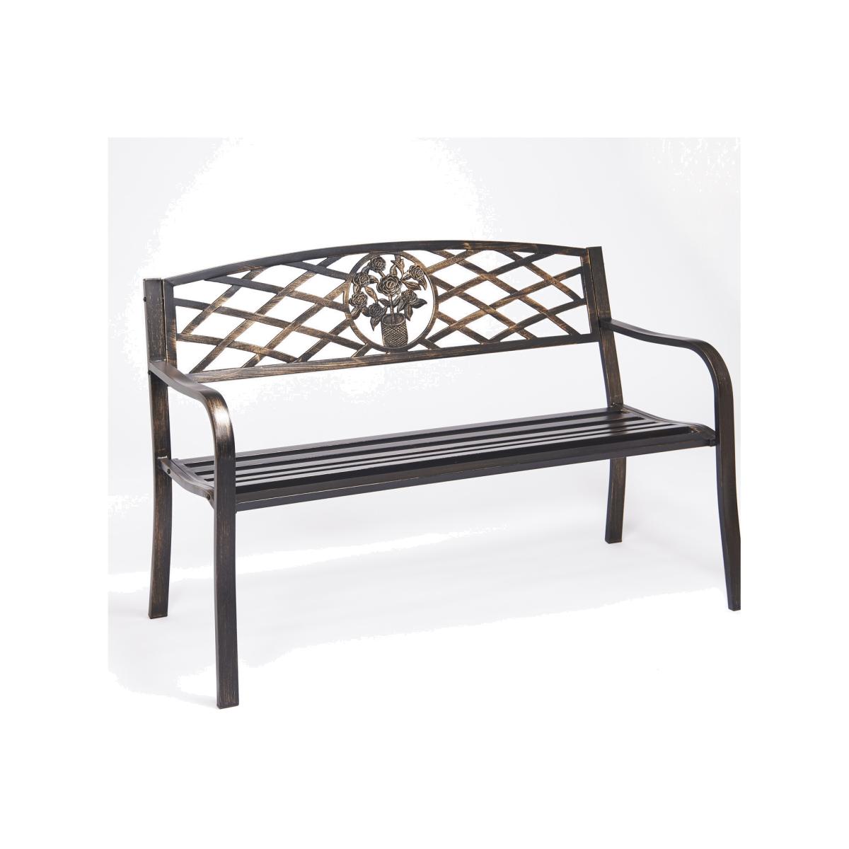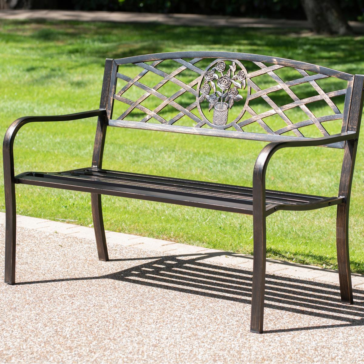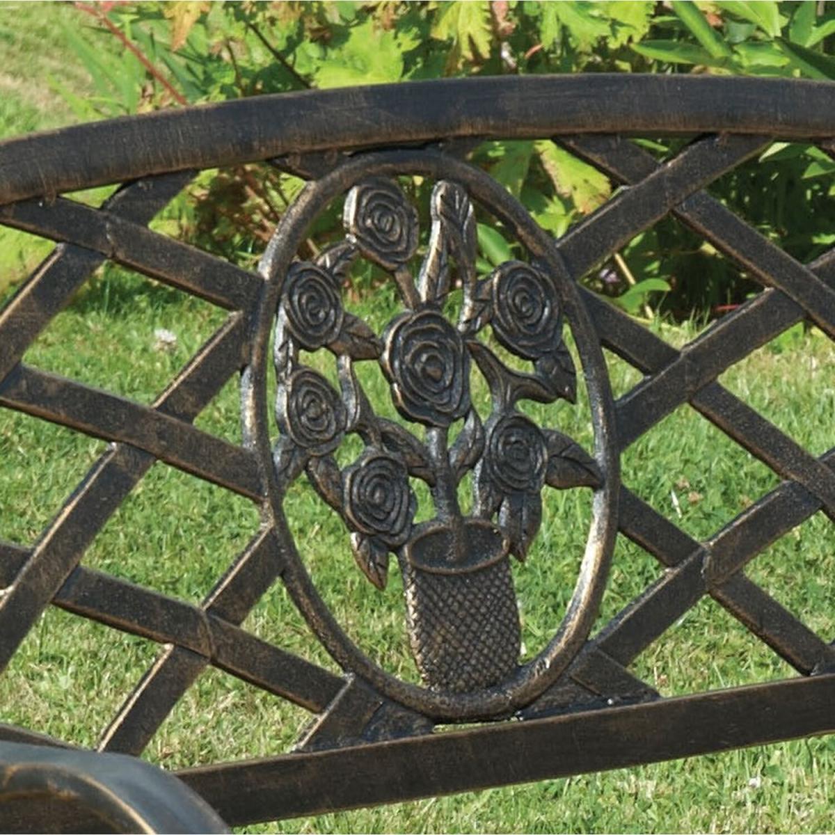 The Coalbrookdale garden Bench is crafted from sturdy steel tubing with a decorative cast iron backrest and a striking floral centrepiece. A generously proportioned 2-seater bench with a durable powder-coated antique bronze finish. easy home assembly.
